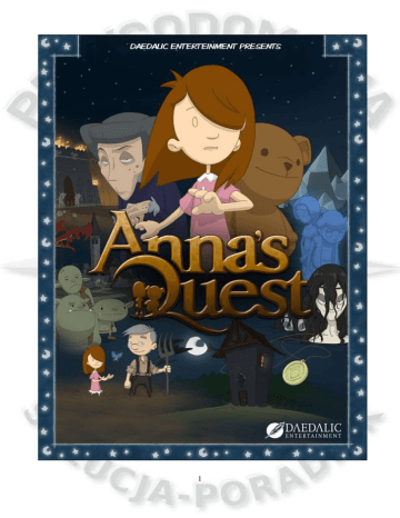 1 PORADNIK DO GRY Anna Quest Autor Urszula Data publikacji 29 wrzesień 2015 PrzygodoMania.pl Wszelkie prawa zastrzeżone Kopiowanie i rozpowszechnianie bez zgody jest zabronione! 2 Spis treści Rozdział I .............................................................................................................................. 4 Rozdział II ............................................................................................................................ 5 Rozdział III .........................................................................................................................12 Rozdział IV .........................................................................................................................21 Rozdział V...........................................................................................................................27 Rozdział VI .........................................................................................................................32 Zapoznaj się z prologiem, zdobywaj osiągnięcia oraz odszukaj wszystkie ukryte cukierki, a odblokujesz bonusy. 3 Rozdział I • Po rozmowie z dziadkiem trafisz do swojego pokoju. • Możesz przejść samouczek. • Zgodnie z podpowiedzią podejdź do drzwi. • Usiądź w czerwonym fotelu. • Rozmawiaj z czarownicą, wybierając dowolne odpowiedzi. • Kliknij PPM, a następnie LPM na miskę z zupą – nauczyłeś się telekinezy. • Użyj telekinezy na łyżce w ekwipunku. • Użyj zgiętej łyżki na kamerze. • Podejdź do pluszowego misia i porozmawiaj z nim na wszystkie tematy. • Podejdź do stolika i zabierz: nożyczki, niebieską kredkę. • Zagadnij do kubeczka z przyborami, a zdobędziesz żółtą farbę. • Użyj na misce z zupą telekinezy – zdobędziesz osiągnięcie „Fussy Eater” • Podejdź do lalki i użyj na niej kredki i farbki – zdobędziesz osiągnięcie – „Makeover”. • Podejdź do łóżka i kliknij na poduszkę, zabierz cukierka i poduszkę. • Podejdź do okna i podnieś piłkę. • Użyj na piłce w ekwipunku nożyczek. • Podejdź do jednorożca i użyj na rogu nożyczek. • Zabierz troszkę waty wypełniającej jednorożca. • Podejdź do urządzenia po prawej stronie okna i użyj na nim rogu. 4 • Z urządzenia nad fotelem wypadnie jakby kask, na którym użyj przeciętej piłki – nasza bohaterka dysponuje większą siłą. • Użyj telekinezy na kamerze i drzwiach. • Kliknij na wyjście, aby opuścić pokój – osiągnięcie „Escape Artist”. • Zejdź na dół i użyj telekinezy na drzwiach wyjściowych, gdzie widać czarownicę. Rozdział II • Zabierz obiektyw wbity w czerwony fotel. • Porozmawiaj z misiem na wszystkie tematy. 5 • Użyj na głośniku nad drzwiami telekinezy. • Obetnij czerwoną zasłonkę. • Spróbuj otworzyć skrzyneczkę przy drzwiach. • Wyjdź na korytarz. • Zabierz kapelusz czarownicy. • Zwróć uwagę na kabel sypiący iskrami. • Sprawdź zlew i zagadaj do śpiącego szczurka na belce u góry. • Zejdź niżej do głównego holu. • Spójrz na pofalowany dywan i go odwiń. • Zabierz śmierdzącą pleśń z kratki ściekowej. 6 • Kliknij na szkielet. • Podejdź do komody i sprawdź szuflady, zdobędziesz: sznurek, klucz z serduszkiem oraz przycisk do papieru. • Podejdź do kota w prawym dolnym ekranie – pokazuje pazury. • Połącz w ekwipunku: poduszkę, wypełniacz z waty oraz czerwoną zasłonkę. • Poduszką kliknij na kota i zabierz obrożę z diamentem. • Kliknij na obraz nad komodą i spróbuj wrócić na górę – drogę zastąpi nam duch. • Porozmawiaj z duchem na wszystkie tematy. • Wróć na górę i połącz pleśń z żółtą farbą. • Atrapę sera daj szczurkowi – zdobędziesz klucz. • Wejdź do pokoju i użyj klucza z serduszkiem na skrzynce obok drzwi. • Ze skrzynki zabierz uszkodzony dyktafon i połącz w ekwipunku z głośnikiem. • Kliknij na naprawiony dyktafon PPM odblokujesz osiągnięcie „Singstar”. • Wróć do głównego holu i zdobyty kluczyk użyj na portrecie – znajdziesz sejf. • Porozmawiaj z duchem, a dowiesz się jak otworzyć sejf. • Użyj dyktafonu na drzwiach, za którymi stoi czarownica. • Użyj na sejfie diamentu zabranego kotu oraz dyktafon. • Zabierz przedmioty znajdujące się w sejfie, odkryjesz czerwony przycisk. • Użyj czerwonego przycisku i zejdź na dół. • Porozmawiaj z lustrem na wszystkie tematy. • Ze stołu (dół ekranu) zabierz: złotą obrączkę: sprawdź książkę i czaszkę. 7 • Kliknij na kratkę ściekową obok. • Użyj na kratce ściekowej telekinezy – sprawdzisz, co jest w środku. • Użyj na palcach trzymających chustkę telekinezy – na pierwszym od lewej, na drugim i czwartym – chustka wpadnie do mazi. • Spróbuj użyć na chustce telekinezy – nie działa. • Połącz sznurek z łyżką w ekwipunku i użyj na chustce. • Przejdź do stolika obok okna i zabierz korek od butelki. • Kliknij na certyfikat z czerwoną pieczęcią PPM. • Przejdź do półki z książkami i przeczytaj je wszystkie - zdobędziesz osiągnięcie „Book Worm” oraz zabierzesz ze sobą książkę „Party Tricks”. • Sprawdź półkę poniżej. 8 • Zabierz cukierka ze słoika obok ekwipunku (prawy dolny róg ekranu). • Wróć na górę do czarownicy i zadaj pytanie dotyczące osoby z certyfikatu – zdobędziesz osiągnięcie „ „Little genius”. • Porozmawiaj z duchem. • Kliknij pierścieniem na ducha, po rozmowie zniknie. • Wróć do swojego pokoju. • Użyj chustki wyłowionej ze ścieków na łóżku. • Gdy dziewczynka zaśnie, zostanie przeniesiona do swego rodzinnego domu. • Porozmawiaj z dziadkiem. • Podejdź do stolika w dole ekranu i zabierz cukierka. • Kliknij na książkę znajdującą się nad kominkiem. • Po rozmowie i czytaniu książki przez dziadka ponownie trafisz do swojego pokoju. • Spróbuj porozmawiać z duche