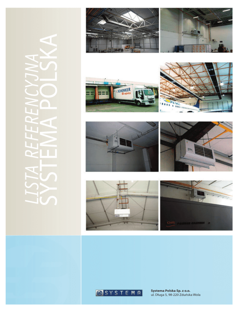 LISTA OBIEKTÓW Z URZĄDZENIAMI FIRMY SYSTEMA Albatros Aluminium Wałcz ALUPOL KĘTY Sp. z o.o. Tychy ALVAN POLSKA Końskie Andoria Andrychów AQUAEL Suwałki AVK Armadan Pniewy Baza Logistyczna Netto Kobylanka Baza PKS Sp. z o.o. Przemyśl Bio Active Ostrówek Black Red White - salon Meblowy Lublin Bosh Serwis Jarocin BRICO MARCHE Zielona Góra BRICO MARCHE Kluczbork Budvar Centrum Zduńska Wola Centrum Logistyczne NETTO Kobylanka k. Szczecina Centrum Ogrodnicze JUCCA Tarnowo Podgórne CENTRUM TARGOWE PTAK Rzgów k. Łodzi COLOROBBIA Polska Żarów Danfoss Poland Chwaszczno DPD Polska Stryków EFEKTOR Kielce EKO VITA Ukraina Elektromontaż Poznań Poznań EURO-TEKS Płock EUROPAPIER SONEVIX Łódź FAF POLSKA Zielona Góra Fokus Inowrocław Germaz Wrocław GREENEX Lwów (Ukraina) GRES CERAMIKA Kopaniny k. Końskich Hala Napraw Lokomotyw Tłuszcz HOLDING Sp. z o.o. - wykonawca inwestycji Poznań HUTA STALOWA WOLA Sp. z o.o. Zakład odlewniczy Stalowa Wola HZ Service Zawiercie ISPOL Kielce KIA LEE MOTORS Komorniki KOLPORTER S.A Warszawa KONSTALEX Sp. z o.o. Radomsko KRAKSERWIS Sp. z o.o. - Zakład Konstrukcji Stalowych Myślenice KROSS Sp. z o.o. Hurtownia rowerów Przasnysz Lubelska Fabryka Maszyn Rolniczych S.A. Lublin Matbet Sady k. Poznania MEGAPOL Bydgoszcz MIRPOL Białystok MOSTOSTAL S.A. Zakład konstrukcji stalowych Rudnik nad Sanem MYPOL Radom Norauto Sosnowiec, Łódź NORD COM S.A. Starachowice OBST S.A Chełm Odlewnie polskie - grupa Exbud Starachowice Pamar Glav Wałbrzych PAMAX Z.H.U. Ligota Dolna k. Kluczborka n n n n 1,2MW 5,5MW 424kW n/n/n n n 892kW n 110kW n 200kW / n n 270KW n n n n 88kW 151kW n 892kW n 1,2MW n n 1,8MW n n/n n 405kW n 224kW n 213kW n n 720 kW n 420kW / n 135kW n n n n n n n n 107kW 368kW 300kW 550kW 804kW 156kW 1,8MW n 1 MW n 545kW n n 360kW n 270kW n 686kW n 112kW n n n n 540kW 2,2MW n 602kW n 178kW n/ n n n n n 720kW 3 MW 360kW 103kW LISTA OBIEKTÓW Z URZĄDZENIAMI FIRMY SYSTEMA Panattoni Park (obiekt Huhtamaki 15.000 m²) Czeladź Panattoni Park Centrum Usług Logistycznych (10.000 m²) Gdańsk Panattoni Park Gliwice I - obiekt Decathlon Gliwice Panattoni Park Gliwice II - Bojkowska (hala Glaspol. Arteria) 10 000 m² Gliwice Panattoni Park Łódź East, hala A Hartmann Łódź Panattoni Park Łódź South - Birkart SGS Poland, Recticel. Komfort Snu Łódź Panattoni Park Mysłowice hale C, D (45.000 m²) Mysłowice Panattoni Park Mysłowice, hala G - Coca Cola (35.000 m²) Mysłowice Panattoni Park Mysłowice, hala E - Inter Marche (45.000 m²) Mysłowice Panattoni Park Ożarów (hala B Era i Loxxess, Hala C -Torfarm) Ożarów Panattoni Park Poznań I - obiekt H&M Poznań Panattoni Park Poznań II Gądki/Poznań (hala Torfarm) Gądki/Poznań Panattoni Park Stryków - Komfort, CEI Cosmetic Essence Poland Stryków Panattoni Park Toruń (Grębocin) - obiekt NESTLE Toruń (Grębocin) Parafia Rzymsko-Katolicka Chełmiec, Warta Patentus S.A. Pszczyna Pilkington IGP Szczecin PKP - hala napraw lokomotyw elektrycznych Skarżysko Kamienna PKP Zakład Taboru w Katowicach Katowice POLFLOAT SAINT GOBAIN POLSKA Sp.z o.o. Dąbrowa Górnicza PORTOS Kalisz PowerBike Dąbrowa k. Poznania PRESS GLASS Sp. z o.o. Poczesna PROGRESS - Wytwórnia Sit S.C. Furmanów Promag Koninko k. Poznania Saint-Gobain Sekurit HanGlass Polska Żary Saint Gobain Gliwice Samsung - magazyn wysokiego składowania Warszawa SKODA - Salon Inowrocław SOLVAY Automative Sp.z o.o. Lublin SORELPOL Chwałkowo k. Krobi STALEXPORT ODLEWNIA RUR S.A. Ostrowiec Świętokrzyski SUN GARDEN Sp. z o.o. Malanów SUPERMARKET NOMI Szczecin Tesco BTS Gliwice Towimor Toruń TUGEB-POLBUD Milicz-Sławoszowice WALMAR Pruszcz Gdański WAPPEX Słupce WKRĘT-MET P.P.H.U. Kuźnica Kiedrzyńska YAWAL System S.A. Częstochowa ZAKŁADY MECHANICZNE Białogard ZBYSZKO COMPANY Sp. z o.o. Radom ZREMB Wojkowice n promienniki rurowe INFRA n promienniki ceramiczne SCR n nagrzewnice powietrza EOLO Rooftop n destratyfikatory DS n nagrzewnice powietrza EOLO n pasy promieniujące OHA n konwektory gazowe KING n kurtyny powietrza SV n/n n n n n n n n n n/n n n n/n n n n n n n n 2 MW 500kW 560kW n n/n n n 2 MW / n 70kW 118kW n/n/n n n n n n n 52kW 675kW 370Kw n 392kW n 588kW n 188kW / n / n n/n n n 315kW n 450kW n/n n n n n n 580kW 850kW 315kW 414kW 450kW SYSTEMA POLSKA Sp. z o.o. SYSTEMA S.p.A. ul. Długa 5 98-220 Zduńska Wola POLSKA Tel.: +48 43 8247287 Faks: +48 43 8233064 Via S. Martino, 17/23 S.GIUSTINA IN COLLE PADOVA ITALIA Tel.: +39.049.9355663 Fax: +39.049.9355699 [email protected] www.systemapolska.pl [email protected] www.systema.it