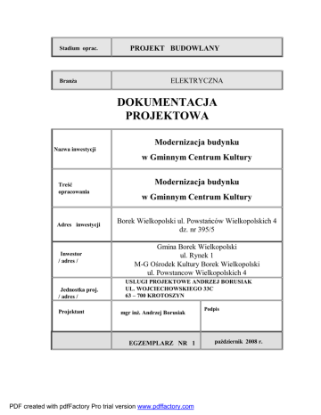 PROJEKT BUDOWLANY Stadium oprac. ELEKTRYCZNA Branża DOKUMENTACJA PROJEKTOWA Modernizacja budynku Nazwa inwestycji w Gminnym Centrum Kultury Modernizacja budynku Treść opracowania Adres inwestycji w Gminnym Centrum Kultury Borek Wielkopolski ul. Powstańców Wielkopolskich 4 dz. nr 395/5 Gmina Borek Wielkopolski ul. Rynek 1 M-G Ośrodek Kultury Borek Wielkopolski ul. Powstancow Wielkopolskich 4 Inwestor / adres / Jednostka proj. / adres / Projektant USLUGI PROJEKTOWE ANDRZEJ BORUSIAK UL. WOJCIECHOWSKIEGO 33C 63 – 700 KROTOSZYN mgr inż. Andrzej Borusiak Podpis EGZEMPLARZ NR 1 PDF created with pdfFactory Pro trial version www.pdffactory.com październik 2008 r. Opis techniczny instalacji elektrycznej Dokumentacja techniczna obejmuje projekt elektryczny “Modernizacji budynku w Gminnym Centrum Kultury” w miejscowości Borek Wielkopolski ul. Powstańców Wielkopolskich 4. Energia elektryczna używana będzie do celów: 3-faz, 1-fazowych i oświetlenia . W celu zasilania modernizowanych pomieszczeń należy wyprowadzić wewnętrzną linię zasilającą z istn. przyłącza pnapowietrznego z istniejącego złącza ZN/TL rzewodem YKY 5x16 długosci 5m do tablicy T1. Z tablicy T1 zasilić przewodem YDY długości 40 m tablicę T2 , długości 20 m tablicę T3, oraz przewodem YDY 5x4 długości 20m istniejącą rozdzielnię TK w piwnicy. Na ablicy T1 umieścić wyłącznik główny DPXI 125 z cewką wybijakową do której doprowadzić przewody z wyłączników p-poż znajdujących się przy kazdym z wejść. Na tablicach T2 iT3 zastosować dla wyłączenia rozłączniki FR304/100A. Dla ochrony od przepięć na tablicy T1 zastosować ochronniki przepięć stopień “B” i “C” natomiast na tablicach T2 i T3 stopień “C”. Tablicę T1-T3 wyposażyć zgodnie ze schematami . Ochronę przeciwporażeniową należy zrealizować zgodnie z PN-IEC-60364. Ochronę przed dotykiem bezpośrednim stanowi izolacja robocza , natomiast ochroną przed dotykiem pośrednim stanowi zainstalowanie wyłączników przeciwporażeniowych różnicowo-prądowych o czułości 30 mA i prądzie 40A i 25A osobne dla obwodów 3-fazowych, 1-fazowych i oświetlenia. Projektuje się układ sieciowy TN-S z oddzielnym przewodem ochronnym PE. Przewód ochronny uziemić do uziemienia o R< 10 ohm doprowadzonego na zewnątrz projktowanego budynku. Projektuje się wykonać połączenie wyrównawcze wewnątrz pralni bednarką FeZn 25x100. Przekrój przewodu wyrównawczego w pozostałych pomieszczeniachpowinen wynosić 10mm2 Cu . Przewody układać pod tynkiem. Instalację wykonać przewodami w podwójnej izolacji o napięciu 750V typu YDY5x10, DY10, YDY5x4, YDY5x2,5, YDY3x2,5, YDY4x1,5, YDY 3x1,5. Przekrój i typ przewodów podano na schematach tablic T1-T3. Oświetlenie zastosować zgodnie z rysunkami.Oprawy zastosowć typu: OOP1-236, OOP1-258, OPFa236, ONR1m 258, ONR1m 258 Aw, ONR 418, ONR 418 Aw, ONR 218, ONR 218Aw, PK109 , C100 oraz na zewnątrz lampami halogenowymi 100W każda.Oświetlenie ewakuacyjne wykonać oprawami OSF11 z inwerterem 2h.Wszystkie gniazda wykonać z bolcem PE . W zmywalni i w sanitariatach zastosować osprzęt hermetyczny. Dla ochrony p-poż zastosować centrakę CP do której doprowadzić sygnały z czujek dymu . Całość prac wykonać zgodnie z obowiązującymi przepisami i normami. Dla ochrony obiektu przed wyładowaniami atmosferycznymi należy wykonać instalację piorunochronną. Instalację wykonać w postaci zwodów poziomych umieszczonych bezpośrednio na obiekcie oraz zwodów pionowych. Zwody poziome, pionowe oraz przewody odprowadzające należy wykonać z drutu Fe-Zn o średnicy min. 8 mm. Wszystkie uziomy należy łączyć do ogólnego systemu uziomowego. Na około budynku wykonać otok bednarką ocynkowaną FeZn 25x4 ułożoną w ziemi na głębokości 0,8m . Otok winien być oddalony od zewnętrznej części budynku nie mniej niż 1 m . Przy wejściach bednarkę ocynkowaną ułożyć w rurze ochronnej pcv fi100 o łącznej grubości ścianki nie mniejszej niż 5 mm. Na przewodach odprowadzających winny być zainstalowane zaciski probiercze. Wypadkowa rezystancja uziemienia nie powinna przekraczać 10 Ohm. Złącza probiercze i połączenia zabezpieczyć przeciw korozji warstwą smaru. Całość prac wykonać zgodnie z obowiązującymi przepisami i normami. Schemat instalacji wg. rysunków 1-3 .Wykonawca zobowiązany jest wykonać wszelkie pomiary i zgłosić do odbioru technicznego. PDF created with pdfFactory Pro trial version www.pdffactory.com -3- Obliczenia elektryczne I. Zestawienie mocy szczytowej dla Tablicy T1. obwód D1 - 3-faz 3,5kW obwód D2 – D9 - 1-faz 13,0 kW obwód D10 – D14 – oświetlenie 6,5 kW PsT1 = kjx(Ps1+Ps2+Ps3) = 0,4x23,0 kW = 9,2 ~ 9,0 kW II. Zestawienie mocy szczytowej dla Tablicy T2. obwód D1 – D2 - 3-faz 11,5 kW obwód D3 – D10 - 1-faz 14,5 kW obwód D11 – D19 - oświetlenie 9,0 kW PsT2 = kjx(Ps1+Ps2+Ps3) = 0,3x35,0 kW = 10,5 kW III. Zestawienie mocy szczytowej dla Tablicy T3. obwód D1 – D4 3-faz 38,0 kW obwód D5 – D12 - 1-faz 14,0 kW obwód D5 – oświetlenie 2,0 kW PsT3 = kjx(Ps1+Ps2+Ps3) = 0,4x54,0 kW = 21,6 ~ 21,5 kW Ps = 0,8 x (PsT1+PsT2+PsT3) = 0,8x41,0 = 32,8 ~ 33 kW IV. Zestawienie mocy szczytowej dla Tablic T1-T3 oraz dobór elementów zasialnia. Ps 33000 Iszczytowy 3-faz = ------------------ = ------------------ = 51,83A 1,73xUxcosfi 1,73x400x0,92 Dobieram zabezpieczenie przedlicznikowe S 303 C63A Dobieram przewód zasilający YKY 5x16 o Idd=112A V. Sprawdzenie maksymalnego spadku napięcia w instalacji zasilającej i instalacji wewnętrznj - Złącze ZN/TL – Tablica T1 Ps=33,0 kW l=5m Y=54 S=16 33000x5x100 U% = ------------------- = 0,12 % 54x16x160000 PDF created with pdfFactory Pro trial version www.pdffactory.com -4- Tablica T1 – Tablica T2 Ps=10,5 kW l=40m Y=54 S=10 10500x40x100 U% = ------------------- = 0,49 % 54x10x160000 - Tablica T1 – Tablica T3 Ps=21,5 kW l=20m Y=54 S=10 21500x20x100 U% = ------------------- = 