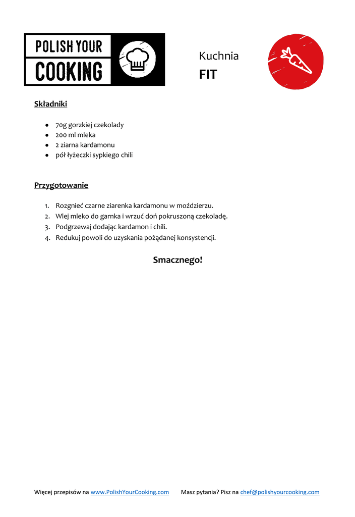 Kuchnia FIT Składniki ● 70g gorzkiej czekolady ● 200 ml mleka ● 2 ziarna kardamonu ● pół łyżeczki sypkiego chili Przygotowanie 1. 2. 3. 4. Rozgnieć czarne ziarenka kardamonu w moździerzu. Wlej mleko do garnka i wrzuć doń pokruszoną czekoladę. Podgrzewaj dodając kardamon i chili. Redukuj powoli do uzyskania pożądanej konsystencji. Smacznego! Więcej przepisów na www.PolishYourCooking.com Masz pytania? Pisz na [email protected]