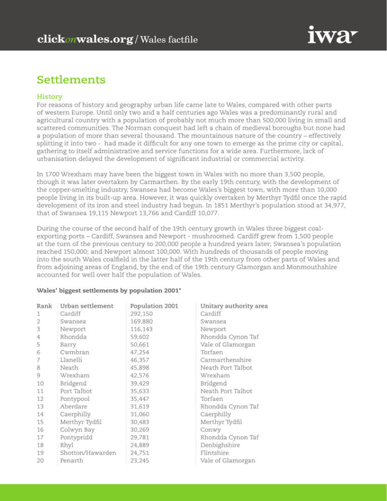 clickonwales.org / Wales factfile Settlements History For reasons of history and geography urban life came late to Wales, compared with other parts of western Europe. Until only two and a half centuries ago Wales was a predominantly rural and agricultural country with a population of probably not much more than 500,000 living in small and scattered communities. The Norman conquest had left a chain of medieval boroughs but none had a population of more than several thousand. The mountainous nature of the country – effectively splitting it into two - had made it difficult for any one town to emerge as the prime city or capital, gathering to itself administrative and service functions for a wide area. Furthermore, lack of urbanisation delayed the development of significant industrial or commercial activity. In 1700 Wrexham may have been the biggest town in Wales with no more than 3,500 people, though it was later overtaken by Carmarthen. By the early 19th century, with the development of the copper-smelting industry, Swansea had become Wales’s biggest town, with more than 10,000 people living in its built-up area. However, it was quickly overtaken by Merthyr Tydfil once the rapid development of its iron and steel industry had begun. In 1851 Merthyr’s population stood at 34,977, that of Swansea 19,115 Newport 13,766 and Cardiff 10,077. During the course of the second half of the 19th century growth in Wales three biggest coalexporting ports – Cardiff, Swansea and Newport - mushroomed. Cardiff grew from 1,500 people at the turn of the previous century to 200,000 people a hundred years later; Swansea’s population reached 150,000; and Newport almost 100,000. With hundreds of thousands of people moving into the south Wales coalfield in the latter half of the 19th century from other parts of Wales and from adjoining areas of England, by the end of the 19th century Glamorgan and Monmouthshire accounted for well over half the population of Wales. Wales’ biggest settlements by population 2001* Rank 1 2 3 4 5 6 7 8 9 10 11 12 13 14 15 16 17 18 19 20 Urban settlement Cardiff Swansea Newport Rhondda Barry Cwmbran Llanelli Neath Wrexham Bridgend Port Talbot Pontypool Aberdare Caerphilly Merthyr Tydfil Colwyn Bay Pontypridd Rhyl Shotton/Hawarden Penarth Population 2001 292,150 169,880 116,143 59,602 50,661 47,254 46,357 45,898 42,576 39,429 35,633 35,447 31,619 31,060 30,483 30,269 29,781 24,889 24,751 23,245 Unitary authority area Cardiff Swansea Newport Rhondda Cynon Taf Vale of Glamorgan Torfaen Carmarthenshire Neath Port Talbot Wrexham Bridgend Neath Port Talbot Torfaen Rhondda Cynon Taf Caerphilly Merthyr Tydfil Conwy Rhondda Cynon Taf Denbighshire Flintshire Vale of Glamorgan clickonwales.org / Wales factfile *Settlements in Wales by order of population according to the 2001 census data from the Office for National Statistics. These figures include only single settlements and urban subdivisions; they are not the population of local authority areas, electoral wards, or conurbations including more than one single urban area. Local authorities by population 2008 Estimates* Rank District 1 Cardiff 2 Rhondda Cynon Taf 3 Swansea 4 Carmarthenshire 5 Caerphilly 6 Flintshire 7 Newport 8 Neath Port Talbot 9 Bridgend 10 Wrexham 11 Powys 12 Vale of Glamorgan 13 Pembrokeshire 14 Gwynedd 15 Conwy 16 Denbighshire 17 Torfaen 18 Monmouthshire 19 Ceredigion 20 Blaenau Gwent 21 Anglesey 22 Merthyr Tydfil Source: Top40-charts.com Population 324,800 234,100 229,100 180,500 172,400 151,000 140,700 137,600 134,800 132,900 132,600 124,900 118,800 118,200 112,000 97,600 91,100 88,400 78,000 69,100 69,000 55,700 Style City and county County borough City and county County County borough County City and county County borough County borough County borough County County borough County County County borough County County borough County County County borough County County borough * The figures are mid-year estimates for 2008 from the Office for National Statistics. These authorities were established with local government reform in 1996. Although styled differently all enjoy the same powers. Local government in Wales before 1996 Counties and districts 1974–1996 County Authority Clwyd Dyfed Gwent Gwynedd Mid Glamorgan Powys South Glamorgan West Glamorgan District Authorities Alyn and Deeside · Colwyn · Delyn · Glyndŵr · Rhuddlan · Wrexham Maelor Carmarthen · Ceredigion · Dinefwr · Llanelli · Preseli Pembrokeshire · South Pembrokeshire Blaenau Gwent · Islwyn · Monmouth · Newport · Torfaen Aberconwy · Anglesey · Arfon · Dwyfor · Meirionnydd Cynon Valley · Merthyr Tydfil · Ogwr · Rhondda · Rhymney Valley · Taff-Ely Brecknock· Montgomeryshire · Radnorshire Cardiff · Vale of Glamorgan Lliw Valley · Neath · Port Talbot · Swansea clickonwales.org / Wales factfile Historic Counties of Wales County County Town Anglesey Llangefni Brecknockshire Brecon Caernarfonshire Caernarfon Cardiganshire Aberystwyth Carmarthenshire Carmarthen Denbighshire Denbigh Flintshire Mold Glamorganshire Cardiff Merionethshire Dolgellau Monmouthshire Newport Montgomeryshire Welshpool Pembrokeshire Haverfordwest Radnorshire Llandrindod Wells Source: Source: Top40-charts.com Historic County boroughs Cardiff Swansea Merthyr Tydfil Newport County Glamorgan Glamorgan Glamorgan Monmouthshire The Local Government Act 1888 established a new sort of borough – the county borough. These were designed to be ‘counties-to-themselves’; administrative divisions to sit alongside the new administrative counties. They allowed urban areas to be administered separately from the more rural areas. The smaller pre-existing municipal boroughs became part of the second tier of local government, below the administrative counties and county boroughs. The county boroughs were, like the municipal boroughs, abolished in 1974, being reabsorbed into their parent counties for administrative purposes. Charters conferring the largely honorary status o