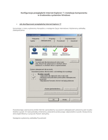 Konfiguracja przeglądarki Internet Explorer 7 i instalacja komponentu w środowisku systemów Windows • Jak skonfigurować przeglądarkę Internet Explorer 7? Korzystając z menu wybieramy Narzędzia, a następnie Opcje internetowe. Wybieramy zakładkę Zabezpieczenia: Pozostawiając zaznaczoną strefę Internet, sprawdzamy czy poziom zabezpieczeń ustawiony jest na jako Średnio-wysoki. W razie potrzeby zmieniamy ustawienia przesuwając odpowiednio suwak z lewej strony okna bądź klikamy w przycisk Poziom domyślny. Następnie wybieramy zakładkę Prywatność: Upewniamy się, że poziom zabezpieczeń znajduje się na poziomie średnim. Klikając na Zaawansowane sprawdzamy, że opcja "Zastąp automatyczną obsługę plików cookie" jest wyłączona: • Jak zainstalować komponent jeśli posiadam przeglądarkę Internet Explorer 7? Aby został on poprawnie pobrany niezbędne jest zalogowanie się do komputera przez Użytkownika z uprawnieniami Administratora. Przeglądarka internetowa powinna być skonfigurowana zgodnie z powyższymi informacjami. Po wpisaniu identyfikatora na stronie logowania Systemu Internetowego Banku BPH https://www.bph.pl/pi/do/Login i kliknięciu Dalej w górnej części okna przeglądarki pojawi się pasek informacji z komunikatem: "Ta witryna sieci Web chce zainstalować następujący dodatek: „SignActivX.cab” z „Bank BPH S.A.”. Jeśli ufasz tej witrynie oraz dodatkowi i chcesz go zainstalować, kliknij tutaj…” Należy zgodzić się na: - instalację formantu ActiveX…": - ponowne wyświetlenie strony klikając na przycisk Ponów próbę: - instalację oprogramowania o nazwie SignActivX.cab wybierając przycisk Zainstaluj: Poprawnie zainstalowany komponent sygnalizowany jest statusem OK: na dole z prawej strony okna przeglądarki po zalogowaniu do Systemu Internetowego Sez@m. Jeśli brakuje informacji "OK" oznacza to, że komponent nie jest poprawnie zainstalowany. • Czy komponent trzeba instalować po każdym zalogowaniu do systemu? Komponent instalowany jest tylko jeden raz. Po udanej instalacji nie ma potrzeby powtarzania tej czynności po każdym zalogowaniu do Systemu Internetowego Sez@m. • Jak ręcznie pobrać komponent jeśli nie pobrał się on automatycznie lub nie ma informacji, że KOMPONENT: OK? Aby wymusić ponowną instalację komponentu proszę postępować wg następującej procedury: 1. 2. 3. 4. Skonfigurować przeglądarkę zgodnie z zaleceniami. W górnym menu przeglądarki wybrać Narzędzia -> Opcje internetowe -> Ogólne -> Historia przeglądania/Ustawienia -> Przeglądaj obiekty -> a następnie usunąć plik SignActivX Control. Zamknąć całkowicie przeglądarkę Internet Explorer. Zalogować się ponownie do Systemu Internetowego - komponent powinien ściągnąć się ponownie.
