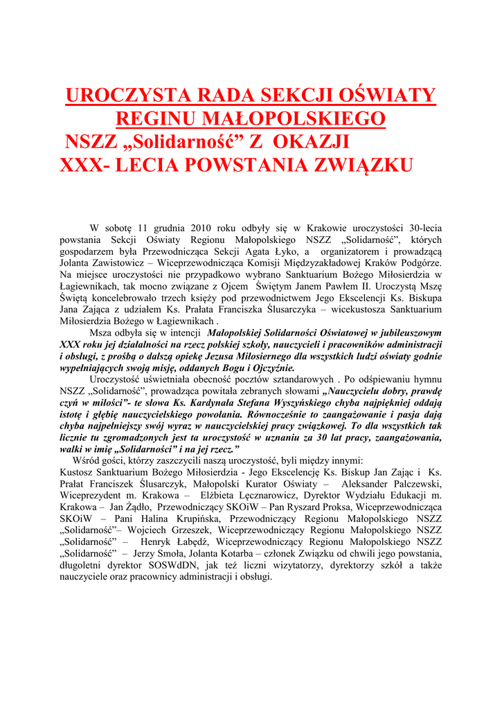 UROCZYSTA RADA SEKCJI OŚWIATY REGINU MAŁOPOLSKIEGO NSZZ „Solidarność” Z OKAZJI XXX- LECIA POWSTANIA ZWIĄZKU W sobotę 11 grudnia 2010 roku odbyły się w Krakowie uroczystości 30-lecia powstania Sekcji Oświaty Regionu Małopolskiego NSZZ „Solidarność”, których gospodarzem była Przewodnicząca Sekcji Agata Łyko, a organizatorem i prowadzącą Jolanta Zawistowicz – Wiceprzewodnicząca Komisji Międzyzakładowej Kraków Podgórze. Na miejsce uroczystości nie przypadkowo wybrano Sanktuarium Bożego Miłosierdzia w Łagiewnikach, tak mocno związane z Ojcem Świętym Janem Pawłem II. Uroczystą Mszę Świętą koncelebrowało trzech księży pod przewodnictwem Jego Ekscelencji Ks. Biskupa Jana Zająca z udziałem Ks. Prałata Franciszka Ślusarczyka – wicekustosza Sanktuarium Miłosierdzia Bożego w Łagiewnikach . Msza odbyła się w intencji Małopolskiej Solidarności Oświatowej w jubileuszowym XXX roku jej działalności na rzecz polskiej szkoły, nauczycieli i pracowników administracji i obsługi, z prośbą o dalszą opiekę Jezusa Miłosiernego dla wszystkich ludzi oświaty godnie wypełniających swoją misję, oddanych Bogu i Ojczyźnie. Uroczystość uświetniała obecność pocztów sztandarowych . Po odśpiewaniu hymnu NSZZ „Solidarność”, prowadząca powitała zebranych słowami „Nauczycielu dobry, prawdę czyń w miłości”- te słowa Ks. Kardynała Stefana Wyszyńskiego chyba najpiękniej oddają istotę i głębię nauczycielskiego powołania. Równocześnie to zaangażowanie i pasja dają chyba najpełniejszy swój wyraz w nauczycielskiej pracy związkowej. To dla wszystkich tak licznie tu zgromadzonych jest ta uroczystość w uznaniu za 30 lat pracy, zaangażowania, walki w imię „Solidarności” i na jej rzecz.” Wśród gości, którzy zaszczycili naszą uroczystość, byli między innymi: Kustosz Sanktuarium Bożego Miłosierdzia - Jego Ekscelencję Ks. Biskup Jan Zając i Ks. Prałat Franciszek Ślusarczyk, Małopolski Kurator Oświaty – Aleksander Palczewski, Wiceprezydent m. Krakowa – Elżbieta Lęcznarowicz, Dyrektor Wydziału Edukacji m. Krakowa – Jan Żądło, Przewodniczący SKOiW – Pan Ryszard Proksa, Wiceprzewodnicząca SKOiW – Pani Halina Krupińska, Przewodniczący Regionu Małopolskiego NSZZ „Solidarność”– Wojciech Grzeszek, Wiceprzewodniczący Regionu Małopolskiego NSZZ „Solidarność” – Henryk Łabędź, Wiceprzewodniczący Regionu Małopolskiego NSZZ „Solidarność” – Jerzy Smoła, Jolanta Kotarba – członek Związku od chwili jego powstania, długoletni dyrektor SOSWdDN, jak też liczni wizytatorzy, dyrektorzy szkół a także nauczyciele oraz pracownicy administracji i obsługi. Goście w swoich wystąpieniach zwracali uwagę na historię oraz dobrze układającą się współpracę z naszym Związkiem, podkreślając, że właściwy dialog społeczny dobrze służy małopolskiej oświacie. W swoim przemówieniu Pani Prezydent miasta Krakowa podkreślała zasługi poprzedniego przewodniczącego Sekcji – Wojciecha Kotarby, a na zakończenie swojego wystąpienia wezwała zebranych do uczczenia jego pamięci minutą ciszy. Wyróżniających się nauczycieli Medalem Komisji Edukacji Narodowej odznaczył Małopolski Kurator Oświaty, a związkowców wyróżnionych 38 złotymi i 99 srebrnymi odznakami SKOiW Przewodniczący SKOiW – Ryszard Proksa. Medale 30- lecia Regionu Małopolskiego otrzymali Stefan Kubowicz oraz pośmiertnie przewodniczący Sekcji Oświaty Regionu Małopolskiego Wanda Żychowska oraz Wojciech Kotarba . Dodatkowo, aby uhonorować Stefana Kubowicza Honorowego Przewodniczącego SKOiW medalem przyznanym mu przez Sekcję Oświaty Regionu Mazowsze do Krakowa przyjechała z Warszawy Halina Kurpińska. Przedstawiciel krakowskiego Oddziału IPN – Pani Elżbieta Jakimek – Zapart nawiązując w swojej wypowiedzi do współpracy z Małopolską Sekcją Oświaty przy organizacji konkursów historycznych, podziękowała Przewodniczącej Sekcji Agacie Łyko za wspólną organizację konkursu historyczno – plastycznego pod nazwą „Ty i ja wędrujemy szlakiem wiary, nadziei, tęsknoty czyli historia Solidarności w oczch dziecka” Do klimatu wspomnień nawiązywała zarówno scenografia jak też sama część artystyczna – utrzymana w konwencji podróży do lat osiemdziesiątych, kiedy to tworzyła się „Solidarność”. Słowa wierszy i piosenek były wspaniałą okazją do refleksji nad historią naszego Związku i równocześnie drogowskazem dla przyszłych działań. Refren niektórych pieśni sala śpiewała razem z występującymi Oprawę artystyczną uroczystości przygotowali uczniowie małopolskich placówek oświatowych z Państwowej Szkoły Muzycznej I Stopnia im. Majora Hieronima Henryka Baranowskiego przy SOSW dla Dzieci Niewidomych i Słabowidzących w Krakowie, Szkoły Muzycznej nr 3 w Krakowie, Zespołu Szkół Chemicznych w Krakowie i Szkoły Podstawowej nr 2 w Wieliczce, Szkoły Podstawowej i Gimnazjum w Gołkowicach. Owacją na stojąco podziękowano młodym artystom, których występ był dla wszystkich silnym przeżyciem emocjonalnym. Wśród obecnych na sali widać było łzy wzruszenia. Szczególne podziękowania otrzymała nasza koleżanka Małgorzata Bała, nauczyciel Szkoły Muzycznej I Stopnia przy SOSW dla Dzieci Niewidomych i Niedowidzących za przygotowanie i zaprezentowanie z młodzieżą wspaniałego programu artystycznego. opr. J. Zawistowicz K. Ryblewska-Marewicz Sekcja Oświaty Regionu Małopolskiego