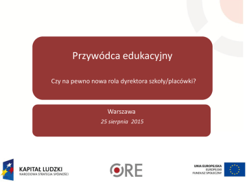 Przywódca edukacyjny Czy na pewno nowa rola dyrektora szkoły/placówki? Warszawa 25 sierpnia 2015 Czym zajmuje się dyrektor? KIM jest dyrektor? Z KIM jest dyrektor? a może KTO jest przeciw dyrektorowi? ? Szkoła upodabniająca się do życia? czy Kluczowe pytanie: Jaka szkoła? Życie porządkujące się wg modelu szkolnego? a może Szkołą ostoją porządku i stabilizacji ? Wyzwania a edukacja A. GLOBALNE : • • • • • • • Zmiany klimatyczne Społeczne i ekonomiczne nierówności Walka o zasoby i permanentny kryzys ekonomiczny Rozbieżność między tymi, którzy „dają radę” i „nie dają” Naruszane wolności i radykalne ideologie, ksenofobia Trudne efekty odkryć naukowych Więcej wykształconych, ale słabo opłacanych pracowników (edukacja, praca, życie) Wyzwania a edukacja B. Lokalne: • przeregulowania • ukryte lub nieczytelne komunikaty • sprzeczne komunikaty • wielość celów Wyzwania dla przywództwa – • nieprawdziwe lub kwestionowane komunikaty czytelne przepisy, bezpieczne • specyfika lokalna • nieznana droga warunki • bezpieczna droga, ale … Dyrektor - modele  Autokrata czy przywódca partycypacyjny?  Autonomiczny czy podległy?  Kreator czy wykonawca? …………………………………………………..  Przywódca czy lider? Próba odpowiedzi Przywództwo to umiejętność wyzwalania w innych zdolności do wykonywania zadań jak najlepiej, z poczuciem sensowności, godności, szacunku dla innych i zadowolenia. Przywódca edukacyjny • • • • • • • • Koncentruje się na uczeniu, zachęca do wykorzystania potencjału Niekoniecznie ma wizję, ale wspólnie ją tworzy Ma wiedzę ważną dla projektowania sytuacji sprzyjających uczeniu się Dzieli się przywództwem/władzą i pomaga innym uwierzyć w siebie Buduje relacje, sojusze, sieci Docenia i umie pracować z różnorodnością Krytycznie myśli o kontekście (lokalnym i globalnym) Jest profesjonalistą to przywódca partycypacyjny Przywództwo i zarządzanie w oświacie- opracowanie i wdrożenie systemu kształcenia i doskonalenia dyrektorów szkół/placówek Rezultaty projektu: - 3 podręczniki dla realizatorów kształcenia i doskonalenia kadry kierowniczej oświaty (dla kandydatów, dyrektorów I kadencji i doświadczonych) – zostaną opublikowane na stronach UJ i ORE w pierwszych dniach września), - model coachingu dyrektorskiego – materiały zostaną opublikowane na stronie UJ i ORE w pierwszych dniach września 2015, - 5 raportów nt. kompetencji i kształcenia i doskonalenia kadry kierowniczej oświaty w Polsce , krajach UE i USA – 3 opublikowane na stronie UJ i ORE, 2 zostaną opublikowane w pierwszych dniach września , - rekomendacje dla zmiany kursu kwalifikacyjnego dla kierowniczej kadry oświatowej – przesłane do MEN, - rekomendacje do zmian w statusie dyrektora, profilu kompetencyjnym oraz wspieraniu rozwoju dyrektorów szkół i placówek – zostaną poddane konsultacjom we wrześniu i październiku. Przywództwo i zarządzanie w oświacie- opracowanie i wdrożenie systemu kształcenia i doskonalenia dyrektorów szkół/placówek       Zapraszamy do skorzystania z naszych publikacji: relacja z kwietniowej konferencji przywództwa: http://tiny.pl/gxs7j strona UJ poświęcona przywództwu: http://www.przywodztwoedukacyjne.edu.pl strona informacyjna projektu: http://www.ore.edu.pl/projektyue/projekty-systemowe/przywodztwo strona ORE poświęcona zarządzaniu szkołą: http://www.ore.edu.pl/zarzadzanie-szkola biblioteczka dyrektora szkoły: http://www.ore.edu.pl/biblioteczkadyrektora-szkoly-placowki/przywodztwo przepisy prawa: http://www.ore.edu.pl/zarzadzanie-szkola/4437prawo Przywództwo i zarządzanie w oświacie- opracowanie i wdrożenie systemu kształcenia i doskonalenia dyrektorów szkół/placówek Co jeszcze: - do szkół i przedszkoli wysyłane są pakiety publikacji nt. przywództwa: -we wrześniu i październiku powstanie min. 10 przykładowych programów wsparcia wykorzystujących materiały z podręczników, -w październiku zrealizujemy 8 seminariów z placówkami doskonalenia nauczycieli nt. praktycznych aspektów realizowania wsparcia z wykorzystaniem podręczników. Dziękuję za uwagę [email protected]