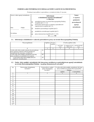 FORMULARZ INFORMACJI O DZIAŁALNOŚCI AGENCJI ZATRUDNIENIA Przekazać marszałkowi województwa w terminie do dnia 31 stycznia Nazwa i adres agencji zatrudnienia Numer Informacja o działalności agencji zatrudnienia1) w zakresie: w rejestrze podmiotów pośrednictwa pracy na terenie Rzeczypospolitej Polskiej (wypełnić pkt 1.1 i 1.2) kierowania osób do pracy za granicą u pracodawców zagranicznych (wypełnić pkt 1.3) Data Podpis ..................... ...................... prowadzących agencje zatrudnienia doradztwa personalnego (wypełnić pkt 2) poradnictwa zawodowego (wypełnić pkt 3) Nr telefonu ............................ pracy tymczasowej (wypełnić pkt 4.1 i 4.2) ................................................ za ......... rok 1.1. Informacja o działalności w zakresie pośrednictwa pracy na terenie Rzeczypospolitej Polskiej Wyszczególnienie 0 Liczba osób, które zostały wpisane do prowadzonej przez agencję ewidencji osób poszukujących zatrudnienia lub innej pracy zarobkowej Liczba osób, które podjęły zatrudnienie lub inną pracę zarobkową za pośrednictwem agencji w tym liczba osób, które podjęły pracę na podstawie stosunku pracy Ogółem 1 W tym kobiety 2 Z liczby ogółem osoby do 25 roku Ŝycia między 25 a 50 rokiem Ŝycia powyŜej 50 roku Ŝycia 3 4 5 01 02 03 1.2. Osoby, które podjęły zatrudnienie lub inną pracę zarobkową za pośrednictwem agencji zatrudnienia na terenie Rzeczypospolitej Polskiej - wg grup elementarnych zawodów2) Lp. Nazwa grupy elementarnej zawodów2) Czterocyfrowy symbol grupy elementarnej zawodów2) 0 1 2 1 2 3 4 5 6 7 8 9 10 11 12 13 14 153) Liczba osób, które podjęły zatrudnienie lub inną pracę zarobkową na terenie Rzeczypospolitej Polskiej ogółem w tym kobiety 3 4 1.3. Informacja o działalności pośrednictwa pracy w zakresie kierowania osób do pracy za granicą u pracodawców zagranicznych - wg grup elementarnych zawodów2) Lp. Nazwa państwa 0 1 1 ............. Nazwa grupy elementarnej zawodów2), w której osoby podjęły pracę w danym państwie 2 Czterocyfrowy symbol grupy elementarnej zawodów2) 3 01 02 03 04 05 06 07 08 09 10 11 12 13 14 15 16 17 18 19 203) ... Ogółem w danym państwie 2 4) ............. 01 02 03 04 05 06 07 08 09 10 11 12 13 14 15 16 17 18 19 203) ... Ogółem w danym państwie ... ... Ogółem we wszystkich państwach Liczba osób, które podjęły pracę za granicą u pracodawców zagranicznych ogółem w tym kobiety 4 5 z liczby ogółem osoby, które podjęły pracę na okres do 3 miesięcy od 3 do 12 powyŜej 12 miesięcy miesięcy ogółem w tym kobiety ogółem w tym kobiety ogółem w tym kobiety 6 7 8 9 10 11 2. Informacja o działalności w zakresie doradztwa personalnego Pracodawcy korzystający z usług agencji doradztwa personalnego Ogółem 0 Liczba pracodawców korzystających z usług w zakresie prowadzenia analizy zatrudnienia u pracodawców, określania kwalifikacji pracowników i ich predyspozycji oraz innych cech niezbędnych do wykonywania określonej pracy Liczba pracodawców korzystających z usług w zakresie wskazywania źródeł i metod pozyskiwania kandydatów na określone stanowiska pracy Liczba pracodawców korzystających z usług w zakresie weryfikacji kandydatów pod względem oczekiwanych kwalifikacji i predyspozycji 1 01 02 03 3. Informacja o działalności agencji poradnictwa zawodowego Wyszczególnienie Ogółem W tym kobiety 0 Liczba osób korzystających z pomocy w wyborze odpowiedniego zawodu i miejsca zatrudnienia Liczba osób korzystających z informacji niezbędnych do podejmowania decyzji zawodowych w szczególności o zawodach, rynku pracy oraz moŜliwościach szkolenia i kształcenia Liczba osób korzystających z grupowych porad zawodowych, zajęć aktywizujących w zakresie pomocy w aktywnym poszukiwaniu pracy Liczba pracodawców korzystających z pomocy w doborze kandydatów do pracy, w szczególności z udzielanej informacji i doradztwa w tym zakresie 1 2 Z liczby ogółem osoby do 25 roku Ŝycia między 25 a 50 rokiem Ŝycia powyŜej 50 roku Ŝycia 3 4 5 01 02 03 04 4.1. Informacja o działalności w zakresie pracy tymczasowej Wyszczególnienie Ogółem 0 Liczba osób skierowanych przez agencję zatrudnienia do wykonywania pracy tymczasowej z tego zatrudnionych w agencji zatrudnienia na podstawie umowy o pracę na czas określony i umowy o pracę na czas wykonania określonej pracy niebędących pracownikami agencji zatrudnienia, skierowanych na podstawie umowy prawa cywilnego Liczba godzin przepracowanych przez osoby skierowane przez agencję zatrudnienia do wykonywania pracy tymczasowej z liczba godzin przepracowanych przez tego osoby skierowane na podstawie umowy o pracę na czas określony i umowy o pracę na czas wykonania określonej pracy liczba godzin przepracowanych przez osoby niebędące pracownikami agencji zatrudnienia, skierowane na podstawie umowy prawa cywilnego Liczba pracodawców uŜytkowników korzystających z usług agencji zatrudnienia w tym liczba zagranicznych pracodawców uŜytkowników 1 01 02 03 04 05 06 07 08 W tym Z liczby ogółem osoby kobiety do 25 roku między 25 powyŜej skierowane do Ŝycia a 50 rokiem 50 roku zagranicznych Ŝycia Ŝycia pracodawców uŜytkowników 2 3 4 5 6 4.2. Osoby skierowane przez agencję zatrudnienia do wykonywania pracy tymczasowej w poszczególnych państwach - wg grup elementarnych zawodów2) Lp. Nazwa państwa 0 1 1 Rzeczpospolita Polska Nazwa grupy elementarnej zawodów2), w której osoby zostały skierowane do pracy tymczasowej w danym państwie 2 Czterocyfrowy symbol grupy elementarnej zawodów2) 3 Liczba osób skierowanych do pracy tymczasowej ogółem w tym kobiety 4 5 z liczby ogółem osoby skierowane na okres do 3 miesięcy od 3 do 12 powyŜej 12 miesięcy miesięcy ogółem w tym ogółem w tym ogółem w tym kobiety kobiety kobiety 6 7 8 9 10 11 01 02 03 04 05 06 07 08 09 10 11 12 13 14 15 16 17 18 19 203) ... Ogółem w danym państwie 2 4) ............. 01