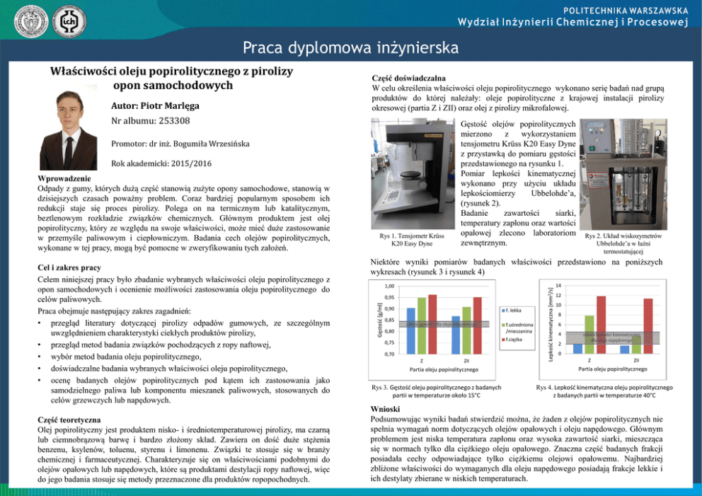 Praca dyplomowa inżynierska Autor: Piotr Marlęga Część doświadczalna W celu określenia właściwości oleju popirolitycznego wykonano serię badań nad grupą produktów do której należały: oleje popirolityczne z krajowej instalacji pirolizy okresowej (partia Z i ZII) oraz olej z pirolizy mikrofalowej. Nr albumu: 253308 Promotor: dr inż. Bogumiła Wrzesińska Rok akademicki: 2015/2016 Cel i zakres pracy Celem niniejszej pracy było zbadanie wybranych właściwości oleju popirolitycznego z opon samochodowych i ocenienie możliwości zastosowania oleju popirolitycznego do celów paliwowych. Praca obejmuje następujący zakres zagadnień: • przegląd literatury dotyczącej pirolizy odpadów gumowych, ze szczególnym uwzględnieniem charakterystyki ciekłych produktów pirolizy, • przegląd metod badania związków pochodzących z ropy naftowej, • wybór metod badania oleju popirolitycznego, • doświadczalne badania wybranych właściwości oleju popirolitycznego, • ocenę badanych olejów popirolitycznych pod kątem ich zastosowania jako samodzielnego paliwa lub komponentu mieszanek paliwowych, stosowanych do celów grzewczych lub napędowych. Część teoretyczna Olej popirolityczny jest produktem nisko- i średniotemperaturowej pirolizy, ma czarną lub ciemnobrązową barwę i bardzo złożony skład. Zawiera on dość duże stężenia benzenu, ksylenów, toluenu, styrenu i limonenu. Związki te stosuje się w branży chemicznej i farmaceutycznej. Charakteryzuje się on właściwościami podobnymi do olejów opałowych lub napędowych, które są produktami destylacji ropy naftowej, więc do jego badania stosuje się metody przeznaczone dla produktów ropopochodnych. Rys 1. Tensjometr Krüss K20 Easy Dyne Rys 2. Układ wiskozymetrów Ubbelohde’a w łaźni termostatującej Niektóre wyniki pomiarów badanych właściwości przedstawiono na poniższych wykresach (rysunek 3 i rysunek 4) 1,00 14 12 10 8 6 4 2 0 0,95 Gęstość [g/ml] Wprowadzenie Odpady z gumy, których dużą część stanowią zużyte opony samochodowe, stanowią w dzisiejszych czasach poważny problem. Coraz bardziej popularnym sposobem ich redukcji staje się proces pirolizy. Polega on na termicznym lub katalitycznym, beztlenowym rozkładzie związków chemicznych. Głównym produktem jest olej popirolityczny, który ze względu na swoje właściwości, może mieć duże zastosowanie w przemyśle paliwowym i ciepłowniczym. Badania cech olejów popirolitycznych, wykonane w tej pracy, mogą być pomocne w zweryfikowaniu tych założeń. Gęstość olejów popirolitycznych mierzono z wykorzystaniem tensjometru Krüss K20 Easy Dyne z przystawką do pomiaru gęstości przedstawionego na rysunku 1. Pomiar lepkości kinematycznej wykonano przy użyciu układu lepkościomierzy Ubbelohde’a, (rysunek 2). Badanie zawartości siarki, temperatury zapłonu oraz wartości opałowej zlecono laboratoriom zewnętrznym. Z 0,90 0,85 zakres zakresgęstości gęstościdla dlaoleju olejunapędowego napędowego 0,80 f. lekka f.uśredniona /mieszanina f.ciężka 0,75 0,70 Z ZII Partia oleju popirolitycznego Rys 3. Gęstość oleju popirolitycznego z badanych partii w temperaturze około 15°C Lepkość kinematyczna [mm2/s] Właściwości oleju popirolitycznego z pirolizy opon samochodowych 14 12 10 8 6 4 kinematycznej zakres lepkości kinematycznej zakres lepkości dla oleju napędowego dla oleju napędowego 2 0 Z ZII Partia oleju popirolitycznego Rys 4. Lepkość kinematyczna oleju popirolitycznego z badanych partii w temperaturze 40°C Wnioski Podsumowując wyniki badań stwierdzić można, że żaden z olejów popirolitycznych nie spełnia wymagań norm dotyczących olejów opałowych i oleju napędowego. Głównym problemem jest niska temperatura zapłonu oraz wysoka zawartość siarki, mieszcząca się w normach tylko dla ciężkiego oleju opałowego. Znaczna część badanych frakcji posiadała cechy odpowiadające tylko ciężkiemu olejowi opałowemu. Najbardziej zbliżone właściwości do wymaganych dla oleju napędowego posiadają frakcje lekkie i ich destylaty zbierane w niskich temperaturach.