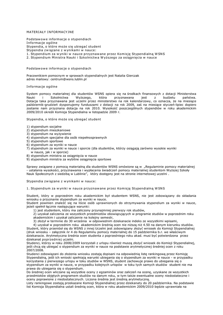 MA TERI A ŁY I N FOR MA CY JN E P odstaw o w e inform acje o styp endiach I nformacje ogólne Stypendia, o które może s ię ub iegać student Stypendia z w iązane z w ynikam i w nauce: 1. Stypend ium za w ynik i w nau ce p rzyznaw ane przez Komisję Stypendialną W SN S 2. Stypend ium Ministra N auki i Szko lnictw a W yższego za osiągnię cia w nauce P odstaw o w e inform acje o styp endiach Pracownikiem pomocnym w sprawach stypendialnych jest Natalia Gierczak adres mailowy: [email protected] I nformacje ogólne System pomocy materialnej dla studentów WSNS opiera się na środkach finansowych z dotacji Ministerstwa Nauki i Szkolnictwa Wyższego, która przyznawana jest z budżetu państwa. Dotacja taka przyznawana jest uczelni przez ministerstwo na rok kalendarzowy, co oznacza, że na miesiące październikgrudzień dysponujemy funduszami z dotacji na rok 2009, zaś na miesiące styczeńlipiec dopiero zostanie nam przyznana dotacja na rok 2010. Wysokość poszczególnych stypendiów w roku akademickim 2009/2010 określi Komisja Stypendialna w listopadzie 2009 r. Stypendia, o które może s ię ub iegać student 1) stypendium socjalne 2) stypendium mieszkaniowe 3) stypendium na wyżywienie 4) stypendium specjalne dla osób niepełnosprawnych 5) stypendium sportowe 6) stypendium za wyniki w nauce 7) stypendium za wyniki w nauce i sporcie (dla studentów, którzy osiągają zarówno wysokie wyniki w nauce, jak i w sporcie) 8) stypendium ministra za osiągnięcia w nauce 9) stypendium ministra za wybitne osiągnięcia sportowe Sprawy związane z pomocą materialną dla studentów WSNS omówione są w „Regulaminie pomocy materialnej ustalania wysokości, przyznawania i wypłacania świadczeń pomocy materialnej studentom Wyższej Szkoły Nauk Społecznych z siedzibą w Lublinie”, który dostępny jest na stronie internetowej uczelni . Stypendia z w iązane z w ynikam i w nauce: 1. Stypend ium za w ynik i w nau ce p rzyznaw ane przez Komisję Stypendialną W SN S Student, który w poprzednim roku akademickim był studentem WSNS, nie jest zobowiązany do składania wniosku o przyznanie stypendium za wyniki w nauce. Student powinien znaleźć się na liście osób uprawnionych do otrzymywania stypendium za wyniki w nauce, jeżeli spełnił łącznie następujące warunki: 1) jest studentem, który ma zaliczony przynajmniej pierwszy rok studiów, 2) uzyskał zaliczenia ze wszystkich przedmiotów obowiązujących w programie studiów w poprzednim roku akademickim i uzyskał zaliczenie na kolejny semestr, 3) złożył w terminie do 30 września w odpowiednim dziekanacie indeks ze wszystkimi wpisami, 4) uzyskał w poprzednim roku akademickim średnią ocen nie niższą niż 4.50 na danym kierunku studiów. Student, który przeniósł się do WSNS z innej Uczelni jest zobowiązany złożyć wniosek do Komisji Stypendialnej (druk wniosku – załącznik nr 4 do Regulaminu pomocy materialnej do 15 października b.r. we właściwym dziekanacie. Arytmetyczna średnia ocen studenta z poprzedniego roku akad. musi być potwierdzona przez dziekanat poprzedniej uczelni. Studenci, którzy w roku 2008/2009 korzystali z urlopu również muszą złożyć wniosek do Komisji Stypendialnej, jeśli chcą się ubiegać o stypendium za wyniki w nauce na podstawie arytmetycznej średniej ocen z roku 2007/2008. Studenci zobowiązani do złożenia wniosku zostają dopisani na odpowiednią listę rankingową przez Komisję Stypendialną, jeśli ich wnioski spełniają warunki ubiegania się o stypendium za wyniki w nauce w przypadku korzystania z pierwszego urlopu w toku studiów w WSNS, student zachowuje prawo do ubiegania się o stypendium za wyniki w nauce, w przypadku kolejnych urlopów w toku tych samych studiów student nie ma prawa do ubiegania się o stypendium. Do średniej ocen wliczane są wszystkie oceny z egzaminów oraz zaliczeń na ocenę, uzyskane ze wszystkich przedmiotów objętych programem studiów na danym roku, w tym także ewentualne oceny niedostateczne i oceny poprawione z niedostatecznych. Liczona średnia jest średnią arytmetyczną. Listy rankingowe zostają przekazane Komisji Stypendialnej przez dziekanaty do 20 października. Na podstawie list Komisja Stypendialna ustali średnią ocen, która w roku akademickim 2009/2010 będzie uprawniała na danym kierunku do otrzymania stypendium za wyniki w nauce. Komisja Stypendialna na stronie internetowej w „Stypendia i kredyty” ogłasza po 20 października listy rankingowe studentów ubiegających się o stypendium za wyniki w nauce w celu weryfikacji średnich ocen. Listy zawierają tylko nr indeksu studenta i jego średnią ocen. Student jest zobowiązany sprawdzić się na ogłoszonych listach i najpóźniej w ciągu 7 dni zgłosić ewentualne zastrzeżenia co do wysokości swojej średniej lub braku swojego nr indeksu na liście w odpowiednim dziekanacie. Po weryfikacji ponownie są ogłaszane listy rankingowe osób ubiegających się o stypendium, listy te są ostateczne i na ich podstawie komisja przyznaje stypendia. Decyzja administracyjna o przyznaniu stypendium zostaje wysłana studentowi na jego adres zamieszkania listem za potwierdzeniem odbioru. 2. Stypend ium Ministra N auki i Szko lnictw a W yższego za osiągnię cia w nauce Student ubiegający się o stypendium ministra za osiągnięcia w nauce powinien złożyć wniosek o stypendium – w dziekanacie, na druku przygotowanym przez ministerstwo (druk do pobrania na stronie internetowej). • Wniosek po pozytywnym zaopiniowaniu przez senat WSNS zostaje przesłany do ministerstwa • Wnioski składane są we wrześniu. Na rok 2009/2010 wnioski należy składać do 19 września. • Prawo do ubiegania się o to stypendium uzyskuje student po zaliczeniu pierwszego roku studiów, a podstawą do ubiegania się o stypendium jest: średnia ocen z całego toku studiów nie niższa niż 4,5 liczne osiągnięcia naukowe i aktywność naukowa, którą student powinien się wykazać 