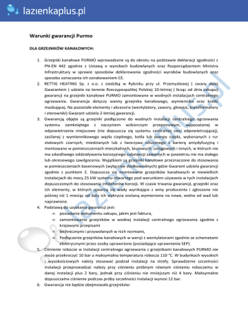 Warunki gwarancji Purmo DLA GRZEJNIKÓW KANAŁOWYCH: 1. Grzejniki kanałowe PURMO wprowadzane są do obrotu na podstawie deklaracji zgodności z PN-EN 442 zgodnie z Ustawą o wyrobach budowlanych oraz Rozporządzeniem Ministra Infrastruktury w sprawie sposobów deklarowania zgodności wyrobów budowlanych oraz sposobu oznaczania ich oznakowaniem CE. 2. RETTIG HEATING Sp. z o.o. z siedzibą w Rybniku przy ul. Przemysłowej ( zwany dalej Gwarantem ) udziela na terenie Rzeczypospolitej Polskiej 10-letniej ( licząc od dnia zakupu) gwarancji na grzejniki kanałowe PURMO zamontowane w wodnych instalacjach centralnego ogrzewania. Gwarancja dotyczy wanny grzejnika kanałowego, wymiennika oraz kratki maskującej. Na pozostałe elementy i akcesoria (wentylatory, zawory, głowice, transformatory i sterowniki) Gwarant udziela 2-letniej gwarancji. 3. Gwarancją objęte są grzejniki podłączone do wodnych instalacji centralnego ogrzewania systemu zamkniętego z naczyniem wzbiorczym przeponowym, wyposażonej w odpowietrzenia miejscowe (nie dopuszcza się systemu centralnej sieci odpowietrzającej), zasilanej z wymiennikowego węzła cieplnego, kotła lub pompy ciepła, wykonanych z rur stalowych czarnych, miedzianych lub z tworzywa sztucznego z barierą antydyfuzyjną i montowane w pomieszczeniach mieszkalnych, biurowych, usługowych i innych, w których nie ma szkodliwego oddziaływania korozyjnego substancji zawartych w powietrzu nie ma stałego lub okresowego zawilgocenia. Wyjątkiem są grzejniki kanałowe przeznaczone do stosowania w pomieszczeniach basenowych (wyłącznie słodkowodnych) gdzie Gwarant udziela gwarancji zgodnie z punktem 2. Dopuszcza się montowanie grzejników kanałowych w niewielkich instalacjach do mocy 25 kW systemu otwartego pod warunkiem używania w tych instalacjach dopuszczonych do stosowania inhibitorów korozji. W czasie trwania gwarancji, grzejniki oraz ich elementy, w których ujawnią się wady wynikające z winy producenta i zgłoszone nie później niż 1 miesiąc od daty ich wykrycia zostaną wymienione na nowe, wolne od wad lub naprawione. 4. Podstawą do uzyskania gwarancji jest: • posiadanie dokumentu zakupu, jakim jest faktura, • zamontowanie grzejników w wodnej instalacji centralnego ogrzewania zgodnie z krajowymi przepisami • technicznymi i przywołanych w nich normami, • Podłączenie grzejników kanałowych w wersji z wentylatorami zgodnie ze schematami elektrycznymi przez osoby uprawnione (posiadające uprawnienia SEP). 5. Ciśnienie robocze w instalacji centralnego ogrzewania z grzejnikami kanałowych PURMO nie może przekroczyć 10 bar a maksymalna temperatura robocza 110 °C. W budynkach wysokich i wysokościowych należy stosować podział instalacji na strefy. Sprawdzenie szczelności instalacji przeprowadzać należy przy ciśnieniu próbnym równym ciśnieniu roboczemu w danej instalacji plus 2 bary, jednak przy ciśnieniu nie mniejszym niż 4 bary. Maksymalne dopuszczalne ciśnienie podczas próby szczelności instalacji wynosi 12 bar. 6. Gwarancja nie będzie obejmowała grzejników: • 7. 8. 9. 10. zamontowanych w instalacji centralnego ogrzewania, która będzie połączona z wysokotemperaturową siecią cieplną przez hydroelewator lub węzeł zmieszania pompowego, • zamontowanych w halach basenów (z wyjątkiem grzejników w wykonaniu basenowym – do basenów słodkowodnych), myjniach samochodowych, pralniach, rzeźniach, toaletach publicznych, łazienkach i innych pomieszczeniach gdzie występuje szkodliwe działanie substancji korozyjnych zawartych w powietrzu a także stałe lub okresowe zawilgocenie. • zamontowanych w instalacji centralnego ogrzewania, która będzie miała stałe połączenie z instalacją wodociągową bez zastosowanej na połączeniu armatury zabezpieczającej przed przepływami zwrotnymi tzw. antyskażeniowej, • zamontowanych w instalacji centralnego ogrzewania, która będzie opróżniana z wody częściej i na dłużej niż to wynika z niezbędnych wymogów eksploatacyjnych, • zamontowanych w instalacjach parowych, • zamontowanych w instalacji centralnego ogrzewania, w której zostaną przekroczone dopuszczalne wartości najważniejszych wskaźników jakości wody jak: sumaryczna zawartość jonów chlorkowych i siarczanowych nie może być większa niż 150 mg/l ( dla instalacji z rur miedzianych nie większa niż 50 mg/l), zawartość tlenu nie może być większa niż 0.1 mg/l, odczyn wody pH powinien zawierać się w przedziale 8.0 ÷ 9.5, twardość ogólna nie może być większa niż 4.0 mval/l. Uwaga! Gwarancja nie obejmuje programowania regulatorów. Gwarancja nie będzie obejmowała uszkodzeń grzejników, które będą wynikiem niewłaściwego użytkowania, przechowywania, transportu oraz zastosowania wyrobu niezgodnie z przeznaczeniem. Dotyczy to w szczególności grzejników: • składowanych przed zainstalowaniem na świeżym powietrzu, • uszkodzonych mechanicznie, • zanieczyszczonych od wewnątrz ciałami stałymi lub płynami szkodliwymi, • zdeformowanych przez zbyt wysokie ciśnienie próbne lub ciśnienie statyczne w instalacji, • zdeformowanych w wyniku zamrożenia instalacji. Gwarancja nie będzie obejmowała uszkodzeń elementów osprzętu elektrycznego, powstałych w następstwie nieprawidłowego połączenia tych elementów. Grzejniki należy montować stosując deskę montażową (dostarczana w komplecie razem z grzejnikiem), zarówno w trakcie zalewania przestrzeni pomiędzy wanną kanału i posadzką betonem jak również w trakcie układanie warstwy wykończeniowej podłogi. W trakcie prac remontowych konieczne jest zakładanie deski montażowej w celu uniknięcia zapylenia oraz uszkodzenia elementów wanny grzejnika. W celu uniknięcia zbyt wysokiego poziomu dźwięku, spód wanny grzejnika kanałowego należy wygłuszyć dodatkowo materiałami dźwiękochłonnymi np.: wełna mineralna, pianka montażowa niskoprężna.... Zabrania się opróżniania całej