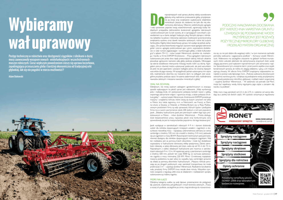 Wybieramy wał uprawowy Postęp techniczny w rolnictwie oraz dostępność ciągników z silnikami o dużej mocy zaowocowały wysypem nowych – wielofunkcyjnych i wszechstronnych – maszyn rolniczych. Coraz większym powodzeniem cieszy się uprawa bezorkowa, zapobiegająca przesuszaniu gleby i bardziej ekonomiczna od tradycyjnej orki głębokiej. Jak się nie pogubić w morzu możliwości? Adam Bukowski Do najważniejszych wad uprawy płużnej należą wywoływane głęboką orką nadmierne przesuszenie gleby, przyśpieszenie jej erozji oraz zwiększone wypłukiwanie składników mineralnych. Jeszcze do niedawna nie było dla niej ekonomicznej alternatywy. Obecnie wielofunkcyjne agregaty i wały uprawowe, poprzez swoją wszechstronność, ograniczają liczbę niezbędnych przejazdów. Jednocześnie skuteczność agregatów talerzowych i podorywkowych jest na tyle wysoka, że w sprzyjających warunkach z powodzeniem są w stanie zastąpić tradycyjny pług. Korzyści płynące z obniżenia nakładów na paliwo i robociznę częściowo niwelowane są koniecznością zwiększenia wysiewu oraz dawek nawozów azotowych, rośnie też zużycie herbicydów. Ogólny bilans bezorkowej uprawy roli wydaje się jednak zachęcający. „Do uprawy bezorkowej mogą być używane nasze agregaty talerzowe goliat i piorun, agregaty podorywkowe ajax i grom, wyposażone dodatkowo w wały rurowe zagęszczające i wyrównujące glebę, a także kultywator gryf z zębami 70×12 – mówi Leszek Weremczuk, dyrektor ds. marketingu i handlu w firmie EXPOM Krośniewice. – Praca agregatem talerzowym wykonywana jest przez dwa rzędy przesuniętych talerzy, których ułożenie powoduje agresywne nacinanie całej gleby podczas przejazdu. Obracające się talerze dodatkowo intensywnie mieszają resztki roślin czy słomę. Agregatem piorun również można wykonywać podorywki, ale pod warunkiem że pole nie jest zaperzone i pocięcie rozłogów perzu nie stworzy lepszych warunków do jego rozwoju. W szczególności jednak wykonujemy nim cięcie skib, rozdrabnianie obornika czy niszczenie darni na odłogach. Jest szczególnie przydatny podczas cięcia i kruszenia zadarnionych skib, rozdrabniania nawozów zielonych i mieszania nawozów mineralnych z glebą”. WAŁ NA SCHWAŁ Odrębnym, nie mniej ważnym zabiegiem agrotechnicznym w znaczący sposób wpływającym na jakość upraw jest wałowanie. „Wały wyrównują pola i rozbijają bryły, ich zastosowanie polepsza kontakt nasion z glebą, wspomaga zatrzymanie wilgoci i ogranicza erozję, a także polepsza strukturę gleby” – wylicza Leszek Weremczuk. Krośniewicki EXPOM produkuje maszyny i urządzenia rolnicze, które cieszą się dużym uznaniem nie tylko w Polsce, lecz także zagranicą, m.in. w Niemczech, we Francji, w Danii, na Litwie, w Szwecji, w Holandii, w Wielkiej Brytanii czy w Rosji. Podstawowym produktem firmy są wały uprawowe, których typów i podtypów firma ma w swoim asortymencie około 200. Jednym z nich jest popularny jacek. „Składany hydraulicznie jacek jest pierwszym wałem tego typu produkowanym w Polsce – mówi dyrektor Weremczuk. – Prosta obsługa, duże bezpieczeństwo pracy, najwyższa jakość oraz konkurencyjna cena spowodowały, że jest to maszyna bardzo popularna i do tego bezawaryjna”. PODCZAS WAŁOWANIA DOCISKANA JEST WIERZCHNIA WARSTWA GRUNTU I ZWIĘKSZA SIĘ PODSIĄKANIE WODY, PRZYŚPIESZONY JEST ROZWÓJ POŻYTECZNEJ MIKROFLORY GLEBOWEJ I ROZKŁAD MATERII ORGANICZNEJ nia się, co nie jest dobre dla wegetacji roślin. I w tym momencie zachodzi potrzeba wałowania i zagęszczania podłoża” – tłumaczy Leszek Weremczuk. Wałowanie ma szczególne znaczenie na glebach torfowo-murszowych, które wskutek zdolności do zatrzymywania znacznych ilości wody ulegają pęcznieniu pod wpływem naprzemiennych cykli zamarzania i tajenia. Spowodowane tym unoszenie darni i przerywanie węzłów oraz szyjek korzeniowych sprawia, że rośliny te ulegają osłabieniu i giną, a ich miejsce zajmują chwasty. W ofercie firmy EXPOM znajdujemy odpowiednie narzędzie w postaci wału łąkowego mors. „Podczas wałowania dociskana jest wierzchnia warstwa gruntu i zwiększa się podsiąkanie wody, przyśpieszony jest rozwój pożytecznej mikroflory glebowej i rozkład materii organicznej – wyjaśnia dyrektor Weremczuk. – W zależności od potrzeb wał Mors może być napełniany wodą, którą regulujemy jego ciężar, a zarazem siłę nacisku na podłoże”. Wały mors mają szerokość od 2,5 m do 2,75 m i zależnie od wersji składają się z jednej lub dwóch części. W czystości utrzymuje je regulowany Jacek występuje w szerokościach roboczych 4–9 m i stanowi doskonały wybór dla rolników dysponujących mniejszym areałem i ciągnikiem o stosunkowo niewielkiej mocy – najwęższa, czterometrowa odmiana (w wersji cambridge o średnicy 530 mm lub crosskill o średnicy 510 mm) zadowala się już ciągnikiem o mocy 80 KM. Rozwinięciem technicznym jacka jest tytan, również dostępny dla rolników dysponujących mniejszymi ciągnikami. Wał ten rozkładany jest za pomocą trzech siłowników i może być dodatkowo wyposażony w hydraulicznie sterowaną włókę sprężynową. Zakres szerokości roboczej, w jakiej oferowany jest tytan, waha się od 4,5 m do 7,5 m. Największym z wałów składanych hydraulicznie jest maximus o szerokościach roboczych 9 m i 12 m. W najszerszej wersji, z pierścieniami cambridge o średnicy 600 mm, potwór ten waży 8300 kg, co wymusza zastosowanie ciągnika o mocy minimalnej 220 KM. Mimo 12-metrowej rozpiętości maszyna podzielona na pięć sekcji (w wypadku typu cambridge) sprawnie się składa za pomocą siłowników hydraulicznych. „Maszyny rolnicze poruszają się po drogach publicznych, więc szerokość transportowa nie może przekraczać 3 m” – uspokaja dyrektor Weremczuk. Rozłożenie lub złożenie wału produkcji firmy EXPOM trwa niecałe dwie minuty. Wszystkie czynno