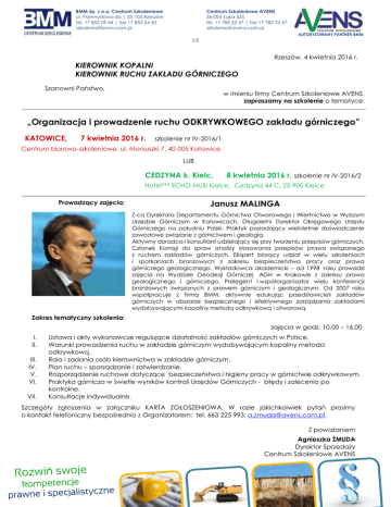 BMM Sp. z o.o. Centrum Szkoleniowe ul. Przemysłowa 4a | 35-105 Rzeszów tel. 17 852 09 44 | fax 17 853 54 40 [email protected] Centrum Szkoleniowe AVENS 36-004 Łąka 535 tel. 17 785 23 47 | fax 17 785 23 57 [email protected] AUTORYZOWANY PARTNER BMM 1/2 KIEROWNIK KOPALNI KIEROWNIK RUCHU ZAKŁADU GÓRNICZEGO Szanowni Państwo, Rzeszów, 4 kwietnia 2016 r. w imieniu firmy Centrum Szkoleniowe AVENS, zapraszamy na szkolenie o tematyce: „Organizacja i prowadzenie ruchu ODKRYWKOWEGO zakładu górniczego” KATOWICE, 7 kwietnia 2016 r. szkolenie nr IV-2016/1 Centrum biurowo-szkoleniowe, ul. Moniuszki 7, 40-005 Katowice LUB CEDZYNA k. Kielc, 8 kwietnia 2016 r. szkolenie nr IV-2016/2 Hotel*** ECHO MUSI Kielce, Cedzyna 44 C, 25-900 Kielce Prowadzący zajęcia: Janusz MALINGA Z-ca Dyrektora Departamentu Górnictwa Otworowego i Wiertnictwa w Wyższym Urzędzie Górniczym w Katowicach. Długoletni Dyrektor Okręgowego Urzędu Górniczego na południu Polski. Praktyk posiadający wieloletnie doświadczenie zawodowe związane z górnictwem i geologią. Aktywny doradca i konsultant udzielający się przy tworzeniu przepisów górniczych. Członek Komisji do spraw analizy stosowania przepisów prawa związanego z ruchem zakładów górniczych. Ekspert biorący udział w wielu szkoleniach i spotkaniach branżowych z zakresu bezpieczeństwa pracy oraz prawa górniczego geologicznego. Wykładowca akademicki – od 1998 roku prowadzi zajęcia na Wydziale Geodezji Górniczej AGH w Krakowie z zakresu prawa geologicznego i górniczego. Prelegent i współorganizator wielu konferencji branżowych związanych z prawem górniczym i geologicznym. Od 2007 roku współpracuje z firmą BMM, aktywnie edukując przedstawicieli zakładów górniczych w obszarze bezpiecznego i efektywnego zarządzania zakładami wydobywającymi kopaliny metodą odkrywkową i otworową. Zakres tematyczny szkolenia: zajęcia w godz. 10.00 – 16.00 I. II. III. IV. V. VI. VII. Ustawa i akty wykonawcze regulujące działalność zakładów górniczych w Polsce. Warunki prowadzenia ruchu w zakładzie górniczym wydobywającym kopaliny metoda odkrywkową. Rola i zadania osób kierownictwa w zakładzie górniczym. Plan ruchu – sporządzanie i zatwierdzanie. Rozporządzenie ruchowe dotyczące bezpieczeństwa i higieny pracy w górnictwie odkrywkowym. Praktyka górnicza w świetle wyników kontroli Urzędów Górniczych - błędy i zalecenia po kontrolne. Konsultacje indywidualne. Szczegóły zgłoszenia w załączniku KARTA ZGŁOSZENIOWA. W razie jakichkolwiek pytań prosimy o kontakt telefoniczny bezpośrednio z Organizatorem: tel. 663 225 993, [email protected]. Z poważaniem Agnieszka ŻMUDA Dyrektor Sprzedaży Centrum Szkoleniowe AVENS KARTA ZGŁOSZENIOWA AUTORYZOWANY PARTNER BMM 2/2 SZKOLENIE Nr* ……………….. „Organizacja i prowadzenie ruchu ODKRYWKOWEGO i OTWOROWEGO zakładu górniczego” prowadzenie: Janusz MALINGA, WUG TERMIN*: …………………..…… LOKALIZAJA*: …………………………………………………. *proszę wpisać wybraną datę i lokalizację oraz nr szkolenia tj. 7.04.16 – Katowice, nr IV-2016/1 lub 8.04.16 – Cedzyna, nr IV-2016/2 IMIĘ I NAZWISKO UCZESTNIKA STANOWISKO TELEFON | E-MAIL KWOTA NETTO Cena regularna szkolenia: Oferta LAST MINUTE !!! 700,00 zł netto (+23% VAT), na zgłoszenia dokonane do dnia 06.04.16r. Cena obowiązuje tylko przy zgłoszeniach dokonanych nie później niż do godz. 12.00 dnia 6 kwietnia br. 790,00 zł netto (+23% VAT)* UCZESTNICTWO w szkoleniu obejmuje: udział w zajęciach, materiały i akcesoria szkoleniowe, certyfikat, serwis kawowy, ciepły posiłek, obsługę organizatora przed, w trakcie i po szkoleniu, konsultacje z trenerem do 30 dni od zakończenia szkolenia. Powyższy koszt uczestnictwa nie obejmuje zakwaterowania. Organizator oferuje pomoc w rezerwacji noclegów według poniższych cen: nocleg w pokoju 1 osobowym 100,00 - 140,00 zł netto/os (+23% VAT) nocleg jednej osoby w pokoju 2 osobowym 80,00 zł netto (+23% VAT) (przyjmujemy rezerwacje pokoi 2 osobowych wyłącznie dla parzystej liczby zgłoszonych osób z anej firmy) Osoby zgłaszające się po tym terminie zobowiązane są do wcześniejszego kontaktu telefonicznego z Organizatorem. Niniejsze szkolenie prowadzimy także w formule zamniętej dla grupy od 9 osób. Zapraszamy do kontaktu z Organizatorem w sprawie uzgodnienia warunków wspołpracy. OŚWIADCZENIE VAT: NIP: Niniejszym upoważniam firmę PPHU AVENS Sławomir Żmuda do wystawienia faktury VAT bez podpisu odbiorcy: FIRMA: MIASTO: ULICA: KOD POCZTOWY: Zgłoszenie na szkolenie przyjmowane jest wyłącznie w formule pisemnej na niniejszym formularzu zgłoszeniowym do dnia 5 kwietnia 2016r. Kartę zgłoszenia prosimy przysyłać na numer faksu: 17 785 23 57, lub [email protected], Po otrzymaniu karty zgłoszeniowej, przedstawiciel firmy AVENS potwierdzi przyjęcie zgłoszenia oraz wpływ środków na konto. Najpóźniej do 3 dni po zakończeniu szkolenia na adres Jednostki przesłana zostanie faktura VAT. Płatność za szkolenie prosimy realizować przelewem podać numer szkolenia: IV-2016/1 - Katowice lub VI-2016/2 – Cedzyna PPHU AVENS, 36-004 Łąka 535, MILLENIUM BANK Nr: 37 1160 2202 0000 0002 7794 0737 PODPIS i PIECZĄTKA: W sprawach organizacyjnych zapraszamy do kontaktu: tel. 177852347, 663 225 993 Pełna dokumentacja szkolenia dostępna jest na stronie internetowej: www. avens.com.pl Formularz zgłoszenia stanowi prawnie wiążące zobowiązanie do przyjęcia oferty na warunkach określonych w karcie zgłoszenia. Odwołanie uczestnictwa w szkoleniu od 14 do 7dni przed rozpoczęciem szkolenia uprawnia do zwrotu połowy wpłaconej kwoty. Odwołanie uczestnictwa w terminie 7 dni lub krótszym nie stanowi podstawy do zwrotu dokonanej wpłaty lub niewystawienia faktury obciążającej. Organizator zastrzega sobie prawo odwołania szkolenia z przyczyn niezależnych lub w przypadku małej liczby zgłoszeń. A w sytuacji losowej z