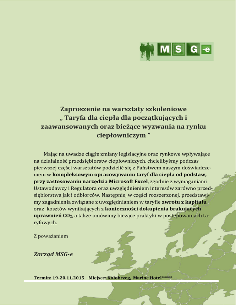 Zaproszenie na warsztaty szkoleniowe „ Taryfa dla ciepła - MSG-e