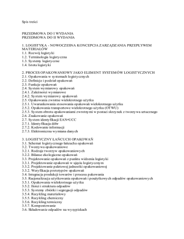 Spis treści PRZEDMOWA DO I WYDANIA PRZEDMOWA DO II WYDANIA 1. LOGISTYKA - NOWOCZESNA KONCEPCJA ZARZĄDZANIA PRZEPŁYWEM MATERIAŁÓW 1.1. Rozwój logistyki 1.2. Terminologia logistyczna 1.3. Systemy logistyczne 1.4. Istota logistyki 2. PROCES OPAKOWANIOWY JAKO ELEM ENT SYSTEM ÓW LOGISTYCZNYCH 2.1. Opakowania w systemach logistycznych 2.2. Definicje i podział opakowań 2.3. Funkcje opakowań 2.4. System wymiarowy opakowań 2.4.1. ZaleŜności wymiarowe 2.4.2. System wymiarowy opakowań 2.5. Opakowania zwrotne wielokrotnego uŜytku 2.5.1. Uwarunkowania stosowania opakowań wielokrotnego uŜytku 2.5.2. Opakowania transportowe wielokrotnego uŜytku (OTWU) 2.5.3. System obrotu opakowaniami zwrotnymi w postaci skrzynek z tworzywa sztucznego 2.6. Znakowanie opakowań 2.7. System identyfikacji EAN•UCC 2.7.1. Identyfikacja dóbr 2.7.2. Kodowanie informacji 2.7.3. Elektroniczna wymiana danych 3. LOGISTYCZNY ŁAŃCUCH OPAKOWAŃ 3.1. Schemat logistycznego łańcucha opakowań 3.2. Tworzywa opakowaniowe 3.2.1. Rodzaje tworzyw opakowaniowych 3.2.2. Bilanse ekologiczne opakowań 3.3. Projektowanie opakowań z punktu widzenia logistyki 3.3.1. Projektowanie opakowań w ujęciu logistycznym 3.3.2. Projektowanie paletowej jednostki opakowaniowej 3.3.2. Weryfikacja prototypów opakowań 3.4. Integracja produkcji towarów i procesu pakowania 3.5. Racjonalizacja uŜytkowania opakowań i pouŜytkowych odpadów opakowaniowych 3.5.1. Opakowania wielokrotnego uŜytku 3.5.2. Ilości i struktura odpadów 3.5.3. Systemy zbiórki i segregacji odpadów 3.5.4. Recykling materiałowy 3.5.5. Recykling chemiczny 3.5.6. Recykling termiczny 3.5.7. Kompostowanie 3.6. Składowanie odpadów na wysypiskach 4. POSTULATY I REGULACJE FORMALNOPRAWNE DOTYCZĄCE OPAKOWAŃ 4.1. Produkcja i konsumpcja w wieku XX jako czynniki generujące ilościowy wzrost odpadów opakowaniowych 4.2. Postulaty kierowane pod adresem opakowań 4.2.1. Punkt widzenia marketingu 4.2.2. Punkt widzenia logistyki 4.2.3. Punkt widzenia ekologii 4.2.4. Rola towaroznawstwa 4.3. Wytyczne i dyrektywy ONZ i UE 4.4. Opakowania i odpady opakowaniowe w regulacjach prawnych 4.4.1. Regulacje prawne jako instrument oddziaływania na rzecz ochrony środowiska 4.4.2. Nowe polskie regulacje prawne dotyczące opakowań i odpadów opakowaniowych BIBLIOGRAFIA SPIS RYSUNKÓW SPIS TABEL