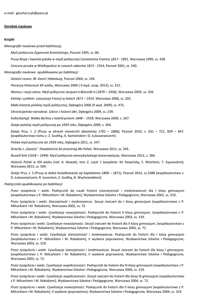 e-mail: [email protected] Dorobek naukowy Książki Monografie naukowe przed habilitacją: Myśl polityczna Zygmunta Krasińskiego, Poznań 1995, ss. 80. Prusy Rosja i kwestia polska w myśli politycznej Constantina Frantza 1817 - 1891, Warszawa 1999, ss. 338. Cenzura pruska w Wielkopolsce w czasach zaborów 1815 - 1914, Poznań 2001, ss. 540. Monografie naukowe opublikowane po habilitacji: Ostatni cesarz. Bł. Karol I Habsburg, Poznań 2004, ss. 144. Pierwszy Holocaust XX wieku, Warszawa 2004 [ II wyd. uzup. 2012], ss. 221. Niemcy i racja stanu. Myśl polityczna Jacques’a Bainville’a (1879 – 1936), Warszawa 2005, ss. 356. Kielnią i cyrklem. Laicyzacja Francji w latach 1871 – 1914, Warszawa 2006, ss. 202. Mała historia polskiej myśli politycznej, Dębogóra 2006 (II wyd. 2009), ss. 475. Chrześcijańsko-narodowi. Szkice z historii idei, Dębogóra 2009, ss. 239. Kulturkampf. Walka Berlina z katolicyzmem 1848 – 1918, Warszawa 2009, s. 267. Dzieje polskiej myśli politycznej po 1939 roku, Dębogóra 2009, s. 304. Dzieje Prus, t. 2 (Prusy w okresie monarchii absolutnej 1701 – 1806), Poznań 2010, s. 631 – 721, 839 – 847. [współautorstwo tomu z: Z. Szultką, A. Kamieńskim i D. Łukaszewiczem]. Polska myśl polityczna do 1939 roku, Dębogóra 2011, ss. 547. Strachy z „Gazety”. Dwadzieścia lat przestróg dla Polski, Warszawa 2011, ss. 245. Russell Kirk (1918 – 1994). Myśl polityczna amerykańskiego konserwatysty, Warszawa 2012, s. 266. Historie Polski w XIX wieku (red. A. Nowak), tom 2, część 1 (wspólnie: M. Karpińską, S. Wiechem, T. Gąsowskim), Warszawa 2013, ss. 504. Dzieje Prus, t. 3 (Prusy w dobie kształtowania się kapitalizmu 1806 – 1871), Poznań 2014, ss.1088 [współautorstwo z: D. Łukaszewiczem, R. Łysoniem, Z. Szultką, B. Wachowiakiem]. Podręczniki opublikowane po habilitacji: Przez tysiąclecia i wieki. Podręcznik do nauki historii (starożytność i średniowiecze) dla I klasy gimnazjum [współautorstwo z P. Milcarkiem i M. Robakiem], Wydawnictwa Szkolne i Pedagogiczne, Warszawa 2002, ss. 319. Przez tysiąclecia i wieki. Starożytność i średniowiecze. Zeszyt ćwiczeń do I klasy gimanzjum [współautorstwo z P. Milcarkiem i M. Robakiem], Warszawa 2002, ss. 72. Przez tysiąclecia i wieki. Cywilizacje nowożytności. Podręcznik do historii II klasa gimnazjum. [współautorstwo z P. Milcarkiem i M. Robakiem], Wydawnictwa Szkolne i Pedagogiczne, Warszawa 2003, ss. 319. Przez tysiąclecia i wieki. Cywilizacje nowożytności. Zeszyt ćwiczeń do historii dla II klasy gimnazjum. [współautorstwo z P. Milcarkiem i M. Robakiem], Wydawnictwa Szkolne i Pedagogiczne, Warszawa 2003, ss. 72. Przez tysiąclecia i wieki. Cywilizacja starożytności i średniowiecza. Podręcznik do historii dla I klasy gimnazjum [współautorstwo z P. Milcarkiem i M. Robakiem], II wydanie poprawione, Wydawnictwa Szkolne i Pedagogiczne, Warszawa 2003, ss. 319. Przez tysiąclecia i wieki. Cywilizacja starożytności i średniowiecza. Zeszyt ćwiczeń do historii dla klasy I gimnazjum. [współautorstwo z P. Milcarkiem i M. Robakiem], II wydanie poprawione, Wydawnictwa Szkolne i Pedagogiczne, Warszawa 2003, ss. 72. Przez tysiąclecia i wieki. Cywilizacje współczesności. Podręcznik do historii dla III klasy gimnazjum [współautorstwo z P. Milcarkiem i M. Robakiem], Wydawnictwa Szkolne i Pedagogiczne, Warszawa 2004, ss. 319. Przez tysiąclecia i wieki. Cywilizacje współczesności. Zeszyt ćwiczeń do historii dla klasy III gimnazjum [wspólautorstwo z P. Milcarkiem i M. Robakiem], Wydawnictwa Szkolne i Pedagogiczne, Warszawa 2004, ss. 72. Przez tysiąclecia i wieki. Cywilizacje nowożytności. Podręcznik do historii dla II klasy gimnazjum [współautorstwo z P. Milcarkiem i M. Robakiem], II wydanie (poprawione), Wydawnictwa Szkolne i Pedagogiczne, Warszawa 2004, ss. 319. Przez tysiąclecia i wieki. Cywilizacje nowożytności. Zeszyt ćwiczeń do historii dla klasy II gimnazjum [współautorstwo z P. Milcarkiem i M. Robakiem], wyd. II poprawione, Wydawnictwa Szkolne i Pedagogiczne, Warszawa 2004, ss. 72. Przez tysiąclecia i wieki. Cywilizacje współczesności. Podręcznik do klasy III gimnazjum, II wydanie (poprawione), WSiP, Warszawa 2007, ss. 319. Przez tysiąclecia i wieki. Cywilizacje współczesności. Zeszyt ćwiczeń do podręcznika do klasy III gimnazjum, wydanie II (poprawione), WSiP, Warszawa 2007, ss. 72. Przez tysiąclecia i wieki. Cywilizacja starożytności i średniowiecza. Podręcznik do historii dla klasy I gimnazjum. Nowa Podstawa Programowa [współautorstwo z P. Milcarkiem i M. Robakiem], Warszawa 2009 [II wyd. 2010], ss. 332. Zeszyt ćwiczeń z historii do klasy I gimnazjum. Nowa Podstawa Programowa [współautorstwo z P. Milcarkiem i M. Robakiem], Warszawa 2009, ss. 64. Przez tysiąclecia i wieki. Cywilizacje nowożytności. Podręcznik do historii dla klasy II gimnazjum. Nowa Podstawa Programowa [współautorstwo z P. Milcarkiem i M. Robakiem], Warszawa 2009 [ II wyd. 2011], ss. 344. Zeszyt ćwiczeń do historii dla klasy II gimnazjum. Nowa Podstawa Programowa [współautorstwo z P. Milcarkiem i M. Robakiem], Warszawa 2010, s.. 96. Przez tysiąclecia i wieki. Cywilizacje współczesności. Podręcznik do historii dla klasy III gimnazjum. Nowa Podstawa Programowa [współautorstwo z P. Milcarkiem i M. Robakiem], Warszawa 2011, ss. 256. Zeszyt ćwiczeń do historii dla klasy III gimnazjum. Nowa Podstawa Programowa [współautorstwo z P. Milcarkiem i M. Robakiem], Warszawa 2011, ss. 72. Artykuły Naukowe przed habilitacją: Wstęp do: Zygmunt Balicki, Egoizm narodowy wobec etyki, Poznań 1995, s. 3 - 8. Wstęp do: Ralph Wiltgen SVD, Ren wpada do Tybru. Historia Soboru Watykańskiego II, Poznań 2001, s. 1 - 3. Konflikt między królem Wilhelmem I a Kronprinzem Fryderykiem na tle nowego rozporządzenia prasowego w 1863 roku, w: "Przegląd Historyczny", nr 2, 1995, s. 15 - 27. Onno Klopp i czarna legenda Prus, w: "Kwartalnik Historyczny", z. 