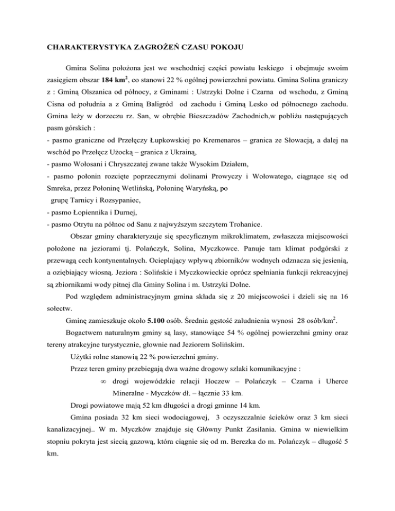 CHARAKTERYSTYKA ZAGROśEŃ CZASU POKOJU Gmina Solina połoŜona jest we wschodniej części powiatu leskiego i obejmuje swoim zasięgiem obszar 184 km2, co stanowi 22 % ogólnej powierzchni powiatu. Gmina Solina graniczy z : Gminą Olszanica od północy, z Gminami : Ustrzyki Dolne i Czarna od wschodu, z Gminą Cisna od południa a z Gminą Baligród od zachodu i Gminą Lesko od północnego zachodu. Gmina leŜy w dorzeczu rz. San, w obrębie Bieszczadów Zachodnich,w pobliŜu następujących pasm górskich : - pasmo graniczne od Przełęczy Łupkowskiej po Kremenaros – granica ze Słowacją, a dalej na wschód po Przełęcz UŜocką – granica z Ukrainą, - pasmo Wołosani i Chryszczatej zwane takŜe Wysokim Działem, - pasmo połonin rozcięte poprzecznymi dolinami Prowyczy i Wołowatego, ciągnące się od Smreka, przez Połoninę Wetlińską, Połoninę Waryńską, po grupę Tarnicy i Rozsypaniec, - pasmo Łopiennika i Durnej, - pasmo Otrytu na północ od Sanu z najwyŜszym szczytem Trohanice. Obszar gminy charakteryzuje się specyficznym mikroklimatem, zwłaszcza miejscowości połoŜone na jeziorami tj. Polańczyk, Solina, Myczkowce. Panuje tam klimat podgórski z przewagą cech kontynentalnych. Ocieplający wpływq zbiorników wodnych odznacza się jesienią, a oziębiający wiosną. Jeziora : Solińskie i Myczkowieckie oprócz spełniania funkcji rekreacyjnej są zbiornikami wody pitnej dla Gminy Solina i m. Ustrzyki Dolne. Pod względem administracyjnym gmina składa się z 20 miejscowości i dzieli się na 16 sołectw. Gminę zamieszkuje około 5.100 osób. Średnia gęstość zaludnienia wynosi 28 osób/km2. Bogactwem naturalnym gminy są lasy, stanowiące 54 % ogólnej powierzchni gminy oraz tereny atrakcyjne turystycznie, głownie nad Jeziorem Solińskim. UŜytki rolne stanowią 22 % powierzchni gminy. Przez teren gminy przebiegają dwa waŜne drogowy szlaki komunikacyjne : • drogi wojewódzkie relacji Hoczew – Polańczyk – Czarna i Uherce Mineralne - Myczków dł. – łącznie 33 km. Drogi powiatowe mają 52 km długości a drogi gminne 14 km. Gmina posiada 32 km sieci wodociągowej, 3 oczyszczalnie ścieków oraz 3 km sieci kanalizacyjnej.. W m. Myczków znajduje się Główny Punkt Zasilania. Gmina w niewielkim stopniu pokryta jest siecią gazową, która ciągnie się od m. Berezka do m. Polańczyk – długość 5 km. Dominującą role w gospodarce gminy odgrywa turystyka i agroturystyka, nieco mniejszą rolnictwo, usługi handlowe i produkcyjne. Edukacja młodzieŜy realizowana jest w 8 ośrodkach oświatowych. Główną bazę kulturalną stanowią : Gminny Ośrodek Kultury, Sportu i Turystyki w Polańczyku. Do potencjalnych zagroŜeń Gminy Solina mogących spowodować sytuacje kryzysowe, masowe zagroŜenia Ŝycia i zdrowia ludności lub degradację środowiska naturalnego naleŜy zaliczyć: ZagroŜenia spowodowane siłami natury : - powodzie i podtopienia, - zjawiska lodowe na rzekach i zbiornikach wodnych, - gradobicia, - susze, - silne wiatry – huragany, zagroŜenia epidemiologiczne ludzi i epidemii, zagroŜenia epizootyczne zwierząt., zagroŜenia poŜarowe, awarie magistral gazowych, katastrofy drogowe, zagroŜenie substancjami niebezpiecznymi, zagroŜenie radiacyjne. zagroŜenia transgraniczne, katastrofy budowlane, zagroŜenia osuwiskowe, naruszenia porządku publicznego i działania terroru/bioterroru.