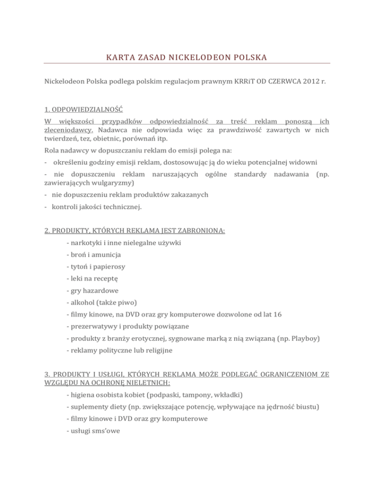 KARTA ZASAD NICKELODEON POLSKA Nickelodeon Polska podlega polskim regulacjom prawnym KRRiT OD CZERWCA 2012 r. 1. ODPOWIEDZIALNOŚĆ W większości przypadków odpowiedzialność za treść reklam ponoszą ich zleceniodawcy. Nadawca nie odpowiada więc za prawdziwość zawartych w nich twierdzeń, tez, obietnic, porównań itp. Rola nadawcy w dopuszczaniu reklam do emisji polega na: - określeniu godziny emisji reklam, dostosowując ją do wieku potencjalnej widowni - nie dopuszczeniu reklam naruszających ogólne standardy nadawania (np. zawierających wulgaryzmy) - nie dopuszczeniu reklam produktów zakazanych - kontroli jakości technicznej. 2. PRODUKTY, KTÓRYCH REKLAMA JEST ZABRONIONA: - narkotyki i inne nielegalne używki - broń i amunicja - tytoń i papierosy - leki na receptę - gry hazardowe - alkohol (także piwo) - filmy kinowe, na DVD oraz gry komputerowe dozwolone od lat 16 - prezerwatywy i produkty powiązane - produkty z branży erotycznej, sygnowane marką z nią związaną (np. Playboy) - reklamy polityczne lub religijne 3. PRODUKTY I USŁUGI, KTÓRYCH REKLAMA MOŻE PODLEGAĆ OGRANICZENIOM ZE WZGLĘDU NA OCHRONĘ NIELETNICH: - higiena osobista kobiet (podpaski, tampony, wkładki) - suplementy diety (np. zwiększające potencję, wpływające na jędrność biustu) - filmy kinowe i DVD oraz gry komputerowe - usługi sms’owe 4. TREŚCI, KTÓRE MOGĄ SPOWODOWAĆ ODRZUCENIE REKLAMY BEZ WZGLĘDU NA KATEGORIĘ PRODUKTU: - nagość - treści seksualne/erotyczne - wulgarny język lub zachowanie - przemoc - niebezpieczne zachowania szczególnie przemawiające do dzieci - bezpośrednie namawianie dzieci do zakupu produktu - treści szokujące lub bulwersujące - reklamy z udziałem VJ’ów danego kanału - treści wzbudzające strach/lęk - przejawy dyskryminacji mniejszości 5. OGRANICZENIA W DOPUSZCZENIU DO EMISJI REKLAM INNYCH NADAWCÓW Nadawca zastrzega sobie prawo do odmowy emisji reklam, które: -.zachęcają do oglądania innych kanałów lub poszczególnych programów nadawanych na innych stacjach kierowanych do dzieci - przedstawiają towary i usługi, firmowane przez marki innych kanałów kierowanych do dzieci 6. ZASADY PRZYJMOWANIA REKLAM DO EMISJI: - każdy spot dopuszczony do emisji na kanale Nickelodeon Polska podlega indywidualnej ocenie - decyzja zapada przede wszystkim na podstawie weryfikacji pełnego spotu - możliwa jest konsultacja spotu na etapie produkcji i planowania, poprzez przedstawienie scenariusza lub storyboardu.