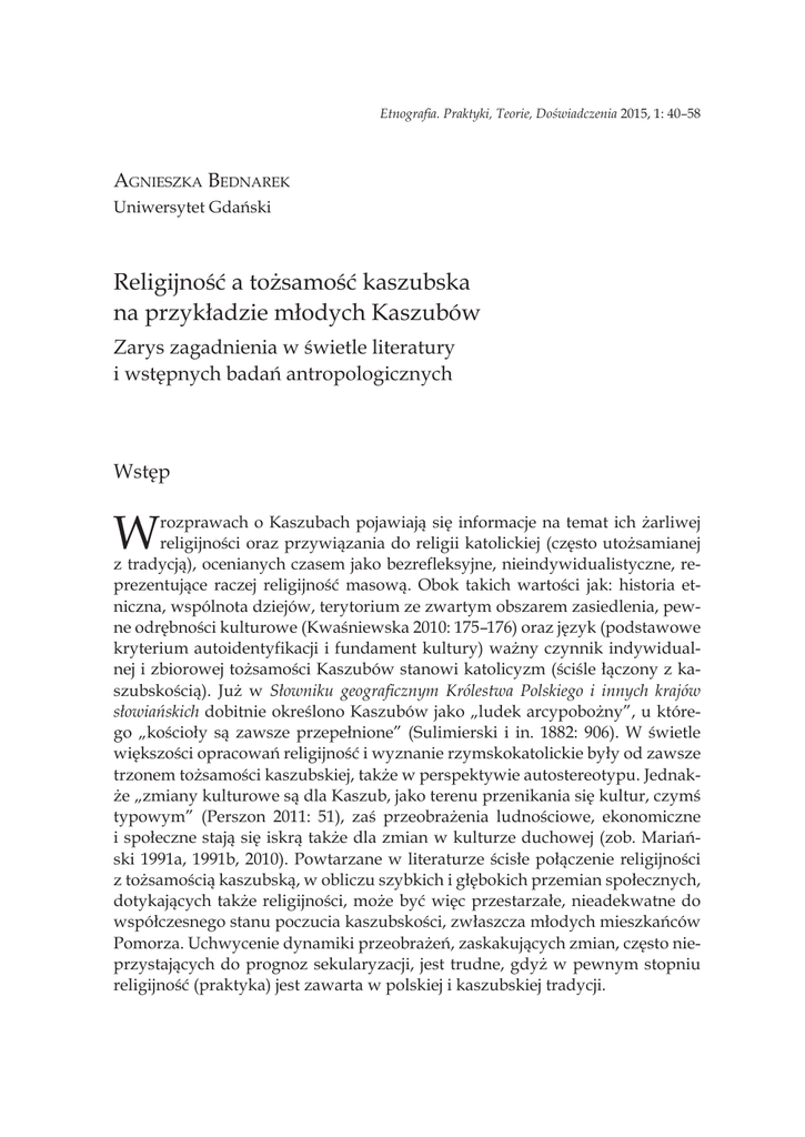 Etnografia. Praktyki, Teorie, Doświadczenia 2015, 1: 40–58 Agnieszka Bednarek Uniwersytet Gdański Religijność a tożsamość kaszubska na przykładzie młodych Kaszubów Zarys zagadnienia w świetle literatury i wstępnych badań antropologicznych Wstęp W rozprawach o Kaszubach pojawiają się informacje na temat ich żarliwej religijności oraz przywiązania do religii katolickiej (często utożsamianej z tradycją), ocenianych czasem jako bezrefleksyjne, nieindywidualistyczne, reprezentujące raczej religijność masową. Obok takich wartości jak: historia etniczna, wspólnota dziejów, terytorium ze zwartym obszarem zasiedlenia, pewne odrębności kulturowe (Kwaśniewska 2010: 175–176) oraz język (podstawowe kryterium autoidentyfikacji i fundament kultury) ważny czynnik indywidualnej i zbiorowej tożsamości Kaszubów stanowi katolicyzm (ściśle łączony z kaszubskością). Już w Słowniku geograficznym Królestwa Polskiego i innych krajów słowiańskich dobitnie określono Kaszubów jako „ludek arcypobożny”, u którego „kościoły są zawsze przepełnione” (Sulimierski i in. 1882: 906). W świetle większości opracowań religijność i wyznanie rzymskokatolickie były od zawsze trzonem tożsamości kaszubskiej, także w perspektywie autostereotypu. Jednakże „zmiany kulturowe są dla Kaszub, jako terenu przenikania się kultur, czymś typowym” (Perszon 2011: 51), zaś przeobrażenia ludnościowe, ekonomiczne i społeczne stają się iskrą także dla zmian w kulturze duchowej (zob. Mariański 1991a, 1991b, 2010). Powtarzane w literaturze ścisłe połączenie religijności z tożsamością kaszubską, w obliczu szybkich i głębokich przemian społecznych, dotykających także religijności, może być więc przestarzałe, nieadekwatne do współczesnego stanu poczucia kaszubskości, zwłaszcza młodych mieszkańców Pomorza. Uchwycenie dynamiki przeobrażeń, zaskakujących zmian, często nieprzystających do prognoz sekularyzacji, jest trudne, gdyż w pewnym stopniu religijność (praktyka) jest zawarta w polskiej i kaszubskiej tradycji. Religijność a tożsamość kaszubska na przykładzie młodych Kaszubów… 41 Niniejsze opracowanie ma na celu przyjrzenie się tej kwestii w dotychczasowych publikacjach oraz skonfrontowanie jej z wnioskami płynącymi z wstępnego badania religijności młodych Kaszubów. Intencją nadrzędną podjęcia problemu jest zasygnalizowanie potrzeby przeprowadzenia głębszych badań etnologicznych dotyczących tej kwestii (uchwycenia jej przejawów i różnorodności) oraz próba stworzenia pod nie podstaw. Główną metodą wykorzystaną w badaniach był wywiad kwestionariuszowy oraz wywiad pogłębiony, choć pomocna, lecz przez nieustrukturalizowanie stanowiąca jedynie tło metody podstawowej, była także obserwacja uczestnicząca. Religijność – próba uściślenia pojęcia Religia jest pojęciem trudnym do uchwycenia. Do jej struktury zalicza się doktrynę (prawdy wiary), zasady życia moralnego, czynności religijne (rytuały, kult), duchowość indywidualną (np. mistykę) oraz organizację (wspólnotę religijną) (Gigilewicz 2012: religijność). W jej podstawowym rozumieniu mieści się system wierzeń i praktyk. Religijność natomiast rozumiana jest jako subiektywna, wewnętrzna strona religii i jej zewnętrzne manifestacje. Jest to postawa religijna „osobnika lub grupy, ze szczególnym uwzględnieniem aspektu przeżyciowo-emocjonalnego (pobożność)” (Poniatowski 1969: religijność). Na potrzeby badań pojęcie to ograniczone zostało do zewnętrznego przejawu systemu wierzeń, czyli udziału w życiu obrzędowym wspólnoty, deklarowanych wartości, którymi kierują się badani (ich styczność z nauką Kościoła), oraz praktyk pobożnościowych. Nieodłączna część religijności, jaką obok ascezy i mistyki jest duchowość (zob. Gadacz, Milerski 2001: duchowość), przez rozbudowaną i niejasną terminologię z nią związaną, a także z racji jej wewnętrznego przejawiania się, a nade wszystko z konieczności doboru innej metodologii – została w badaniach pominięta. Sferę religijności dzielić można na deklaratywną i praktykowaną – nie należy mieszać tych kategorii. Badaniu podlegało więc idealne wyobrażenie: to, jak młodzi ludzie myślą o swojej religijności, jakie wartości wyznają i uważają za ważne oraz jak je rozumieją. Chodziło więc o religijność rozumianą w ramach nauk społecznych, nie zaś w jej wymiarze psychologicznym czy teologicznym. Taki wymiar religijności jest wyznaczony i ograniczony danym kontekstem społeczno-kulturowym (Mariański 1984: 9), ponieważ „w ujęciu teologicznym religia nie jest częścią kultury” i na swoje miano zasługuje tylko wtedy, gdy jest uznawana za dzieło samego objawiającego się Boga (Perszon 2011: 44). Warto pamiętać, że „akt religijny osoby jest zawsze uwarunkowany przez kontekst kulturowy” (Bartnik 1996: 21–35, za: Perszon 2011: 44), zatem należy rozróżniać religię i kulturę, lecz ich nie oddzielać, ponieważ nierozerwalnie istnieją w człowieku. Kulturotwórcze znaczenie religii, jej wkład w kulturową tożsamość Kaszubów istnieje więc jedynie na zasadzie symbiozy wiary z jej kulturowym kontekstem 42 Agnieszka Bednarek (Kawecki 2008: 19 i n., za: Perszon 2011: 44). Zarówno osobisty, jak i społeczny model praktykowanego chrześcijaństwa naznaczony jest określonymi cechami kulturowymi: specyfiką charakterystyczną dla mentalności danej społeczności, jej sposobu gospodarowania i życia (Perszon 2011: 44–45). Z takiego rozumienia aktu religijnego wypływa pojęcie kultury chrześcijańskiej, którą zajmować się może etnologia badająca obrzędowość czy też szerzej: kulturę duchową ściśle związaną z kalendarzem liturgicznym Kościoła katolickiego. Jednak w dotychczasowej literaturze dotyczącej mieszkańców Kaszub dużo miejsca i namysłu poświęca się tożsam