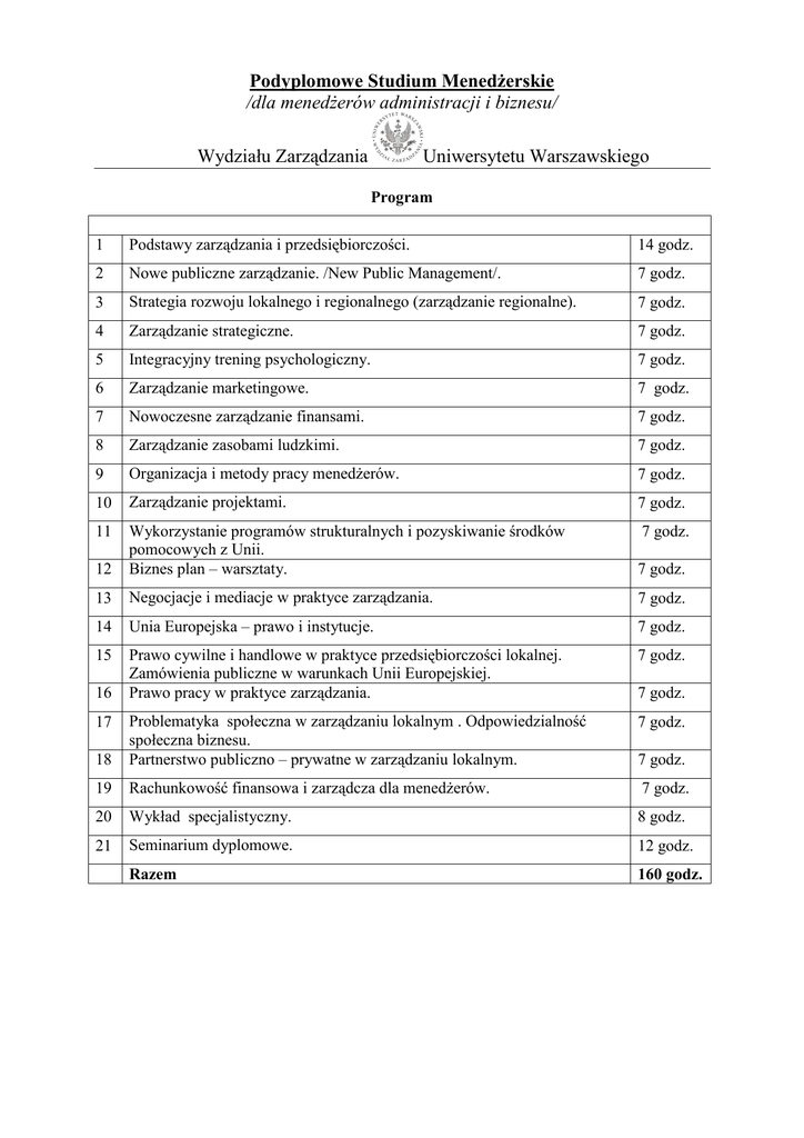 Podyplomowe Studium MenedŜerskie /dla menedŜerów administracji i biznesu/ Wydziału Zarządzania Uniwersytetu Warszawskiego Program 1 Podstawy zarządzania i przedsiębiorczości. 14 godz. 2 Nowe publiczne zarządzanie. /New Public Management/. 7 godz. 3 Strategia rozwoju lokalnego i regionalnego (zarządzanie regionalne). 7 godz. 4 Zarządzanie strategiczne. 7 godz. 5 Integracyjny trening psychologiczny. 7 godz. 6 Zarządzanie marketingowe. 7 godz. 7 Nowoczesne zarządzanie finansami. 7 godz. 8 Zarządzanie zasobami ludzkimi. 7 godz. 9 Organizacja i metody pracy menedŜerów. 7 godz. 10 Zarządzanie projektami. 7 godz. 11 7 godz. 12 Wykorzystanie programów strukturalnych i pozyskiwanie środków pomocowych z Unii. Biznes plan – warsztaty. 7 godz. 13 Negocjacje i mediacje w praktyce zarządzania. 7 godz. 14 Unia Europejska – prawo i instytucje. 7 godz. 15 Prawo cywilne i handlowe w praktyce przedsiębiorczości lokalnej. Zamówienia publiczne w warunkach Unii Europejskiej. Prawo pracy w praktyce zarządzania. 7 godz. 7 godz. 18 Problematyka społeczna w zarządzaniu lokalnym . Odpowiedzialność społeczna biznesu. Partnerstwo publiczno – prywatne w zarządzaniu lokalnym. 19 Rachunkowość finansowa i zarządcza dla menedŜerów. 7 godz. 20 Wykład specjalistyczny. 8 godz. 21 Seminarium dyplomowe. 12 godz. Razem 160 godz. 16 17 7 godz. 7 godz.