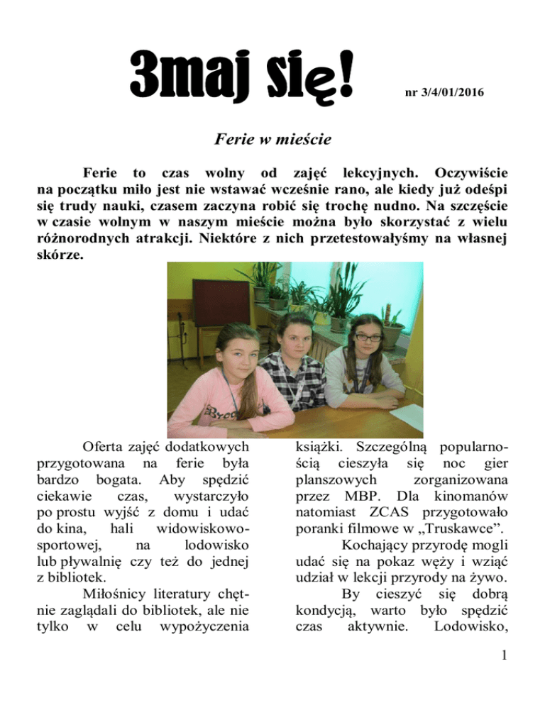 3maj się! nr 3/4/01/2016 Ferie w mieście Ferie to czas wolny od zajęć lekcyjnych. Oczywiście na początku miło jest nie wstawać wcześnie rano, ale kiedy już odeśpi się trudy nauki, czasem zaczyna robić się trochę nudno. Na szczęście w czasie wolnym w naszym mieście można było skorzystać z wielu różnorodnych atrakcji. Niektóre z nich przetestowałyśmy na własnej skórze. Oferta zajęć dodatkowych przygotowana na ferie była bardzo bogata. Aby spędzić ciekawie czas, wystarczyło po prostu wyjść z domu i udać do kina, hali widowiskowosportowej, na lodowisko lub pływalnię czy też do jednej z bibliotek. Miłośnicy literatury chętnie zaglądali do bibliotek, ale nie tylko w celu wypożyczenia książki. Szczególną popularnością cieszyła się noc gier planszowych zorganizowana przez MBP. Dla kinomanów natomiast ZCAS przygotowało poranki filmowe w „Truskawce”. Kochający przyrodę mogli udać się na pokaz węży i wziąć udział w lekcji przyrody na żywo. By cieszyć się dobrą kondycją, warto było spędzić czas aktywnie. Lodowisko, 1 pływalnia, ścianka wspinaczkowa – to tylko niektóre z atrakcji. A dzięki promocyjnym cenom, wystarczało też na mały posiłek regeneracyjny. Widowiska na żywo przyciągały sporo dzieci, młodzieży, a także dorosłych. Nam najbardziej spodobało się wspólne „kręcenie piruetów” na lodowisku. Aleksandra Jackowska, Wiktoria Deja, Maja Siciarz z kl. V b Wywiad miesiąca W cyklu „Wywiad miesiąca” o pracy w bibliotece rozmawiamy z panią Anną Kokowską, która w tym roku opiekuje się naszymi szkolnymi księgozbiorami. Aleksandra Jackowska, Maja Siciarz: Dzień dobry. Anna Kokowska: Dzień dobry. M. S.: Moje pierwsze pytanie dotyczy uczniów naszej szkoły. Czy często odwiedzają bibliotekę? A. K.: Najczęściej bibliotekę odwiedzają najmłodsi uczniowie, ci z klas IIII. Starsi przychodzą, gdy muszą wypożyczyć lekturę albo skorzystać ze słowników w czytelni. A. J.: Jakie książki dzieci wypożyczają najchętniej? A. K.: Aktualnie ogromną popularnością cieszy się „Dziennik cwaniaczka”, po wszystkie części ustawiają się bardzo długie kolejki. M. S.: Czy można powiedzieć o naszych uczniach, że szanują książki? A. K.: Uczniowie naszej szkoły starają się dbać o książki, zwłaszcza o te nowe, ponieważ wiedzą, że będą one służyły przez lata ich koleżankom i kolegom. A. J.: Czy uczniowie terminowo oddają lektury? A. K.: Jeśli chodzi o lektury szkolne, to faktycznie czytelnicy często oddają je po terminie. Uczniowie czytają w różnym tempie, niektórzy potrzebują więcej czasu. Ci szybciej czytający oddają książki wcześniej lub przekazują koleżankom i kolegom. Ważne, żeby wszyscy zapoznali się z treścią i zdobyli pozytywne oceny podczas sprawdzianów i prac klasowych. M. S.: Lubi pani swoją pracę? 2 A. K.: W bibliotece na pewno jest spokojniej niż w klasie podczas lekcji, jednak praca bibliotekarki również może być satysfakcjonująca. A. J.: Co według pani daje nam czytanie książek? A. K.: Czytanie książek między innymi rozwija wyobraźnię, wzbogaca słownictwo i jest doskonałym treningiem ortograficznym. M.S., A. J.: Dziękujemy serdecznie za udzielenie wywiadu. A. K.: Do zobaczenia w bibliotece. Rozmawiały: Aleksandra Jackowska i Maja Siciarz z kl. V b Kącik poezji Nasz szkoła - „Trójka” Nasza szkoła podstawowa przyjąć uczniów jest gotowa. Klasy pięknie posprzątane, szatnie też przygotowane. Choć niektórzy są tu nowi do nauki też gotowi. I piszemy i liczymy, bardzo dobrze się uczymy. Pani Ania, już od rana, jest wesoła, roześmiana. Swoją wiedzę przekazuje, rezultatów oczekuje. My się często buntujemy, że na przerwę iść już chcemy! Ale gdy się wyhasamy, do nauki powracamy . W naszej szkole jest „fajowo” i nie tylko tak naukowo! Korzystamy też z zabawy, żeby nie wyjść czasem z wprawy. Bo nauka i zabawa, to jest taka super sprawa! Często trzeba robić przerwy, bo czasami wytrzymać nie możemy! Bo my chcemy już odpocząć, żeby potem znów na nowo, uczyć się tak „supernowo”! 3 Autorka wiersza: Wiktoria Deja z kl. V b Sonda Czy nie jesteście ciekawi, jaki zawód wybraliby Wasi nauczyciele, gdyby mogli dokonać ponownego wyboru? Przeczytajcie, a przekonacie się sami! A. Kokowska: Uwielbiam swoją pracę, ale gdybym musiała wybierać, chciałabym być dziennikarką. A. Sypniewska: Podróżnik i kolarz. S. Kucharski: Muzyk lub psycholog. M. Brózda: Prawnik lub piosenkarka. M. Kosiba: Nie zamieniłabym mojego zawodu, ale gdyby szkoły nagle przestały istnieć - księgowa. M. Rusin: Dziennikarka. J. Michalska: Kwiaciarka. T. Mendyk: Nauczyciel. M. Kilar: Nauczyciel. W. Moczyński: Nauczyciel. K. Beker: Prawnik. M. Kalas: Ogrodnik. M. Jończyk: Lekarka. D. Pieniążkowska: Farmaceutka. E. Kanthak-Karolak: Farmaceutka. Pan Dyrektor K. Wójcik: Adwokat. K. Ziółkowska: Lekarz. B. Leszczyńska: Pielęgniarka. Pytały: Zuzanna Klóska J. Kokowski: Kierowca. i Zuzanna Kamińska z kl. V b 4