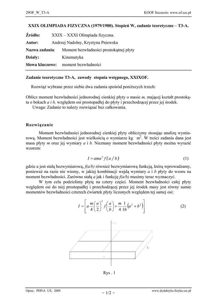 29OF_W_T3-A KOOF Szczecin: www.of.szc.pl XXIX OLIMPIADA FIZYCZNA (1979/1980). Stopień W, zadanie teoretyczne – T3-A. Źródło: XXIX – XXXI Olimpiada fizyczna. Autor: Andrzej Nadolny, Krystyna Pniewska Nazwa zadania: Moment bezwładności prostokątnej płyty Działy: Kinematyka Słowa kluczowe: moment bezwładności Zadanie teoretyczne T3-A, zawody stopnia wstępnego, XXIXOF. Rozwiąż wybrane przez siebie dwa zadania spośród poniższych trzech: Oblicz moment bezwładności jednorodnej cienkiej płyty o masie m, mającej kształt prostokąta o bokach a i b, względem osi prostopadłej do płyty i przechodzącej przez jej środek. Uwaga: Zadanie to należy rozwiązać bez całkowania. Rozwiązanie Moment bezwładności jednorodnej cienkiej płyty obliczymy stosując analizę wymiarową. Moment bezwładności jest wielkością o wymiarze kg . m2. W treści zadania dana jest masa płyty m oraz jej wymiary a i b. Nieznany moment bezwładności płyty można wyrazić wzorem: I = ama 2 f ( a / b ) (1) gdzie a jest stałą bezwymiarową, f(a/b) również bezwymiarową funkcją, którą wprowadzamy, ponieważ na razie nie wiemy, w jakiej kombinacji wejdą wymiary a i b płyty do wzoru na moment bezwładności. Zarówno stałą a jak i funkcję f(a/b) musimy teraz wyznaczyć. W tym celu podzielimy płytę na cztery części. Moment bezwładności całej płyty względem osi do niej prostopadłej i przechodzącej przez jej środek masy jest równy sumie momentów bezwładności czterech ćwiartek płyty liczonych względem tej samej osi: ⎡ m ⎛ a ⎞2 I = ⎢a ⎜ ⎟ ⎣⎢ 4 ⎝ 2 ⎠ ⎤ ⎛a⎞ m 1 2 f⎜ ⎟+ a + b2 ⎥ ⎝ b ⎠ 4 16 ⎦⎥ ( ) (2) Rys . 1 Oprac. PDFiA US, 2008 - 1/2 - www.dydaktyka.fizyka.szc.pl 29OF_W_T3-A KO OF Szczecin: www.of.szc.pl Pierwszy wyraz w nawiasie oznacza moment bezwładności ćwiartki płyty względem osi przechodzącej przez jej środek masy. Drugi wyraz uwzględnia fakt, że oś, względem, której chcemy wyznaczyć moment bezwładności, przechodzi przez środek masy całej płyty, odległy od środków masy każdej z ćwiartek o 1 2 a + b2 4 Skorzystaliśmy tu z twierdzenia Steinera. Porównując wzory (1) i (2) otrzymujemy: 2 ⎛a⎞ ⎡ m⎛a⎞ ⎛a⎞ m 1 2 a ma f ⎜ ⎟ = ⎢a ⎜ ⎟ f ⎜ ⎟ + a + b2 b 4 2 b 4 16 ⎝ ⎠ ⎝ ⎠ ⎝ ⎠ ⎢⎣ ( 2 ⎤ )⎥ ⎥⎦ stąd 2 ⎛a⎞ 1 ⎛ b a f ⎜ ⎟ = ⎜⎜1 + 2 ⎝ b ⎠ 12 ⎝ a ⎞ ⎟⎟ ⎠ Szukany moment bezwładności płyty wynosi zatem: I= ( 1 m a2 + b2 12 0-5 pkt Proponowana punktacja Oprac. PDFiA US, 2008 ) - 2/2 - www.dydaktyka.fizyka.szc.pl