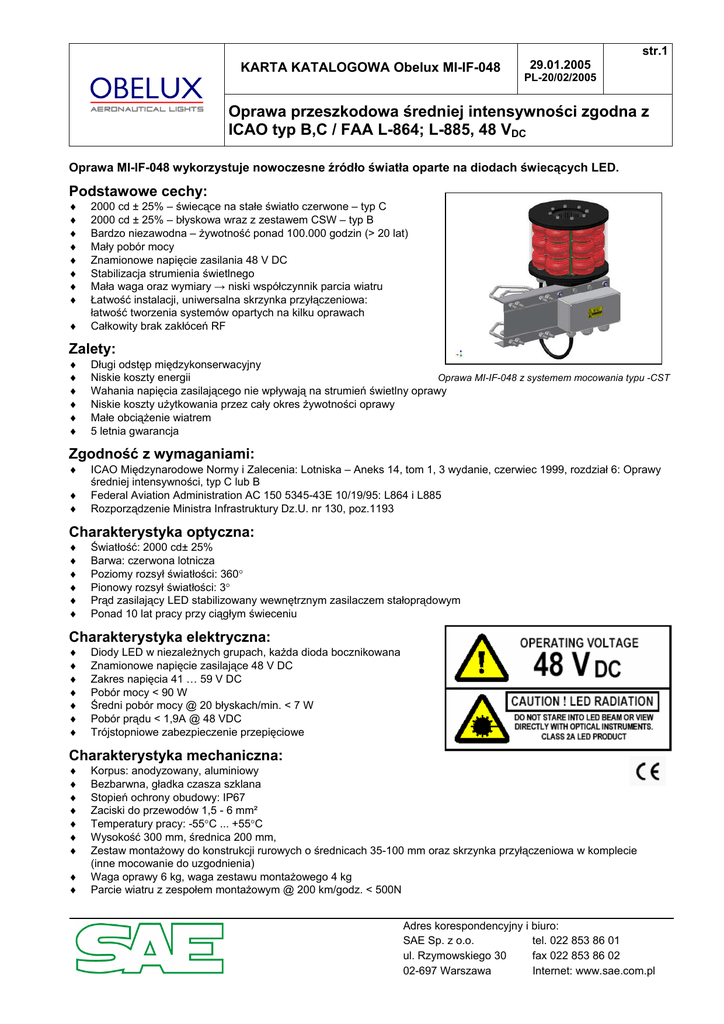 str.1 KARTA KATALOGOWA Obelux MI-IF-048 29.01.2005 PL-20/02/2005 Oprawa przeszkodowa średniej intensywności zgodna z ICAO typ B,C / FAA L-864; L-885, 48 VDC Oprawa MI-IF-048 wykorzystuje nowoczesne źródło światła oparte na diodach świecących LED. Podstawowe cechy: ♦ ♦ ♦ ♦ ♦ ♦ ♦ ♦ ♦ 2000 cd ± 25% – świecące na stałe światło czerwone – typ C 2000 cd ± 25% – błyskowa wraz z zestawem CSW – typ B Bardzo niezawodna – żywotność ponad 100.000 godzin (> 20 lat) Mały pobór mocy Znamionowe napięcie zasilania 48 V DC Stabilizacja strumienia świetlnego Mała waga oraz wymiary → niski współczynnik parcia wiatru Łatwość instalacji, uniwersalna skrzynka przyłączeniowa: łatwość tworzenia systemów opartych na kilku oprawach Całkowity brak zakłóceń RF Zalety: ♦ ♦ ♦ ♦ ♦ ♦ Długi odstęp międzykonserwacyjny Niskie koszty energii Oprawa MI-IF-048 z systemem mocowania typu -CST Wahania napięcia zasilającego nie wpływają na strumień świetlny oprawy Niskie koszty użytkowania przez cały okres żywotności oprawy Małe obciążenie wiatrem 5 letnia gwarancja Zgodność z wymaganiami: ♦ ♦ ♦ ICAO Międzynarodowe Normy i Zalecenia: Lotniska – Aneks 14, tom 1, 3 wydanie, czerwiec 1999, rozdział 6: Oprawy średniej intensywności, typ C lub B Federal Aviation Administration AC 150 5345-43E 10/19/95: L864 i L885 Rozporządzenie Ministra Infrastruktury Dz.U. nr 130, poz.1193 Charakterystyka optyczna: ♦ ♦ ♦ ♦ ♦ ♦ Światłość: 2000 cd± 25% Barwa: czerwona lotnicza Poziomy rozsył światłości: 360° Pionowy rozsył światłości: 3° Prąd zasilający LED stabilizowany wewnętrznym zasilaczem stałoprądowym Ponad 10 lat pracy przy ciągłym świeceniu Charakterystyka elektryczna: ♦ ♦ ♦ ♦ ♦ ♦ ♦ Diody LED w niezależnych grupach, każda dioda bocznikowana Znamionowe napięcie zasilające 48 V DC Zakres napięcia 41 … 59 V DC Pobór mocy < 90 W Średni pobór mocy @ 20 błyskach/min. < 7 W Pobór prądu < 1,9A @ 48 VDC Trójstopniowe zabezpieczenie przepięciowe Charakterystyka mechaniczna: ♦ ♦ ♦ ♦ ♦ ♦ ♦ ♦ ♦ Korpus: anodyzowany, aluminiowy Bezbarwna, gładka czasza szklana Stopień ochrony obudowy: IP67 Zaciski do przewodów 1,5 - 6 mm² Temperatury pracy: -55°C ... +55°C Wysokość 300 mm, średnica 200 mm, Zestaw montażowy do konstrukcji rurowych o średnicach 35-100 mm oraz skrzynka przyłączeniowa w komplecie (inne mocowanie do uzgodnienia) Waga oprawy 6 kg, waga zestawu montażowego 4 kg Parcie wiatru z zespołem montażowym @ 200 km/godz. < 500N Adres korespondencyjny i biuro: SAE Sp. z o.o. tel. 022 853 86 01 ul. Rzymowskiego 30 fax 022 853 86 02 02-697 Warszawa Internet: www.sae.com.pl str.2 KARTA KATALOGOWA Obelux MI-IF-048 29.01.2005 PL-20/02/2005 Oprawa przeszkodowa średniej intensywności zgodna z ICAO typ B,C / FAA L-864; L-885, 48 VDC Opcje i inne wykonania: ♦ ♦ ♦ ♦ ♦ ♦ Sterownik błysków CSW Sterownik błysków umożliwiający synchronizację błysków opraw zainstalowanych na różnych obiektach za pomocą GPS-UTC Zasilacz 90 … 230 V AC 1N / 48 V DC Zasilacz 300 …400 V AC 3N / 48 V DC System zasilania oprawy z baterii słonecznych (SPOL) Zestawy montażowe Zestaw montażowy CST wykonany jest ze stali galwanizowanej; AISI316 Oprawa MI-IF-48 jest oprawą przeszkodową wykorzystującą diody świecące LED. Zasady podłączenia i okablowania są takie jak dla typowych żarówkowych opraw oświetleniowych. Należy jednak zwrócić uwagę na prawidłową biegunowość przy zasilaniu DC. Skrzynka przyłączeniowa wyposażona jest w zaciski montażowe oraz posiada zabezpieczanie przepięciowe Zaleca się: Przewód niebieski Przewód czarny + Żółto/zielony - PE Podłączenia powinny być zabezpieczone 6A lub 10A bezpiecznikami lub wyłącznikiem (krzywa C). Skrzynka zaciskowa oprawy Obelux MI-IF-048 Wskazówki montażowe: Dławnica kablowa: M20 podłączenie oprawy, średnica kabla:8 …13 mm Dławnica kablowa: M25 x 2 wejście/wyjście kabli zasilających, średnica kabla: 11 … 17 mm Przekrój przewodu: max 6 mm² Zalecany przewód: 2x1,5+1,5 lub 2x2,5+2,5mm² Schemat połączeń w skrzynce Przykładowy kod zamówienia: Obelux MI-IF-048 Producent zastrzega sobie prawo zmiany danych technicznych bez uprzedzenia Adres korespondencyjny i biuro: SAE Sp. z o.o. tel. 022 853 86 01 ul. Rzymowskiego 30 fax 022 853 86 02 02-697 Warszawa Internet: www.sae.com.pl