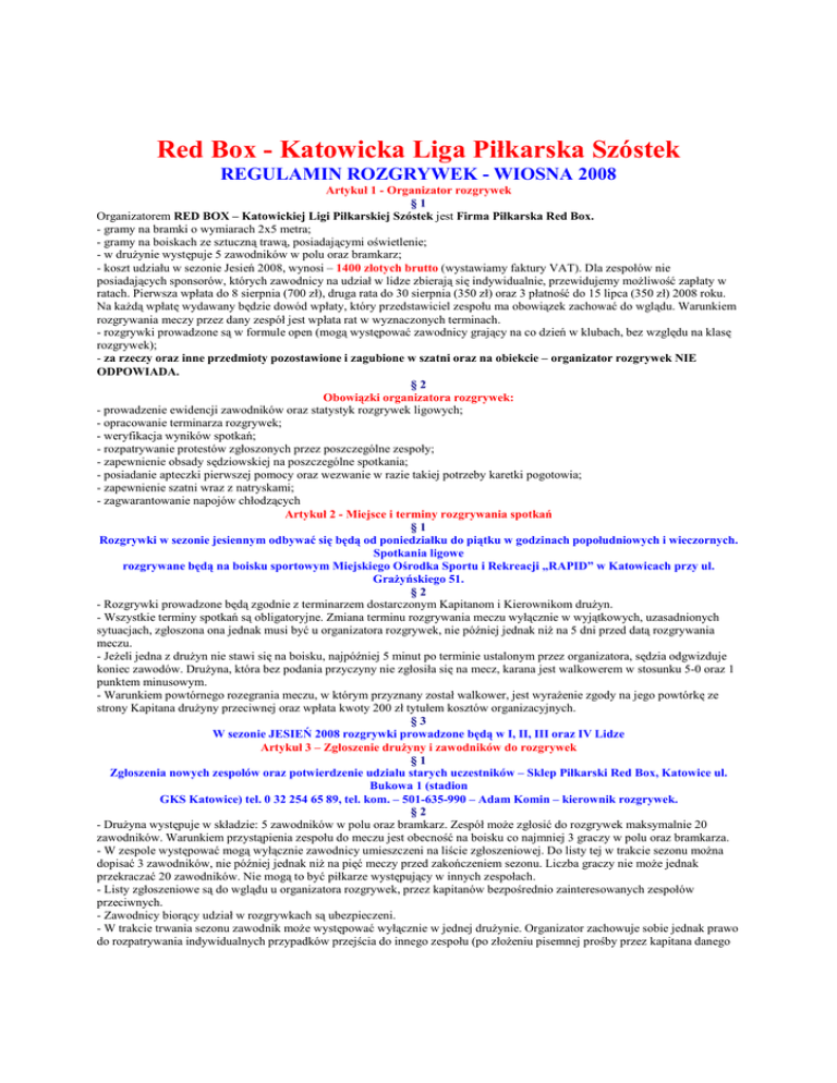 Red Box - Katowicka Liga Piłkarska Szóstek REGULAMIN ROZGRYWEK - WIOSNA 2008 Artykuł 1 - Organizator rozgrywek §1 Organizatorem RED BOX – Katowickiej Ligi Piłkarskiej Szóstek jest Firma Piłkarska Red Box. - gramy na bramki o wymiarach 2x5 metra; - gramy na boiskach ze sztuczną trawą, posiadającymi oświetlenie; - w druŜynie występuje 5 zawodników w polu oraz bramkarz; - koszt udziału w sezonie Jesień 2008, wynosi – 1400 złotych brutto (wystawiamy faktury VAT). Dla zespołów nie posiadających sponsorów, których zawodnicy na udział w lidze zbierają się indywidualnie, przewidujemy moŜliwość zapłaty w ratach. Pierwsza wpłata do 8 sierpnia (700 zł), druga rata do 30 sierpnia (350 zł) oraz 3 płatność do 15 lipca (350 zł) 2008 roku. Na kaŜdą wpłatę wydawany będzie dowód wpłaty, który przedstawiciel zespołu ma obowiązek zachować do wglądu. Warunkiem rozgrywania meczy przez dany zespół jest wpłata rat w wyznaczonych terminach. - rozgrywki prowadzone są w formule open (mogą występować zawodnicy grający na co dzień w klubach, bez względu na klasę rozgrywek); - za rzeczy oraz inne przedmioty pozostawione i zagubione w szatni oraz na obiekcie – organizator rozgrywek NIE ODPOWIADA. §2 Obowiązki organizatora rozgrywek: - prowadzenie ewidencji zawodników oraz statystyk rozgrywek ligowych; - opracowanie terminarza rozgrywek; - weryfikacja wyników spotkań; - rozpatrywanie protestów zgłoszonych przez poszczególne zespoły; - zapewnienie obsady sędziowskiej na poszczególne spotkania; - posiadanie apteczki pierwszej pomocy oraz wezwanie w razie takiej potrzeby karetki pogotowia; - zapewnienie szatni wraz z natryskami; - zagwarantowanie napojów chłodzących Artykuł 2 - Miejsce i terminy rozgrywania spotkań §1 Rozgrywki w sezonie jesiennym odbywać się będą od poniedziałku do piątku w godzinach popołudniowych i wieczornych. Spotkania ligowe rozgrywane będą na boisku sportowym Miejskiego Ośrodka Sportu i Rekreacji „RAPID” w Katowicach przy ul. GraŜyńskiego 51. §2 - Rozgrywki prowadzone będą zgodnie z terminarzem dostarczonym Kapitanom i Kierownikom druŜyn. - Wszystkie terminy spotkań są obligatoryjne. Zmiana terminu rozgrywania meczu wyłącznie w wyjątkowych, uzasadnionych sytuacjach, zgłoszona ona jednak musi być u organizatora rozgrywek, nie później jednak niŜ na 5 dni przed datą rozgrywania meczu. - JeŜeli jedna z druŜyn nie stawi się na boisku, najpóźniej 5 minut po terminie ustalonym przez organizatora, sędzia odgwizduje koniec zawodów. DruŜyna, która bez podania przyczyny nie zgłosiła się na mecz, karana jest walkowerem w stosunku 5-0 oraz 1 punktem minusowym. - Warunkiem powtórnego rozegrania meczu, w którym przyznany został walkower, jest wyraŜenie zgody na jego powtórkę ze strony Kapitana druŜyny przeciwnej oraz wpłata kwoty 200 zł tytułem kosztów organizacyjnych. §3 W sezonie JESIEŃ 2008 rozgrywki prowadzone będą w I, II, III oraz IV Lidze Artykuł 3 – Zgłoszenie druŜyny i zawodników do rozgrywek §1 Zgłoszenia nowych zespołów oraz potwierdzenie udziału starych uczestników – Sklep Piłkarski Red Box, Katowice ul. Bukowa 1 (stadion GKS Katowice) tel. 0 32 254 65 89, tel. kom. – 501-635-990 – Adam Komin – kierownik rozgrywek. §2 - DruŜyna występuje w składzie: 5 zawodników w polu oraz bramkarz. Zespół moŜe zgłosić do rozgrywek maksymalnie 20 zawodników. Warunkiem przystąpienia zespołu do meczu jest obecność na boisku co najmniej 3 graczy w polu oraz bramkarza. - W zespole występować mogą wyłącznie zawodnicy umieszczeni na liście zgłoszeniowej. Do listy tej w trakcie sezonu moŜna dopisać 3 zawodników, nie później jednak niŜ na pięć meczy przed zakończeniem sezonu. Liczba graczy nie moŜe jednak przekraczać 20 zawodników. Nie mogą to być piłkarze występujący w innych zespołach. - Listy zgłoszeniowe są do wglądu u organizatora rozgrywek, przez kapitanów bezpośrednio zainteresowanych zespołów przeciwnych. - Zawodnicy biorący udział w rozgrywkach są ubezpieczeni. - W trakcie trwania sezonu zawodnik moŜe występować wyłącznie w jednej druŜynie. Organizator zachowuje sobie jednak prawo do rozpatrywania indywidualnych przypadków przejścia do innego zespołu (po złoŜeniu pisemnej prośby przez kapitana danego zespołu na ręce organizatora rozgrywek), nie później jednak niŜ po rozegraniu w danym zespole 2 meczy lub w sytuacji, gdy druŜyna w której występował wycofała się z rozgrywek. Artykuł 4 – System rozgrywek §1 - W kaŜdej lidze zespoły rozgrywać będą swoje spotkania systemem „kaŜdy z kaŜdym”. - Punktacja – zwycięstwo: 3 pkt., remis: 1 pkt., poraŜka: 0 pkt., walkower: -1 kpt. - O miejscu w tabeli decyduje: większa ilość zdobytych punktów, bezpośrednie spotkanie, stosunek bramkowy, większa ilość strzelonych bramek. W sytuacji gdy więcej druŜyn niŜ dwie zakończy rozgrywki z tą samą ilością punktów, o miejscu w tabeli decyduje mała tabelka pomiędzy zainteresowanymi zespołami, uwzględniająca wyłącznie spotkania pomiędzy nimi. - W przypadku wcześniejszego wycofania się druŜyny z rozgrywek, spotkania z jej udziałem zostaną anulowane. §2 DruŜyna, która 3 razy odda walkower, zostaje automatycznie usunięta z rozgrywek ligowych. Artykuł 5 – Protesty §3 Kierownicy poszczególnych zespołów posiadają prawo do wnoszenia protestów dotyczących ściśle przebiegu rozgrywek. Protesty przyjmowane będą jedynie w formie pisemnej, najpóźniej 30 minut po zakończeniu danego spotkania. Wyjątek stanowi protest, którego przedmiotem jest „gra zawodnika nieuprawnionego”. Wówczas czas na złoŜenie ewentualnego protestu wynosi 24 godziny od momentu zakończenia przedmiotowego spotkania. Warunkiem przyjęcia protestu jest kaucja w wysokości 100 zł, zwracana, gdy protest był uzasadniony. Artykuł 6 – Nagrody i wyróŜnienia na zakończenie sezonu N