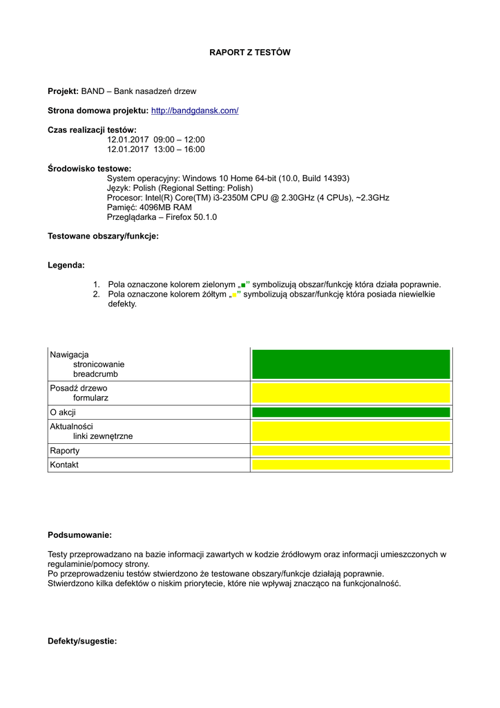 Stwierdzono kilka defektów o niskim priorytecie, które nie wpływaj znacząco na funkcjonalność.