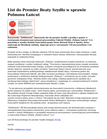 List do Premier Beaty Szydło w sprawie Polmosu Łańcut Rzeszowska "Solidarność" skierowała list do premier Szydło z prośbą o pomoc w rozwiązaniu dramatycznej sytuacji pracowników Fabryki Wódek „Polmos Łańcut” S.A. powstałej w wyniku działań francuskiej grupy Marie Brizard Wine & Spirits, które zmierzają do likwidacji zakładu, dającego pracę i utrzymanie 159 pracownikom i ich rodzinom. Związek zwraca uwagę, że fabryka założona 250 lat temu przetrwała dwie wojny światowe i rządy komunistyczne. Niestety następujące w ostatnich latach zmiany właścicieli i nieracjonalne decyzje pogrążyły tę znakomitą firmę. Kilka miesięcy temu francuski właściciel „Polmosu” poinformował związki zawodowe, że zamierza wygasić produkcję i zwolnić większość załogi. "Pracownicy reprezentowani przez związki zawodowe wykazali wolę konstruktywnego dialogu, szukania rozwiązań pozwalających na utrzymanie produkcji bardzo dobrych, znanych na rynku wyrobów. Samorząd Gminy Łańcut, powiat łańcucki oraz samorząd województwa podkarpackiego zadeklarowali daleko idącą i wymierną pomoc dla francuskiego właściciela fabryki, aby tylko utrzymać produkcję i zatrudnienie pracowników. Załoga, przekonana o możliwości dobrego funkcjonowania „Polmosu” i utrzymania się na rynku, wyraziła gotowość wykupienia firmy. Niestety dobra wola załogi i lokalnej społeczności spotkała się z niechęcią francuskiego właściciela"- piszą związkowcy i wyjaśniają, że z przeprowadzonych rozmów wynika, że celem MBW&S jest wyeliminowanie fabryki z rynku. - To nie pierwszy przypadek niewywiązywania się francuskich inwestorów z deklaracji składanych przed wejściem na polski rynek - mówi Roman Jakim, przewodniczący rzeszowskiej "Solidarności" Złe praktyki stosuje Orange Polska, podobnie kilka lat temu rząd zdecydował o zakupie śmigłowców dla Lotniczego Pogotowia Ratunkowego, francuska oferta zakładała utw orzenie nowych miejsc pracy w Polsce. Tak jednak się nie stało! Aktualnie trwają negocjacje umowy offsetowej z kolejnym francuskim koncernem Airbus Helikopters, dotyczące ewentualnego zakupu francuskich śmigłowców dla polskiej armii - przypomina szef regionu. "Solidarność" ZR Rzeszowskiego biorąc pod uwagę dotychczasowe złe doświadczenia związane z wiarygodnością francuskich inwestorów, prosi szefową rządu o "rozważenie możliwości zerwania rozmów z Airbus Helikopters w przypadku niezawarcia porozumienia z protestującymi pracownikami w Łańcuckiej Fabryce Wódek „Polmos Łańcut” S.A.". List ZR Rzeszowskiego do premier Szydło dostępny TUTAJ red.hd Źródło: solidarnosc.org.pl Foto: solidarnosc.org.pl
