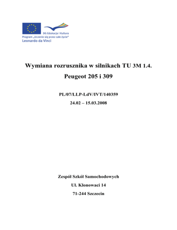 Wymiana rozrusznika w silnikach TU 3M 1.4. Peugeot 205 i 309 PL/07/LLP-LdV/IVT/140359 24.02 – 15.03.2008 Zespół Szkół Samochodowych Ul. Klonowaci 14 71-244 Szczecin W takie silniki wyposaŜono samochody produkcji francuskiej jak: Peugeot 205 oraz Peugeot 309. Pierwsza rzecz, jaką naleŜy zrobić przy danej czynności jest odłączenie zacisku plusa od akumulatora. Kolejnym krokiem, aby dostać się do rozrusznika jest wyjęcie puszki z filtrem powietrza. śeby tego dokonać potrzebne jest wcześniejsze odczepienie rury od kolektora wydechowego oraz węŜyka podciśnieniowego- odczepić zaczep węŜyka i zdjąć go z obudowy klapki termostatu. DemontaŜ górnej części (przejścia od puszki z filtrem do układu wtryskowego) nie jest konieczny. Po tych czynnościach mamy dostęp do rozrusznika. Część ta jest umiejscowiona dokładnie pod puszką z filtrem. Dolne mocowanie puszki filtra przykręcone jest do rozrusznika. Następnie odłączamy przewód od sprzęgła rozrusznika . Kluczem 13, płaskim lub oczkowym, odkręcamy dwa przewody, które zasilają rozrusznik. Znajdują się one w górnej części rozrusznika, na wysokości sprzęgła rozrusznika (zaznaczone kółkiem na zdjęciu). NaleŜy okręcić dwie śruby (13, najlepiej grzechotka), które mocują rozrusznik do bloku silnika. Dojście do nich jest od strony osi samochodu. Jedna jest dobrze widoczna, drugą niestety trzeba znaleźć ręką. Do tych śrub przymocowany jest uchwyt puszki filtra powietrza, który odejdzie wraz ze śrubami. Odkręcamy trzecia śrubę mocującą rozrusznik, która znajduje się po drugiej stronie kołnierza przy rozruszniku, od strony akumulatora. W ten sposób rozrusznik mamy odkręcony, moŜna go wyciągnąć z pojazdu. Zdjęcia wymontowanego rozrusznika, z ponumerowanymi w ten sam sposób śrubami i zaznaczonymi miejscami, gdzie przykręcone są kable zasilające: MontaŜ nowego rozrusznika odbywa się dokładnie odwrotnie jak jego demontaŜ. Wkładamy nowy rozrusznik na miejsce starego i przykręcamy śrubę kluczem 13( grzechotka) (na zdjęciu nr3). Przykręcamy dwie śruby mocujące rozrusznik do bloku silnika, razem z uchwytem puszki filtra powietrza. Płaskim kluczem 13 mocujemy kable zasilające do rozrusznika. Podłączamy przewód do sprzęgła rozrusznika . Następnie montujemy puszkę filtra powietrza. Montujemy rurę kolektora wydechowego i węŜyk podciśnieniowy. Pozostaje podłączyć plus do akumulatora i moŜna uruchomić silnik. Schemat budowy rozrusznika dołączony do instrukcji naprawy