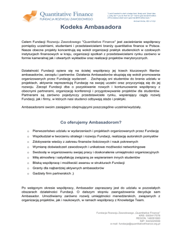 Kodeks Ambasadora Celem Fundacji Rozwoju Zawodowego "Quantitative Finance" jest zacieśnianie współpracy pomiędzy uczelniami, studentami i przedstawicielami branży quantitative finance w Polsce. Nasze obecne projekty koncentrują się wokół organizacji praktyk studenckich w czołowych instytucjach finansowych w kraju, organizacji spotkań z przedstawicielami rynku zarówno w formie kameralnej jak i otwartych wykładów oraz realizacji projektów merytorycznych. Działalność Fundacji opiera się na ścisłej współpracy jej trzech kluczowych filarów: ambasadorów, zarządu i partnerów. Działania Ambasadorów skupiają się wokół promowania organizowanych przez Fundację wydarzeń . Zachęcają oni studentów do brania udziału w projektach, aktywnie reprezentują Fundację na swojej uczelni oraz przyczyniają się do jej rozwoju. Zarząd Fundacji dba o pozyskiwanie nowych i kontunuowanie współpracy z obecnymi partnerami, organizację konferencji i przygotowywanie projektów dla studentów. Partnerami są zarówno pojedynczy przedstawiciele rynku, wspierający ciągły rozwój Fundacji, jak i firmy, w których nasi studenci odbywają staże i praktyki. Ambasadorami swoim zasięgiem obejmującymi poszczególne uczelnie/wydziały. Co oferujemy Ambasadorom? o Pierwszeństwo udziału w wydarzeniach i projektach organizowanych przez Fundację o Współudział w tworzeniu strategii i rozwoju Fundacji, realizację autorskich pomysłów o Zdobywanie wiedzy z zakresu finansów ilościowych i nauk pokrewnych o Wymianę doświadczeń zawodowych i unikatowe możliwości networkingowe o Swobodę w organizowaniu swojej pracy i doskonalenie umiejętności organizacyjnych o Miłą atmosferę i satysfakcję związaną ze wspieraniem innych studentów o Bliską współpracę i możliwość awansu w strukturach Fundacji o Granty dla najbardziej aktywnych ambasadorów o Gadżety firm partnerskich ;) Po wstępnym okresie współpracy, Ambasador zapraszany jest do udziału w pozostałych obszarach działalności Fundacji. O dalszym stopniu zaangażowania decyduje sam Ambasador. Umożliwiamy zarówno rozwój umiejętności menedżerskich, związanych z organizacją projektów, jak i naukowych, w ramach współpracy z Knowledge Team. Fundacja Rozwoju Zawodowego „Quantitative Finance” KRS: 0000417578 REGON: 146091660 NIP: 5423225559 e-mail: [email protected] Co charakteryzuje dobrego Ambasadora? o Zaangażowanie w działalność fundacyjną o Chęć do dalszego rozwoju w dziedzinie finansów ilościowych o Rozeznanie w strukturach władz uczelni i organizacji samorządowych o Umiejętności związane z dobrą organizacją pracy o Rozumienie zasad działania Fundacji o Sumienność, punktualność i skuteczność Czym zajmuje się Ambasador? o Podnoszeniem świadomości istnienia Fundacji i propagowaniem jej idei w ramach obszarów działalności do których należy o Zainteresowaniem i poszerzaniem bazy studentów w ramach swojego obszaru (zapraszanie do Fundacyjnego newslettera, polubienia strony na Facebook’u) o Promowaniem i aktywnym zachęcaniem studentów do brania udziału w konferencjach, wydarzeniach i projektach organizowanych przez Fundację o Identyfikowaniem wydarzeń i projektów w obszarze działalności Ambasadora umożliwiających promocję Fundacji poprzez patronat, prezentację lub wykład. W jaki sposób przebiega współpraca? o Podstawową formą działalności Ambasadora jest promowanie Fundacji poprzez zaangażowanie w ramach obszaru działalności o Bieżące cele i postępy omawiane są zarówno wspólnie z Koordynatorem Ambasadorów i pozostałymi Ambasadorami, jak i indywidualnie, w zależności od konkretnych przypadków o Spotkania integracyjne dla wszystkich Ambasadorów o Głównymi środkami kontaktu są grupa na Facebooku, lista mailingowa i telefon o Współpraca Ambasadora z Fundacją obejmuje okres jednego roku akademickiego Fundacja Rozwoju Zawodowego „Quantitative Finance” KRS: 0000417578 REGON: 146091660 NIP: 5423225559 e-mail: [email protected] Jeśli jesteś zainteresowany działaniem w Fundacji w charakterze ambasadora zapraszamy do wysłania swojego CV na adres: [email protected] z dopiskiem „Ambasador”. Jeśli chcesz być uczestnikiem naszych projektów oraz korzystać z naszych inicjatyw zapraszamy do subskrypcji (http://quantitativefinance.org.pl/) newslettera oraz na polubienia naszej naszego stronie profilu na internetowej facebooku: (https://www.facebook.com/FundacjaRozwojuZawodowegoQuantitativeFinance). Fundacja Rozwoju Zawodowego „Quantitative Finance” KRS: 0000417578 REGON: 146091660 NIP: 5423225559 e-mail: [email protected]