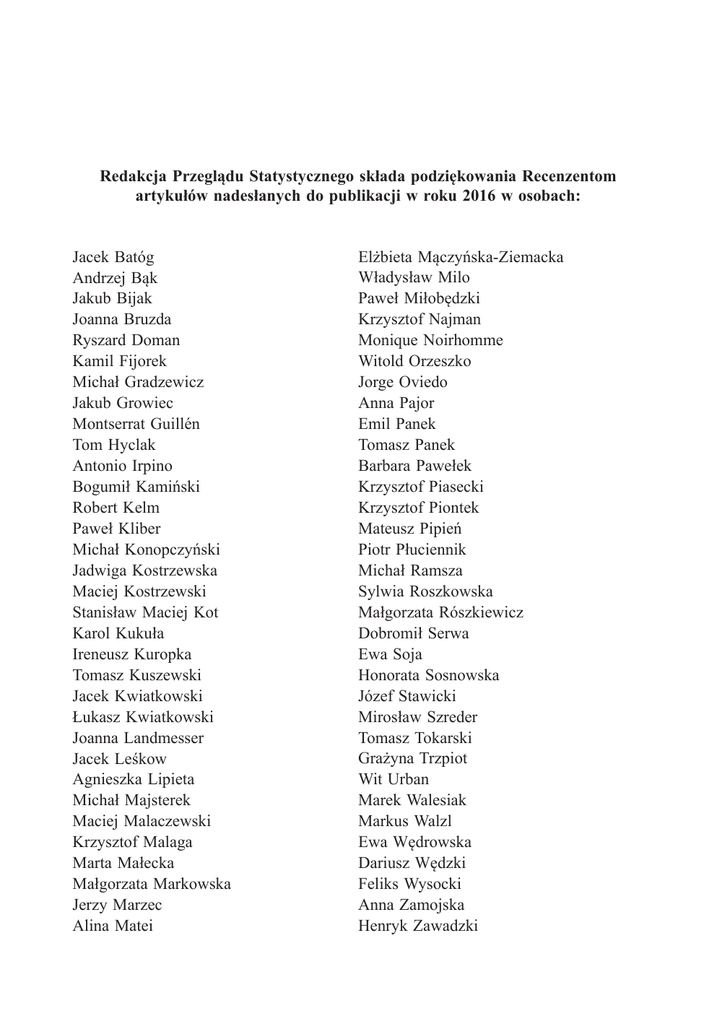 Redakcja Przeglądu Statystycznego składa podziękowania Recenzentom artykułów nadesłanych do publikacji w roku 2016 w osobach: Jacek Batóg Andrzej Bąk Jakub Bijak Joanna Bruzda Ryszard Doman Kamil Fijorek Michał Gradzewicz Jakub Growiec Montserrat Guillén Tom Hyclak Antonio Irpino Bogumił Kamiński Robert Kelm Paweł Kliber Michał Konopczyński Jadwiga Kostrzewska Maciej Kostrzewski Stanisław Maciej Kot Karol Kukuła Ireneusz Kuropka Tomasz Kuszewski Jacek Kwiatkowski Łukasz Kwiatkowski Joanna Landmesser Jacek Leśkow Agnieszka Lipieta Michał Majsterek Maciej Malaczewski Krzysztof Malaga Marta Małecka Małgorzata Markowska Jerzy Marzec Alina Matei Elżbieta Mączyńska-Ziemacka Władysław Milo Paweł Miłobędzki Krzysztof Najman Monique Noirhomme Witold Orzeszko Jorge Oviedo Anna Pajor Emil Panek Tomasz Panek Barbara Pawełek Krzysztof Piasecki Krzysztof Piontek Mateusz Pipień Piotr Płuciennik Michał Ramsza Sylwia Roszkowska Małgorzata Rószkiewicz Dobromił Serwa Ewa Soja Honorata Sosnowska Józef Stawicki Mirosław Szreder Tomasz Tokarski Grażyna Trzpiot Wit Urban Marek Walesiak Markus Walzl Ewa Wędrowska Dariusz Wędzki Feliks Wysocki Anna Zamojska Henryk Zawadzki