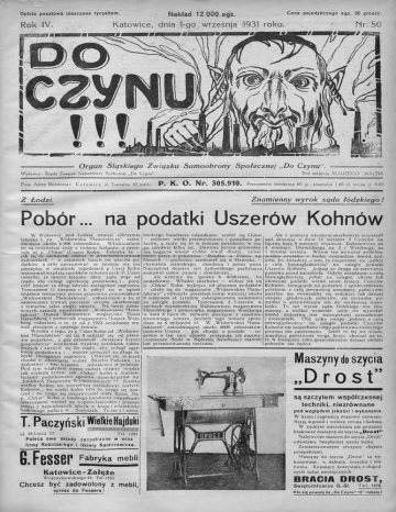Nakład 1 2 000 egz. Opłata pocztowa uiszczona ryczałtem. Rok IV. Cena pojedyńczego egz. 30 groszy. Katowice, dnia 1-go września 1931 roku. , - Mn 50 m m I ä f i t i iii ■’ »ESM m » €& i w 1 O r g a n Ś lą s k ie g o Z w ią z k u S a m o o b r o n y S p o łe c z n e j ,,D o C z y n u “ . W ydawca: Śląski Związek Samoobrony Społecznej ,,Do Czynu“ . Pryw. Adres Redaktora: K a t o w ic e , ul. Teatralna 10 fpait). Pod redakcją A L O J Z E G O P. K. O. Nr. 305.910. MACHA Prcnu merata miesięczna 60 gr , kwartalna 1,80 zł, roczna =k 6.00 Z n a m ie n n y w y r o k s ą d u łó d z k ie g o ! Z Ł o d z i. Pobór... na podatki Uszerów Kohnów W W id z e w ie p o d Ł o d z ią is tn ie je o lb rz y m ia fa b ry k a t. zw. „W id z e w s k a M a n u fa k tu ra ", z a tru d n ia ją c a o k o ło 6 000 r o b o tn ik ó w . W ła ś c ic ie la m i jej są o c z y w iś c ie ży d y z ro d z in y K o h n ó w , a preze suje jej p. O s k a r" (U szer) K o łin . F a b ry k a ta — ja k się to zazw yczaj zdarza w p rz e d s ię b io rs tw a c h ż y d o w s k ic h — w o s ta tn ic h la ta c h n ie p ła c iła p o d a tk ó w , a żeby u p o z o ro w a ć , że is to tn ie nie m a pienię d zy, w o s ta tn ic h ty g o d n ia c h p. U szer K o h n w s tr z y m a ł w y p ła tę z a ro b k ó w ro b o tn ic z y c h . P. U szer tw ie rd z i, że in te re s k ie p s k o idzie, żąda w ię c od rzą d u , aby c o fn ą ł egzekucję p o d a tk o w ą i... p o rę c z y ł jeszcze za d łu g i fa b ry k i, zacią gn ię te zagranicą. T ym cza se m 11 s ie rp n ia r. b. o d b y ł się w sądzie łó d z k im se n sacyjn y proces p rz e c iw k o p ra c o w n ik o m „W id z e w s k ie j M a n u fa k tu r y “ , o s k a rż o n y m o to, iż s a m o w o ln ie z ry w a li pieczęcie u rz ę d u ska rb o w e g o z to w a ró w , ja k ie u le g ły zajęciu. N a la w ie o s k a r ż o n y c h z a s ie d li w ic e d y re k to r „W id z e w s k ie j M a n u fa k tu r y " D a w id R a b in o w ic z , m a g a z y n ie r E ljasz H e rs c h b e rg i p o m o c n ik m a g a zyn ie ra M o s z e k W e isberg, o s k a rż e n i o to , że od r. 1923 ś w ia d o m ie z ry w a li pieczęcie z zajętego to w a ru . W y n ik a z tego, że p. U sze r K o h n od „W id z e w s k ie j M a n u fa k tu r y " o d la t 8 u c h y la ł się od p ła c e n ia p o d a tk ó w , a gdy p rz e s z e d ł „ś w ia to w y kry z y s g o s p o d a rc z y " w s trz y m a ł w y p ła tę z a ro b k ó w r o b o t n ic z y c h i z w r ó c ił się do rząd u, aby c o fn ą ł egze k u c ję p o d a tk o w ą i ... jeszcze p o rę c z y ł za d łu g i fa b ry k i, zacią g n ię te zagranicą. O k a z u je się, że je żeli c h o d z i o o b o w ią z k i w ob ec S k a rb u P a ń stw a , to ż y d o s tw o — bez w y ją tk u - je d n a k o w o je p o jm u je . P o d ty m w zg lę d e m n ie m a żadnej ró ż n ic y m ię d zy ta k w ie lk im żydem , ja k „ O s k a r ” K o h n , a „m a n ip u la c ja m i" p o d a tk o w e m i a g e n tó w - d o m o k rą ż c ó w np. „Ł ó d z k ic h E k s p o rtó w W łó k ie n n ic z y c h " !?! Z resztą w ie lk ie K o h n y n ie p o trz e b u ją n a ś la d o w a ć m a ły c h K ohn ó w ..., bo w ie lk i K o h n r o b i to, czego się n a u c z y ł i do czego się p rz y z w y c z a ił m a ły K o h n . N p. p. „O s k a r" K o h n z biedne go h a n d la rz a o d p a d k a m i fa b ry c z n e m i w y r ó s ł n a w s p ó łw ła ś c ic ie la i prezesa je d n e j z n a jw ię k s z y c h fa b ry k w k ra ju i w ła ś c ic ie la b a jk o w e g o p a ła c u w ... S o p o ta c h . T o też z Uszera ul. 1 6 -Lip ca 17. Poleca swe bie d n e g o h a n d la rz a o d p a d k a m i, z r o b ił się O s k a r — m iljo n e r, w ie lk i p rz e m y s ło w ie c i posiada cz p a ła c ó w , a s ta ło się to w je d n e m p o k o le n iu , w c ią gu zaledw ie k ilk u lat. D a w n ie j proces g ro m a d ze n ia b o g a c tw w ś ró d ż y d ó w t r w a ł dłużej... c c n a jm n ie j p r z e z 2 p o k o l e n i a . R za d ko w P o lsce np. H e n o c h — p a c h c ia rz z a m ie n ia ł się w H e n ry k a — o b y w a te la zie m skie g o , d zie d zica i ja śn ie pana. N a jczę ście j d o p ie ro syn żyd o w s k ie g o p a c h c ia rz a z o s ta w a ł, ja śn ie panem i d zie d zice m .... A le w ró ć m y do s p ra w y b. d e lik a tn e j,.. bo p o d a tk o w e j. W ła d z e sk a rb o w e — w id z ą c ja k się p. „O s k a r" K o h n w y k rę c a od p ła c e n ia p o d a tk ó w — u d a ły się do m a g a zyn ó w „W id z e w s k ie j M a n u fa k tu ry " i o b ło ż y ły aresztem to w a r w a rto ś c i o k o ło 9 m iljo n ó w z ł. ty tu łe m zabezpieczenia n a le żn o ści za z a le g łe p o d a tk i. T ym czasem 3 U szerów w o so b a ch w ic e d y re k to ra R a b in o w ic z a , m a gazyniera H e rsch b e rg a i p o m o c n ik a m agazyniera W e isb e rg a w d n iu 6 lip c a rb. z e rw a ło pieczęcie z zasekw es tro w a n e g o to w a ru , poczem tego to w a ru sprze da n o za 6 m iljo n ó w z ł. W „W id z e w s k ie j M a n u fa k tu rz e ", z a tru d n ia ją c e j o k o ło 6000 ro b o tn ik ó w , p a n o w ie U sze ry — gdy c h o d z i o p o d a tk i — z u p e łn ie w ten sam sposób p o stę p u ją , ja k n a jz w y czajniejsze S ru le w B ę d zin ie , h a n d lu ją c y s ta re m i lu b p rz e n ic o w a n e m i rzeczam i. Tel. 1297. s kł ad y f i rmy R o b i ń s k i e g o zaopatrzone w wina i likiery Kantorowicza. G.Fesser Fabrykamew Katowice - Załęże W o jc ie c h o w s k ie g o 44. Tel.1551 Chcesz być zadowolony z mebli, śpiesz do Fessera! A le z p o m o cą w ła d z o m s k a rb o w y m p rz y s z e d ł sąd, skazując w d n iu 11 s ie rp n ia 3 U sze ró w na łą c z n ą karę 8 m ie się cy w ie z ie n ia : R a b in o w ic z a na 4 m iesiące, H e rs c h b e rg a na 3 