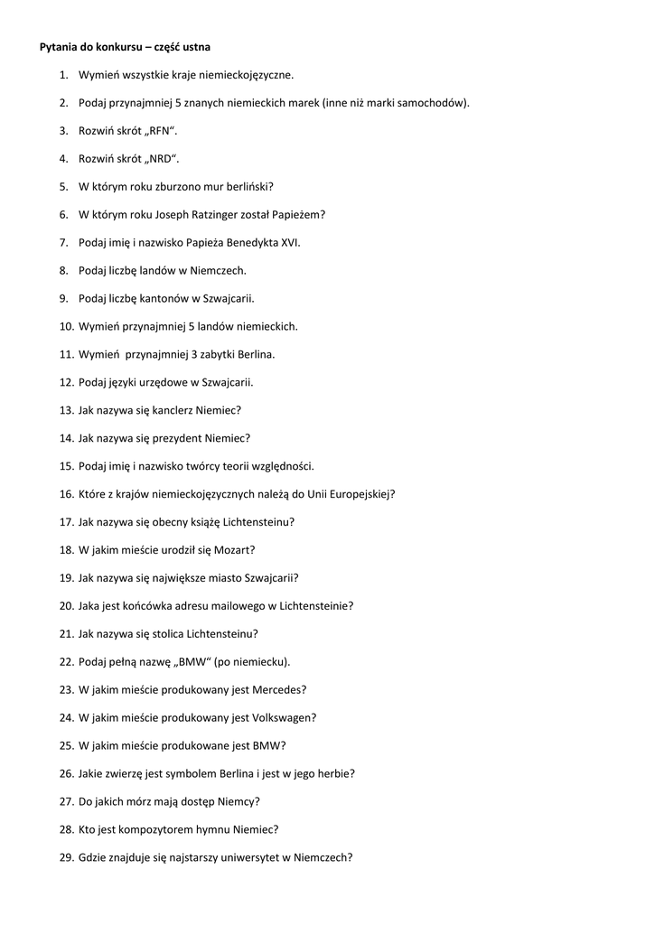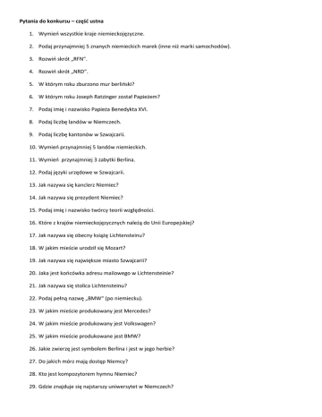 Pytania do konkursu – część ustna 1. Wymieo wszystkie kraje niemieckojęzyczne. 2. Podaj przynajmniej 5 znanych niemieckich marek (inne niż marki samochodów). 3. Rozwio skrót „RFN“. 4. Rozwio skrót „NRD“. 5. W którym roku zburzono mur berlioski? 6. W którym roku Joseph Ratzinger został Papieżem? 7. Podaj imię i nazwisko Papieża Benedykta XVI. 8. Podaj liczbę landów w Niemczech. 9. Podaj liczbę kantonów w Szwajcarii. 10. Wymieo przynajmniej 5 landów niemieckich. 11. Wymieo przynajmniej 3 zabytki Berlina. 12. Podaj języki urzędowe w Szwajcarii. 13. Jak nazywa się kanclerz Niemiec? 14. Jak nazywa się prezydent Niemiec? 15. Podaj imię i nazwisko twórcy teorii względności. 16. Które z krajów niemieckojęzycznych należą do Unii Europejskiej? 17. Jak nazywa się obecny książę Lichtensteinu? 18. W jakim mieście urodził się Mozart? 19. Jak nazywa się największe miasto Szwajcarii? 20. Jaka jest koocówka adresu mailowego w Lichtensteinie? 21. Jak nazywa się stolica Lichtensteinu? 22. Podaj pełną nazwę „BMW“ (po niemiecku). 23. W jakim mieście produkowany jest Mercedes? 24. W jakim mieście produkowany jest Volkswagen? 25. W jakim mieście produkowane jest BMW? 26. Jakie zwierzę jest symbolem Berlina i jest w jego herbie? 27. Do jakich mórz mają dostęp Niemcy? 28. Kto jest kompozytorem hymnu Niemiec? 29. Gdzie znajduje się najstarszy uniwersytet w Niemczech? 30. Jaka jest powierzchnia Niemiec? 31. Jak nazywał się pierwszy kanclerz Niemiec? 32. Kiedy zbudowano mur berlioski? 33. Jak nazywa się największe jezioro Niemiec? 34. Jak nazywają się niemieckie linie lotnicze? 35. Czym zajmuje się Franz Beckenbauer? 36. W jakim mieście odbywają się największe targi książkowe oraz wystawy samochodowe? 37. W jakim mieście w Szwajcarii znajduje się centrum bankowości? 38. Jak nazywa się najbardziej popularny ser szwajcarski? 39. Wymieo co najmniej 3 znanych niemieckich sportowców. 40. W jakim mieście znajduje się słynna gotycka katedra, którą budowano ponad 600 lat? 41. Wymieo co najmniej 3 niemieckie kluby piłkarskie. 42. Jak nazywa się najdłuższa rzeka Szwajcarii? 43. Jak nazywa się siedziba parlamentu niemieckiego? 44. Ile mieszkaoców liczy Berlin. (można pomylid się o 500 tys.) 45. Wymieo przynajmniej 4 marki samochodów produkowanych w Niemczech. 46. Co to jest fondue? I z którego kraju pochodzi? 47. Z jakim niemieckim miastem związane jest święto piwa Oktoberfest? 48. Co piją zazwyczaj Niemcy w godzinach popołudniowych? Kawę, herbatę czy piwo? 49. Stolicą Bawarii jest.......... 50. Jak nazywa się najdłuższa rzeka Niemiec? 51. Jaką branżę reprezentuje koncern Bosch? 52. Jak nazywa się obecny prezydent Niemiec? 53. Kartoffelsalat to …......................... . 54. Jak nazywa się stolica Austrii? 55. Na jakie jednostki administracyjne podzielona jest Szwajcaria? 56. Wymieo wszystkich sąsiadów Niemiec zaczynając od wschodniej granicy? 57. Kto napisał ,,Blaszany bębenek''? 58. Wymieo przynajmniej dwóch niemieckich noblistów XXw. z dziedziny literatury. 59. Co znaczy ,,Kölner Dom'' i gdzie się znajduje? 60. W którym roku i gdzie M. Luter ogłosił swoje 95 tez? 61. Co ile lat wybierany jest Bundestag? 62. Kto na wniosek prezydenta Niemiec powołuje kanclerza Niemiec? 63. Wymieo przynajmniej 4 kraje związkowe (landy) Niemiec. 64. Gdzie w Niemczech znajduję się trzeci co do wielkości w Europie port lotniczy? 65. Od kiedy Szwajcaria jest paostwem neutralnym? Podaj rok. 66. Od jakiego języka wywodzi się ,,szwajcarski romansz''? 67. W którym kantonie używany jest najczęściej język ,,romansz'' (retoromaoski)? 68. W którym z miast niemieckich znajduje się największa giełda papierów wartościowych? 69. Co to była ,,Hansa''? 70. Które z paostw niemieckojęzycznych należy do grupy paostw, które jako pierwsze na świecie wprowadziło nauczanie elementarne? 71. Z czego słynie Szwajcaria? Wymieo przynajmniej 2 przykłady. 72. W którym niemieckim mieście znajduje się siedziba Europejskiego Banku Centralnego? 73. Jaka rzeka przepływa przez Hamburg. Podaj jej niemiecką i polską nazwę. 74. Wymieo trzy najdłuższe rzeki Niemiec.