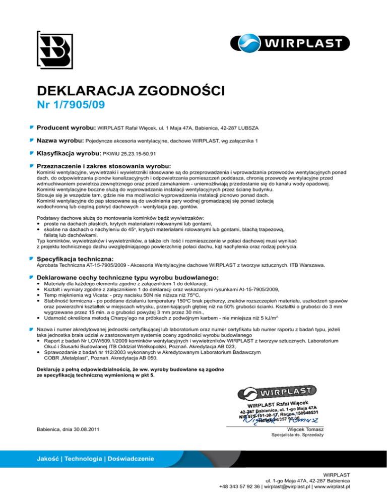 DEKLARACJA ZGODNOŚCI Nr 1/7905/09 Producent wyrobu: WIRPLAST Rafał Więcek, ul. 1 Maja 47A, Babienica, 42-287 LUBSZA Nazwa wyrobu: Pojedyncze akcesoria wentylacyjne, dachowe WIRPLAST, wg załącznika 1 Klasyfikacja wyrobu: PKWiU 25.23.15-50.91 Przeznaczenie i zakres stosowania wyrobu: Kominki wentylacyjne, wywietrzaki i wywietrzniki stosowane są do przeprowadzenia i wprowadzania przewodów wentylacyjnych ponad dach, do odpowietrzania pionów kanalizacyjnych i odpowietrzania pomieszczeń poddasza, chronią przewody wentylacyjne przed wdmuchiwaniem powietrza zewnętrznego oraz przed zamakaniem - uniemożliwiają przedostanie się do kanału wody opadowej. Kominki wentylacyjne boczne służą do wyprowadzania instalacji wentylacyjnych przez ścianę budynku. Stosuje się je wszędzie tam, gdzie nie ma możliwości wyprowadzenia instalacji pionowo ponad dach. Kominki wentylacyjne do pap stosowane są do uwolnienia pary wodnej gromadzącej się ponad izolacją wodochronną lub cieplną pokryć dachowych - wentylacja pap, gontów. Podstawy dachowe służą do montowania kominków bądź wywietrzaków: yy proste na dachach płaskich, krytych materiałami rolowanymi lub gontami, yy skośne na dachach o nachyleniu do 45o, krytych materiałami rolowanymi lub gontami, blachą trapezową, falistą lub dachówkami. Typ kominków, wywietrzaków i wywietrzników, a także ich ilość i rozmieszczenie w połaci dachowej musi wynikać z projektu technicznego dachu uwzględniającego powierzchnię połaci dachu, kąt nachylenia oraz rodzaj pokrycia. Specyfikacja techniczna: Aprobata Techniczna AT-15-7905/2009 - Akcesoria Wentylacyjne dachowe WIRPLAST z tworzyw sztucznych. ITB Warszawa. Deklarowane cechy techniczne typu wyrobu budowlanego: yy yy yy yy Materiały dla każdego elementu zgodne z załącznikiem 1 do deklaracji, Kształt i wymiary zgodne z załącznikiem 1 do deklaracji oraz wskazanymi rysunkami At-15-7905/2009, Temp mięknienia wg Vicata: - przy nacisku 50N nie niższa niż 75OC, Stabilność termiczna - po poddane działaniu temperatury 150oC brak pęcherzy, znaków rozszczepień materiału, uszkodzeń spawów oraz powierzchni kształtek w miejscach wtrysku, przenikających głębiej niż na 50% grubości ścianki. Kształtki o grubości do 3 mm wygrzewane przez 15 min. a o grubości powyżej 3 mm przez 30 min., yy Udarność określona metodą Charpy’ego na próbkach z podwójnym karbem - nie mniejsza niż 5 kJ/m2. Nazwa i numer akredytowanej jednostki certyfikującej lub laboratorium oraz numer certyfikatu lub numer raportu z badań typu, jeżeli taka jednostka brała udział w zastosowanym systemie oceny zgodności wyrobu budowlanego yy Raport z badań Nr LOW/509.1/2009 kominków wentylacyjnych i wywietrzników WIRPLAST z tworzyw sztucznych. Laboratorium Okuć i Ślusarki Budowlanej ITB Oddział Wielkopolski, Poznań. Akredytacja AB 023, yy Sprawozdanie z badań nr 112/2003 wykonanych w Akredytowanym Laboratorium Badawczym COBR „Metalplast”, Poznań. Akredytacja AB 050. Deklaruję z pełną odpowiedzialnością, że ww. wyroby budowlane są zgodne ze specyfikacją techniczną wymienioną w pkt 5. Babienica, dnia 30.08.2011 Więcek Tomasz Specjalista ds. Sprzedaży Jakość | Technologia | Doświadczenie WIRPLAST ul. 1-go Maja 47A, 42-287 Babienica +48 343 57 92 36 | [email protected] | www.wirplast.pl