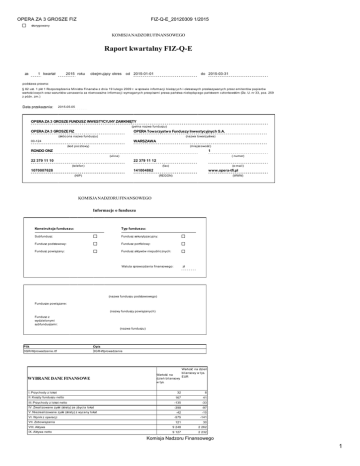 OPERA ZA 3 GROSZE FIZ FIZ-Q-E_20120309 1/2015 skorygowany KOMISJA NADZORU FINANSOWEGO Raport kwartalny FIZ-Q-E za 1 kwartał 2015 roku obejmujący okres od 2015-01-01 do 2015-03-31 podstawa prawna: § 82 ust. 1 pkt 1 Rozporządzenia Ministra Finansów z dnia 19 lutego 2009 r. w sprawie informac ji bieżąc yc h i okresowyc h przekazywanyc h przez emitentów papierów wartośc iowyc h oraz warunków uznawania za równoważne informac ji wymaganyc h przepisami prawa państwa niebędąc ego państwem c złonkowskim (Dz. U. nr 33, poz. 259 z późn. zm.) Data przekazania: 2015-05-05 OPERA ZA 3 GROSZE FUNDUSZ INWESTYCYJNY ZAMKNIĘTY (pełna nazwa funduszu) OPERA ZA 3 GROSZE FIZ OPERA Towarzystwo Funduszy Inwestycyjnych S.A. (skróc ona nazwa funduszu) (nazwa towarzystwa) WARSZAWA 00-124 (kod poc ztowy) (miejsc owość ) RONDO ONZ 1 (ulic a) ( numer) 22 379 11 10 22 379 11 12 (telefon) (fax) 1070007628 (e-mail) www.opera-tfi.pl 141004862 (NIP) (REGON) (WWW) KOMISJA NADZORU FINANSOWEGO Informacje o funduszu Konstrukcja funduszu: Typ funduszu: Subfundusz: Fundusz sekurytyzac yjny: Fundusz podstawowy: Fundusz portfelowy: Fundusz powiązany: Fundusz aktywów niepublic znyc h: Waluta sprawozdania finansowego: zł (nazwa funduszu podstawowego) Fundusze powiązane: (nazwy funduszy powiązanyc h) Fundusz z wydzielonymi subfunduszami: (nazwa funduszu) Plik Opis 3GR-Wprowadzenie.rtf 3GR-Wprowadzenie WYBRANE DANE FINANSOWE I. Przyc hody z lokat Wartość na dzień bilansowy w tys. Wartość na EUR dzień bilansowy w tys. 32 8 167 41 III. Przyc hody z lokat netto -135 -33 IV. Zrealizowane zyski (straty) ze zbyc ia lokat -398 -97 II. Koszty funduszu netto V. Niezrealizowane zyski (straty) z wyc eny lokat VI. Wynik z operac ji VII. Zobowiązania VIII. Aktywa IX. Aktywa netto -42 -10 -575 -141 121 30 9 248 2 262 9 127 2 232 Komisja Nadzoru Finansowego 1 OPERA ZA 3 GROSZE FIZ FIZ-Q-E_20120309 1/2015 X. Lic zba zarejestrowanyc h c ertyfikatów inwestyc yjnyc h 25 013 0 XI. Wartość aktywów netto na c ertyfikat inwestyc yjny 364,87 89,23 0,00 0,00 XII. Wynik z operac ji na c ertyfikat inwestyc yjny ZESTAWIENIE LOKAT 1 kw artał 4 kw artał 2014 rok SKŁADNIKI LOKAT 2015 roku Wartość w edług Wartość w yceny na w edług ceny dzień nabycia w tys. bilansow y w tys. 1. Akcje 2. Warranty subskrypcyjne 3. Praw a do akcji Procentow y udział w aktyw ach ogółem 2014 roku Wartość w edług Wartość w yceny na w edług ceny dzień nabycia w tys. bilansow y w tys. Procentow y udział w aktyw ach ogółem Wartość w edług Wartośc w yceny na w edług ceny dzień nabycia w tys. bilansow y w tys. Procentow y udział w aktyw ach ogółem 5 940 5 138 55,53 6 043 5 246 52,58 6 043 5 246 52,58 0 0 0,00 0 0 0,00 0 0 0,00 0 0 0,00 12 18 0,18 12 18 0,18 4. Praw a poboru 0 0 0,00 0 0 0,00 0 0 0,00 5. Kw ity depozytow e 0 0 0,00 0 0 0,00 0 0 0,00 6. Listy zastaw ne 0 0 0,00 0 0 0,00 0 0 0,00 2 108 1 801 19,48 1 708 1 409 14,13 1 708 1 409 14,13 -76 -68 -0,73 -82 -78 -0,78 -82 -78 -0,78 0 0 0,00 0 0 0,00 0 0 0,00 0 0 0,00 0 0 0,00 0 0 0,00 11. Certyfikaty inw estycyjne 12. Tytuły uczestnictw a emitow ane przez instytucje w spólnego inw estow ania mające siedzibę za granicą 13. Wierzytelności 0 0 0,00 0 0 0,00 0 0 0,00 0 0 0,00 0 0 0,00 0 0 0,00 0 0 0,00 0 0 0,00 0 0 0,00 14. Weksle 0 0 0,00 0 0 0,00 0 0 0,00 516 516 5,58 913 913 9,15 913 913 9,15 16. Waluty 0 0 0,00 0 0 0,00 0 0 0,00 17. Nieruchomości 0 0 0,00 0 0 0,00 0 0 0,00 18. Statki morskie 0 0 0,00 0 0 0,00 0 0 0,00 19. Inne 0 0 0,00 0 0 0,00 0 0 0,00 7. Dłużne papiery w artościow e 8. Instrumenty pochodne 9. Udziały w spółkach z ograniczoną odpow iedzialnością 10. Jednostki uczestnictw a 15. Depozyty TABELE UZUPEŁNIAJĄCE AKCJE Kraj siedziby emitenta Wartość według Wartość według Proc entowy udział c eny nabyc ia w wyc eny na dzień w aktywac h tys. bilansowy w tys. ogółem Rodzaj rynku Nazwa rynku 1. BANK ZACHODNI WBK SA (PLBZ00000044) Aktywny rynek - rynek regulowany GIEŁDA PAPIERÓW WARTOŚCIOWY CH W WARSZAWIE 300 Polska 114 103 1,11 2. GETIN HOLDING SA (PLGSPR000014) Aktywny rynek - rynek regulowany GIEŁDA PAPIERÓW WARTOŚCIOWY CH W WARSZAWIE 20 316 Polska 81 42 0,45 3. PKN ORLEN SA (PLPKN0000018) Aktywny rynek - rynek regulowany GIEŁDA PAPIERÓW WARTOŚCIOWY CH W WARSZAWIE 8 650 Polska 362 513 5,55 4. KGHM POLSKA MIEDŹ SA (PLKGHM000017) Aktywny rynek - rynek regulowany GIEŁDA PAPIERÓW WARTOŚCIOWY CH W WARSZAWIE 2 170 Polska 233 260 2,81 5. GRUPA LOTOS SA (PLLOTOS00025) Aktywny rynek - rynek regulowany GIEŁDA PAPIERÓW WARTOŚCIOWY CH W WARSZAWIE 2 277 Polska 71 62 0,67 6. BANK MILLENNIUM SA (PLBIG0000016) Aktywny rynek - rynek regulowany GIEŁDA PAPIERÓW WARTOŚCIOWY CH W WARSZAWIE 50 000 Polska 333 332 3,59 7. BANK BPH SA (PLBPH0000019) Aktywny rynek - rynek regulowany GIEŁDA PAPIERÓW WARTOŚCIOWY CH W WARSZAWIE 550 Polska 23 25 0,27 8. PKO BANK POLSKI SA (PLPKO0000016) Aktywny rynek - rynek regulowany GIEŁDA PAPIERÓW WARTOŚCIOWY CH W WARSZAWIE 20 000 Polska 720 680 7,35 9. ASSECO POLAND SA (PLSOFT B00016) Aktywny rynek - rynek regulowany GIEŁDA PAPIERÓW WARTOŚCIOWY CH W WARSZAWIE 2 500 Polska 114 148 1,60 Lic zba Komisja Nadzoru Finansowego 2 OPERA ZA 3 GROSZE FIZ FIZ-Q-E_20120309 1/2015 1 kw artał 2014 roku Wartość w edług Wartość w yceny na w edług ceny dzień nabycia w tys. bilansow y w tys. Procentow y udział w aktyw ach ogółem 6 461 5 995 54,63 0 0 0,00 0 0 0,00 0 0 0,00 0 0 0,00 0 0 0,00 700 713 6,50 0 0 0,00 0 0 0,00 0 0 0,00 0 0 0,00 0 0 0,00 0 0 0,00 0 0 0,00 3 225 3 228 29,42 0 0 0,00 0 0 0,00 0 0 0,00 0 0 0,00 Komisja Nadzoru Finansowego 3 OPERA ZA 3 GROSZE FIZ 10. GLOBE TRADE CENTRE SA (PLGTC0000037) FIZ-Q-E_20120309 1/2015 Aktywny rynek - rynek regulowany 11. TURKIYE IS BANKASI AS (TRAISCTR91N2) Aktywny rynek - rynek regulowany GIEŁDA PAPIERÓW WARTOŚCIOWY CH W WARSZAWIE 31 078 Polska 247 175 1,89 ISTANBUL STOCK EXCHANGE 15 000 T urc ja 107 128 1,38 12. TURKIYE GARANTI BANKASI AS (TRAGARAN9
