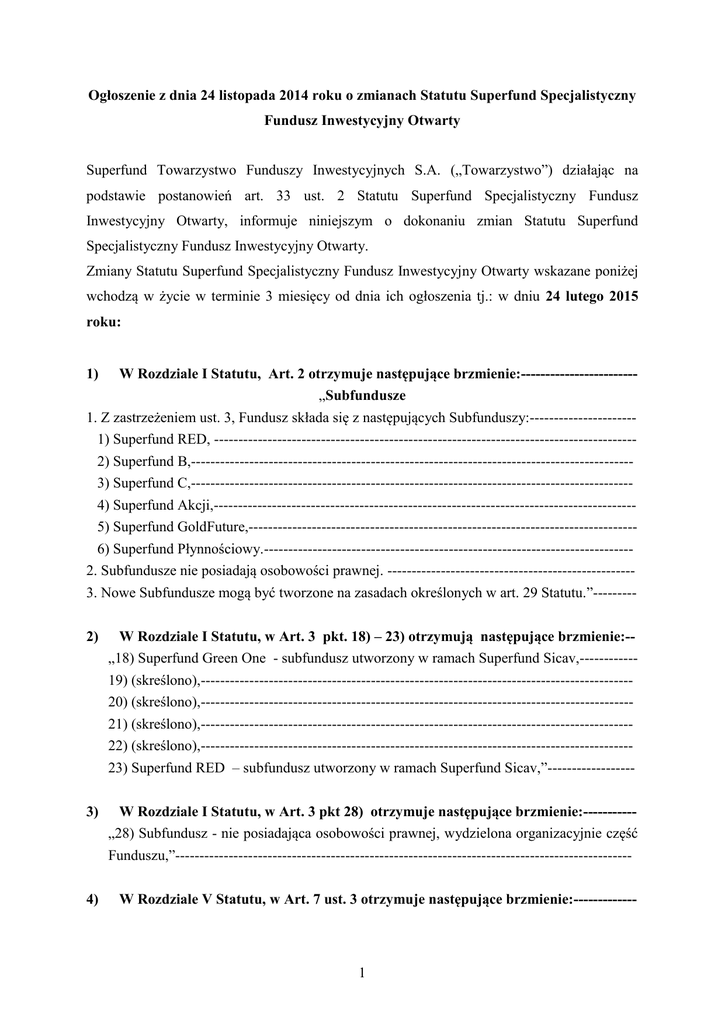 Ogłoszenie z dnia 24 listopada 2014 roku o zmianach Statutu Superfund Specjalistyczny Fundusz Inwestycyjny Otwarty Superfund Towarzystwo Funduszy Inwestycyjnych S.A. („Towarzystwo”) działając na podstawie postanowień art. 33 ust. 2 Statutu Superfund Specjalistyczny Fundusz Inwestycyjny Otwarty, informuje niniejszym o dokonaniu zmian Statutu Superfund Specjalistyczny Fundusz Inwestycyjny Otwarty. Zmiany Statutu Superfund Specjalistyczny Fundusz Inwestycyjny Otwarty wskazane poniżej wchodzą w życie w terminie 3 miesięcy od dnia ich ogłoszenia tj.: w dniu 24 lutego 2015 roku: W Rozdziale I Statutu, Art. 2 otrzymuje następujące brzmienie:-----------------------„Subfundusze 1. Z zastrzeżeniem ust. 3, Fundusz składa się z następujących Subfunduszy:---------------------1) Superfund RED, --------------------------------------------------------------------------------------2) Superfund B,------------------------------------------------------------------------------------------3) Superfund C,------------------------------------------------------------------------------------------4) Superfund Akcji,--------------------------------------------------------------------------------------5) Superfund GoldFuture,-------------------------------------------------------------------------------6) Superfund Płynnościowy.---------------------------------------------------------------------------1) 2. Subfundusze nie posiadają osobowości prawnej. --------------------------------------------------3. Nowe Subfundusze mogą być tworzone na zasadach określonych w art. 29 Statutu.”--------2) W Rozdziale I Statutu, w Art. 3 pkt. 18) – 23) otrzymują następujące brzmienie:-„18) Superfund Green One - subfundusz utworzony w ramach Superfund Sicav,-----------19) (skreślono),----------------------------------------------------------------------------------------20) (skreślono),----------------------------------------------------------------------------------------21) (skreślono),----------------------------------------------------------------------------------------22) (skreślono),----------------------------------------------------------------------------------------23) Superfund RED – subfundusz utworzony w ramach Superfund Sicav,”------------------ 3) W Rozdziale I Statutu, w Art. 3 pkt 28) otrzymuje następujące brzmienie:----------„28) Subfundusz - nie posiadająca osobowości prawnej, wydzielona organizacyjnie część Funduszu,”---------------------------------------------------------------------------------------------- 4) W Rozdziale V Statutu, w Art. 7 ust. 3 otrzymuje następujące brzmienie:------------- 1 „3. Superfund RED realizuje cel inwestycyjny poprzez inwestowanie do 100% swoich Aktywów w Superfund RED. Superfund RED może także inwestować swoje Aktywa w inne instrumenty finansowe dozwolone przepisami prawa i postanowieniami Statutu.”--------------5) W Rozdziale V Statutu, w Art. 9 ust. 1 i 2 otrzymują następujące brzmienie:-------„1. Superfund RED lokuje do 100% swoich Aktywów w Superfund RED.-----------------------2. Celem Superfund Sicav jest osiągnięcie dla uczestników danego subfunduszu wydzielonego w ramach Superfund Sicav, w tym Superfund RED, długoterminowego wzrostu wartości kapitału poprzez inwestowanie w instrumenty pochodne, takie jak transakcje forward w zakresie towarów, walut, stóp procentowych, w jednostki lub tytuły uczestnictwa innych instytucji zbiorowego inwestowania, głównie funduszy hedgingowych, czy też bezpośrednio w zbywalne papiery wartościowe lub inne aktywa i instrumenty finansowe dozwolone przez przepisy prawa, lub poprzez dokonywanie lokat w kombinację inwestycji, o których mowa wyżej.”---------------------------------------------------------------------W Rozdziale V Statutu, zdanie pierwsze w Art. 9 ust. 4 otrzymuje następujące brzmienie:-------------------------------------------------------------------------------------------„Do inwestycji Superfund RED mają zastosowanie następujące wspólne ograniczenia inwestycyjne dotyczące wszystkich subfunduszy w ramach Superfund Sicav:”------------------6) 7) W Rozdziale V Statutu, w Art. 9 ust. 8 - 14 otrzymują następujące brzmienie:------„8. Celem inwestycyjnym Superfund RED jest uzyskanie dla jego uczestników długoterminowego wzrostu wartości kapitału przede wszystkim poprzez zawieranie transakcji terminowych na rynku regulowanym bezpośrednio lub pośrednio za pomocą transakcji swapowych. Subfundusz ten może poza tym wykorzystywać inne instrumenty pochodne, takie jak walutowe kontrakty forward, stopy procentowe, a także wykorzystywać akcje i wskaźniki akcji, oraz wszelkiego rodzaju opcje na rynkach regulowanych, w tym uznanych rynkach OTC (Over-The-Counter).----------------------------------------------------------------------9. Superfund RED może również posiadać denominowane w różnych walutach oprocentowane depozyty w celu zmaksymalizowania wartości aktywów nieinwestowanych bezpośrednio na rynkach.---------------------------------------------------------------------------------10. Superfund RED może też inwestować w inne fundusze inwestycyjne (instytucje zbiorowego inwestowania), łącznie z funduszami UCITS rynku pieniężnego lub obligacji, zbywalne dłużne papiery wartościowe, krótkoterminowe papiery wartościowe, jak również w depozyty, oraz utrzymywać środki pieniężne lub ich odpowiedniki, wedle uznania menedżera inwestycyjnego, w celu zmaksymalizowania zysku z dostępnych aktywów nieinwestowanych w rynkowe instrumenty pochodne.----------------------------------------------------------------------11. Superfund RED może inwestować we wszelkie instrumenty finansowe wykorzystywane 2 w celu zabezpieczenia się przed ryzykami walutowymi.---------------------------------------------12. Konstrukcja Superfund RED umożliwia jego uczestnikom zrealizowanie potencjalnych korzyści płynących z działa