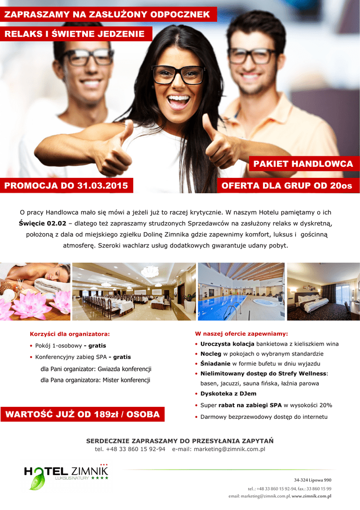 ZAPRASZAMY NA ZASŁUŻONY ODPOCZNEK RELAKS I ŚWIETNE JEDZENIE PAKIET HANDLOWCA PROMOCJA DO 31.03.2015 OFERTA DLA GRUP OD 20os O pracy Handlowca mało się mówi a jeżeli już to raczej krytycznie. W naszym Hotelu pamiętamy o ich Święcie 02.02 – dlatego też zapraszamy strudzonych Sprzedawców na zasłużony relaks w dyskretną, położoną z dala od miejskiego zgiełku Dolinę Zimnika gdzie zapewnimy komfort, luksus i gościnną atmosferę. Szeroki wachlarz usług dodatkowych gwarantuje udany pobyt. Korzyści dla organizatora: W naszej ofercie zapewniamy: • Pokój 1-osobowy - gratis • Uroczysta kolacja bankietowa z kieliszkiem wina • Konferencyjny zabieg SPA - gratis dla Pani organizator: Gwiazda konferencji dla Pana organizatora: Mister konferencji • Nocleg w pokojach o wybranym standardzie • Śniadanie w formie bufetu w dniu wyjazdu • Nielimitowany dostęp do Strefy Wellness: basen, jacuzzi, sauna fińska, łaźnia parowa • Dyskoteka z DJem • Super rabat na zabiegi SPA w wysokości 20% WARTOŚĆ JUŻ OD 189zł / OSOBA • Darmowy bezprzewodowy dostęp do internetu SERDECZNIE ZAPRASZAMY DO PRZESYŁANIA ZAPYTAŃ tel. +48 33 860 15 92-94 e-mail: [email protected] 34-324 Lipowa 990 tel..: +48 33 860 15 92-94, fax.: 33 860 15 99 email: [email protected], www.zimnik.com.pl
