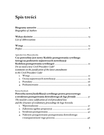 Spis treści Biogramy autorów ................................................................................... 9 Biographies of Authors Wykaz skrótów ........................................................................................ 13 List of Abbreviations Wstęp ........................................................................................................ 15 Preface ......................................................................................................... 17 Agnieszka Góra-Błaszczykowska Czy potrzebny jest nowy Kodeks postępowania cywilnego (uwagi na podstawie najnowszych nowelizacji Kodeksu postępowania cywilnego) ..................................................... 21 Do we need a new Civil Procedure Code? (comments on the justification of the latest amendments to the Civil Procedure Code) 1. Wstęp ............................................................................................. 21 2. Ocena najnowszych nowelizacji ................................................... 25 3. Postulaty ........................................................................................ 26 4. Podsumowanie ............................................................................... 33 Bartosz Karolczyk Potrzeba nowej kodyfikacji cywilnego prawa procesowego a struktura postępowania dowodowego de lege ferenda .................. 37 The need for a new codification of civil procedural law and the structure of evidentiary proceedings de lege ferenda 1. Wprowadzenie .............................................................................. 37 2. Założenia ogólne propozycji ....................................................... 40 3. Struktura postępowania ............................................................... 42 4. Należyte przygotowanie postępowania dowodowego i transparentność tego procesu ................................................... 46 3 N 5. Właściwe znaczenie i stosowanie przepisów o zgłaszaniu i przeprowadzaniu dowodów .................................. 53 6. Wprowadzenie mechanizmów zapewniających efektywny dostęp do dowodów pozostających poza kontrolą strony wnioskującej o ich przeprowadzenie ............................... 56 7. Wzmocnienie kierowniczej roli sędziego i urealnienie sankcji kosztowych .................................................. 63 8. Podsumowanie .............................................................................. 65 Krzysztof Wrzesiński Przebieg i wyniki postępowania dowodowego w protokole rozprawy a prawo do sprawiedliwego i jawnego rozpatrzenia sprawy (art. 45 Konstytucji RP) .................................. 69 The course and results of evidentiary proceedings in the trial record and the right to a fair and open hearing of a case (Art. 45 of the Polish Constitution) 1. Zakres wdrożenia i funkcjonowania e-protokołu ....................... 69 2. Dyskusja poprzedzająca wprowadzenie przepisów o e-protokole. Obawy ................................................. 71 3. Funkcjonowanie e-protokołu – ocena płynąca z praktyki ........................................................... 76 4. Wnioski i postulaty ....................................................................... 85 Kinga Flaga-Gieruszyńska, Aleksandra Klich, Artur Pestka Ochrona tajemnicy spowiedzi w postępowaniu cywilnym na przykładzie duchownych Kościoła katolickiego. Stan obecny i rozważania na tle prac nad nowym Kodeksem postępowania cywilnego .................................................. 89 The observance of the seal of confession in civil proceedings exemplified by clergymen of the Catholic Church. The present status and analyses with regard to the new Civil Procedure Code 1. Wstęp ............................................................................................ 89 2. Pojęcie „świadek” i istota dowodu z zeznań świadków ............... 91 3. Prawo odmowy odpowiedzi na poszczególne pytania – zagadnienia podstawowe .......................................................... 96 4. Istota tajemnicy spowiedzi ......................................................... 101 4 Spis treści 5. Aspekty podmiotowe uprawnienia do odmowy odpowiedzi na pytania wymagające ujawnienia tajemnicy spowiedzi ................................................ 105 6. Wnioski ....................................................................................... 109 Joanna Studzińska Gromadzenie materiału dowodowego przez interwenienta ubocznego. Uwagi de lege lata i de lege ferenda ................................. 113 Gathering evidence by a secondary intervener. De lege lata and de lege ferenda notes 1. Uwagi wstępne ............................................................................. 113 2. Uprawnienia interwenienta ubocznego do dokonywania czynności procesowych .................................. 115 3. Czynność procesowa dopuszczalna według stanu sprawy ....... 120 4. Zakres dowodzenia przez interwenienta ubocznego ............... 121 5. Prekluzja dowodowa dla interwenienta .................................... 127 6. Dopuszczalność cofnięcia przez stronę wniosku dowodowego interwenienta ...................................................... 136 7. Wnioski ....................................................................................... 139 Piotr Gil Zastosowanie dowodów pośrednich (dowód prima facie) w procesach dotyczących uznania czynności prawnej za bezskuteczną (z uwzględnieniem proponowanych zmian do Kodeksu postępowania cywilnego – druk sejmowy 2678) ...... 143 The application of prima facie evidence in trials concerning the recognition of a legal act as ineffective (taking into consideration the suggested amendments to the Civil Procedure Code – Sejm paper no. 2678) 1. Wprowadzenie ............................................................................ 143 2. Geneza dowodu prima facie oraz jego zastosowanie ................ 144 
