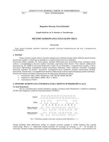 ZESZYTY ETI ZESPOŁU SZKÓŁ W TARNOBRZEGU Nr 1 Seria: Teleinformatyka 2012 Bogusław Rzeszut, Paweł Kiciński Zespół Szkół im. ks. S. Staszica w Tarnobrzegu METODY KODOWANIA SYGNAŁÓW SYG SIECI Streszczenie Praca zawiera przykłady sposobów kodowania sygnałów cyfrowych charakterystyczne dla la sieci o przepustowości przepustowo 10/100/1000Mb. 1. WSTĘP Chcąc przesłać sygnał cyfrowy łłączami analogowymi (telefonicznymi) należy ży dokona dokonać przetworzenia (konwersji) sygnału z cyfrowego na analogowy z wykorzystaniem procesu modulacji. Konwersję kodów sygnałów do innej postaci, postaci, bardziej efektywnej przy przesyłaniu przez szeregowe łącza ł cyfrowe i uwzględniającej cej fizyczne aspekty transmisji, zapewniają kody liniowe.. Przy małych szybkościach szybko transmisji (np. do 2400b/s) konwersja kodowania zwykle nie nie jest potrzebna, a transmitowane sygnały w łączu ł fizycznym odpowiadają oryginalnym kodom przesyłanej informacji. Duże Du szybkości ści transmisji wymagaj wymagają konwersji sygnałów do postaci i poziomów wymaganych przez konkretne medium transmisyjne (skrętka, (skr koncentryk, światłowód), z uwzględnieniem ędnieniem bardziej efektywnego wykorzystania dostępnego dostępnego pasma transmisji. Wśród ród wielu liniowych kodów transmisyjnych do najczęściej najcz spotykanych należą: • dwustanowe we NRZ, NRZI, Manchester, CMI, 4B/5B, 5B/6B, 8B/10B • trójstanowe AMI (ISDN), HDB3, MLT-3, 8B/6T • wielostanowe PAM-5 2. SPOSOBY KODOWANIA INFORMACJI IN DLA RÓŻNYCH PRĘDKOŚCI Ę ŚCI ŁĄCZ Ł 2.1 Kod Manchester Na rys.1 przedstawiono sposób modulacji sygnału za pomocą pomoc kodu Manchester o szybkości szybko modulacji 20 Mb/s dla osiągnięcia szybkości ści transmisji danych 10 Mbit/s. Rys.1. Modulacja sygnału cyfrowego za pomocą pomoc kodu Manchester -[2] Zasada działania kodu Manchester polega na zmianie z poziomu sygnału w środku każdego bitu sygnału wejściowego. Bitowi „1” odpowiada zmiana poziomu od wyższego do niższego, a „0” - od niższego do wyższego. Przejście między dzy poziomami sygnału występują wyst przy każdym bicie, w związku ązku z czym możliwa mo jest 2 Bogusław Rzeszut, Paweł Kiciński ciągła kontrola synchronizacji detektora ze strumieniem danych, nawet w przypadku nadawania długiej sekwencji zer lub jedynek. Fakt ten może być również wykorzystywany do detekcji błędów – brak oczekiwanej zmiany poziomu sygnału oznacza przekłamanie. Kod Manchester wymaga impulsów dwukrotnie krótszych niż kod NRZ. Oznacza to dwukrotne zwiększenie szybkości modulacji, a więc i dwukrotny wzrost wymaganego pasma transmisyjnego przy tej samej szybkości transmisji danych. Korzystną cechą sygnału przesyłanego w kodzie Manchester jest fakt, że jego wartość średnia jest równa zero. 2.2 Kodowanie CMI CMI (ang. Coded Mark Inversion) - kod dwuwartościowy, zalecany do kodowania sygnałów o przepływności 140 Mbit/s, będący modyfikacją kodu Manchester. Cechuje go brak składowej stałej oraz zajmowanie szerokiego pasma , przy zachowaniu większości energii w pierwszej jego części. W kodzie tym wartość binarnej jedynki jest przedstawiona naprzemiennie w postaci stanu "+1" lub "-1", natomiast wartość binarnego zera w postaci stanu "-1" w pierwszej połowie tego bitu i w postaci stanu "+1" w drugiej połowie bitu. Rys. 2 Reguła kodowania CMI Rys. 3. Kodowanie sposobem CMI –[9] 2.3. Kodowanie NRZ i NRZI Jeżeli w transmisji synchronicznej stosowane jest kodowanie NRZ, to pojawia się problem rozsynchronizowania zegarów. Rozsynchronizowanie zegarów może zajść gdy w transmitowanym strumieniu bitów jest ciąg samych 1 lub 0. Jeżeli przez dłuższy czas nadawany jest ciąg samych 0 lub 1 to odbiorca nie rejestruje zmian napięcia. Jeżeli dojście do rozsynchronizowania zegarów odbiorca nie może określić ilości przesłanych bitów. Rys. 4 Sposób kodowania NRZ - [4] Kodowanie NRZI, (ang.Nor-Return to Zero Inverted)jest mieszaną metodą kodowania. Zasada kodowania ciągu bitów o wartości 1 jest taka, jak w kodowaniu Manchester, czyli 1 -> 10. Zasada kodowania ciągu bitów o wartości 0 jest taka, jak w NRZ, czyli 0 -> 00 1 - oznacza zmianę napięcia, 0 - brak zmiany, zmiany napięcia następują przy przejściach 0->1. Bogusław Rzeszut, Paweł Kiciński 3 Rys. 5 Sposób kodowania NRZI - [4] 2.4. Kodowanie4B/5B Kodowanie 4B/5B zostało zaprojektowane oryginalnie na potrzeby sieci FDDI(ang. Fiber Distributed Data Interface), gdzie pozwoliło na 80% wykorzystanie przepustowości łącza. Zaadaptowano je do standardu 100BaseTX, gdzie służy jako wstępny skrambler danych przed kodowaniem MLT-3. Zabieg ten ma na celu zapobieganie powstawaniu długich ciągów logicznych zer, co skutkowałoby utratą synchronizacji (patrz kodowanie MLT-3). Kodowanie zostało zmienione jedynie w nieznacznym stopniu w stosunku do wersji FDDI, w celu uwzględnienia kontroli ramek Ethernet. W kodowaniu 4B/5B ciągi czterobitowe kodowane są pięciobitowymi symbolami. Do każdych czterech bitów dodawany jest piąty – za pomocą 4 bitów można utworzyć 24 = 16 ciągów, natomiast pięć bitów daje ich już 25 = 32. Analizując zamieszczoną tabelę kodową można zauważyć, że uzyskana w ten sposób nadmiarowość umożliwia takie zakodowanie sygnału, że nawet ciąg samych zer będzie zawierał jedynkę (i analogicznie ciąg samych jedynek będzie zawierał zero), co zapewnia utrzymanie synchronizacji. Poniższa tabela przedstawia wszystkie możliwe ciągi zer i jedynek wraz z ich interpretacją: Rys. 6. Zasada kodowania kodem 4B/5B –[6] W nadawanej sekwencji znaków nigdy nie wystąpi ciąg dłuższy niż 8 jedynek. Piąty bit w niewielkim zakresie umożliwia ponadto wykrywanie błędów. Wadą tego kodowania, np. w stosunku do 8B/10B, jest brak zrównoważenia wystąpień sygnałów 0 i 1, w związku z czym wymagana do zakodowania energia będzie