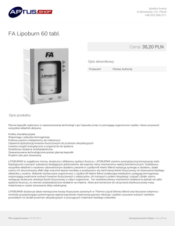 Apteka Avena Królewiecka 12c, Płock +48 502 666 011 FA Lipoburn 60 tabl. Cena: 35,20 PLN Opis słownikowy Producent Fitness Authority Opis produktu Płynne kapsułki wykonano w zaawansowanej technologii Lipo Capsules przez co pomagają organizmowi szybko i łatwo przyswoić wszystkie składniki aktywne. Krótka charakterystyka Wspomaga i pobudza termogenezę Podnosi poziom metabolizmu do maksimum Zapewnia dystrybucję kwasów tłuszczowych do przemian oksydacyjnych Uwalnia związki energetyczne w organizmie do spalania Dodatkowe działanie antykataboliczne Zaawansowana technologicznie postać płynnej kapsułki W jakim celu jest stosowany LIPOBURN® to wyjątkowo mocny, skuteczny i efektywny spalacz tłuszczu. LIPOBURN® zawiera synergistyczną kompozycję wielu fizjologicznie czynnych substancji działających jednocześnie, ale poprzez różne mechanizmy reakcji biochemicznych. Dodatkowo, wszystkie składniki o naukowo udowodnionym działaniu zawarte w LipoBurn® Matrix Blend wykazują synergię w działaniu, dzięki czemu ich skumulowany efekt daje znacznie lepsze rezultaty w pozbywaniu się niechcianej tkanki tłuszczowej niż stosowanie każdego składnika z osobna. Składniki dostarczane organizmowi z LipoBurn® Matrix Blend zwiększają metabolizm, potęgują termogenezę, wspomagają uwalnianie wolnych kwasów tłuszczowych z adipocytów, ich transport a potem oksydację ( rozpad ) dzięki czemu następuje skuteczna redukcja tkanki tłuszczowej w całym organizmie . Ten wielokierunkowy mechanizm działania to jednak nie tylko spalanie tłuszczu, to również antykataboliczne działanie na mięśnie , które jest konieczne do utrzymania beztłuszczowej masy mięśniowej w czasie stosowania diety redukcyjnej. LIPOBURN® dostarcza także nienasycone kwasy tłuszczowe zawartych w Thermo-Liquid Delivery Blend oraz kluczowe witaminy i minerały przyspieszające potreningową regenerację tkanki mięśniowej poprzez redukcję i szybkie usuwanie wolnych rodników powstałych na skutek przemian oksydacyjnych w pracujących mięśniach każdego człowieka. Plik wygenerowano: 02-03-2017 Powered by TCPDF (www.tcpdf.org) Oprogramowanie sklepu: AptusShop