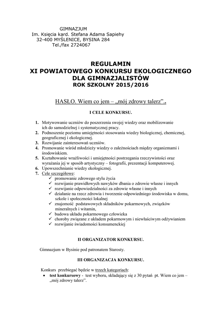 GIMNAZJUM Im. Księcia kard. Stefana Adama Sapiehy 32-400 MYŚLENICE, BYSINA 284 Tel./fax 2724067 REGULAMIN XI POWIATOWEGO KONKURSU EKOLOGICZNEGO DLA GIMNAZJALISTÓW ROK SZKOLNY 2015/2016 HASŁO. Wiem co jem – „mój zdrowy talerz”.. I CELE KONKURSU. 1. Motywowanie uczniów do poszerzenia swojej wiedzy oraz mobilizowanie ich do samodzielnej i systematycznej pracy. 2. Podnoszenie poziomu umiejętności stosowania wiedzy biologicznej, chemicznej, geograficznej i ekologicznej. 3. Rozwijanie zainteresowań uczniów. 4. Promowanie wśród młodzieży wiedzy o zależnościach między organizmami i środowiskiem. 5. Kształtowanie wrażliwości i umiejętności postrzegania rzeczywistości oraz wyrażania jej w sposób artystyczny – fotografii, prezentacji komputerowej. 6. Upowszechnianie wiedzy ekologicznej. 7. Cele szczegółowe: promowanie zdrowego stylu życia rozwijanie prawidłowych nawyków dbania o zdrowie własne i innych rozwijanie odpowiedzialności za zdrowie własne i innych działanie na rzecz zdrowia i tworzenie odpowiedniego środowiska w domu, szkole i społeczności lokalnej znajomość podstawowych składników pokarmowych, związków mineralnych i witamin, budowa układu pokarmowego człowieka choroby związane z układem pokarmowym i niewłaściwym odżywianiem rozwijanie świadomości konsumenckiej II ORGANIZATOR KONKURSU. Gimnazjum w Bysinie pod patronatem Starosty. III ORGANIZACJA KONKURSU. Konkurs przebiegać będzie w trzech kategoriach: test konkursowy - test wyboru, składający się z 30 pytań pt. Wiem co jem – „mój zdrowy talerz”. album – konkurs prac indywidualnych w formie albumu ze zdjęciami pt. ” Dary natury obiektywem malowane”. (np. owoce, warzywa i inne plony ziemi, również w kontekście zdrowego odżywiania) prezentacja multimedialna – konkurs prac indywidualnych w formie elektronicznej pt. Wiem co jem – „mój zdrowy talerz”. 1. Szkolny organizator konkursu zobowiązany jest do przesłania karty zgłoszenia, z podziałem na wybraną formę uczestnictwa do dnia: 31.03.2016r. Zgłoszenie szkoły do udziału w konkursie powinno być wypełnione DRUKOWANYMI LITERAMI. Zgłoszenia można przesyłać pocztą lub faksem. 2. Uczestnik konkursu może brać udział tylko w jednej, wybranej formie konkursowej : test album zdjęciowy prezentacja multimedialna 3. Organizator konkursu zastrzega sobie prawo publikacji prac konkursowych. Oznacza to jednocześnie, iż każdy uczestnik konkursu godzi się na taką publikację. 4. Niniejszy regulamin i materiały dodatkowe zostaną opublikowane na stronie naszego gimnazjum pod adresem (w zakładce- konkurs ekologiczny): http://www.gimnazjum-w-bysinie.pl Kontakt elektroniczny: [email protected] 5. Konkurs jest rywalizacją osób indywidualnych, dlatego prace grupowe nie będą oceniane jako nie zgodne z regulaminem konkursu. 6. Album powinien zawierać: 10 zdjęć wykonanych własnoręcznie w formacie 10x15 (lub 15x21) podpisanych –z zastosowaniem techniki komputerowej (opis zdjęcia, data wykonania). Zdjęcia mogą być opracowane w programach graficznych. Wówczas należy podać nazwę programu oraz załączyć plik źródłowy. Każde zdjęcie powinno posiadać informację, dotyczącą daty oraz miejsca wykonania. Fotografie powinny być naklejone jednostronnie na kartce w formacie A4. Pracę mogą być dodatkowo wzbogacone np. wierszami, sentencjami, przemyśleniami, lub opisem. Każdy album na ostatniej stronie musi być podpisany- tytuł, autor, szkoła, klasa, nazwisko opiekuna. W kategorii album zdjęciowy może brać udział maksymalnie 20 osób z danej szkoły. Temat albumu- ” Dary natury obiektywem malowane”. Albumy będą oceniane prze zawodowego fotografa. Szczególny nacisk kładziemy na: estetykę wykonania technikę wykonania pomysłowość własnoręczne wykonanie poprawny dobór zdjęć i treści podpisy pod zdjęciami (napisane na komputerze), własne przemyślenia, sentencje, myśli, wiersze, opisy opis albumu na ostatniej stronie W kategorii album zdjęciowy może brać udział maksymalnie 20 osób z danej szkoły. 7. Prezentacja multimedialna powinna być przygotowana w programie PowerPoint (w wersji Microsoft Office (2003, lub nowszym). Przejście slajdu powinno być ustawione automatycznie, równocześnie tak, by każdy z nich był możliwy do odczytania. Prezentacja zapisana na płycie CD maksymalnie 8 minut i zawierać maksymalnie 20 slajdów. Praca powinna zawierać stronę tytułową (autora, nazwę szkoły, opiekuna). Praca będzie oceniana za: zgodność z tematem, zgodność z regulaminem (maks. 8 minut, z możliwością odczytania treści, pełny opis płyty i prezentacji (dane osob. i szkoły) zawartą treść i samodzielność (WŁASNE: fotografie i opisy. Bibliografia- do treści i zdjęć powinna się znaleźć na ostatnim slajdzie). Brak bibliografii na końcowym slajdzie będzie świadczył, iż praca nie jest autorska. zastosowaną technikę (przejścia slajdu, animacja, dźwięki, ścieżka muzyczna, film, komentarz słowny) walory artystyczne Prezentacje komputerowe będą oceniane przez trzyosobową komisję, w skład której wchodzić będzie: informatyk, biolog lub geograf. W kategorii prezentacja multimedialna może brać udział maksymalnie 5 osób z danej szkoły. W prezentacji multimedialnej wysoko cenione są: SAMODZIELNOŚĆ WYKONANIA dotycząca własnego tekstu, zdjęć, wykresów, filmów, tekstu mówionego w tle. Ważne by tekst był samodzielnie zredagowany, a nie pochodził z stron internetowych (metodą kopiuj- wklej). W prezentacji powinny znaleźć się własne zdjęcia. ZASTOSOWANA TECHNIKA: Ważne jest aby prezentacja posiadała, przejścia slajdów, animację i prawidłowo automatycznie się odtwarzała. Mile widziany jest dodatkowy dźwięk w postaci muzyki, czy własny komentarz do tematu. Ważne aby na płycie zapisać nie tylko prezentację ale także wykorzystany; dźwięk (utwór) czy film. CZASAMI bywa iż prezentacja jest 