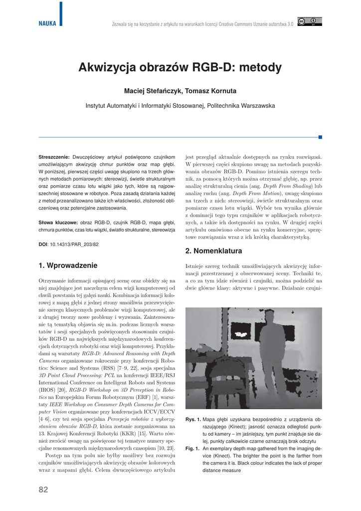 NAUKA Zezwala się na korzystanie z artykułu na warunkach licencji Creative Commons Uznanie autorstwa 3.0 Akwizycja obrazów RGB-D: metody Maciej Stefańczyk, Tomasz Kornuta Instytut Automatyki i Informatyki Stosowanej, Politechnika Warszawska Streszczenie: Dwuczęściowy artykuł poświęcono czujnikom umożliwiającym akwizycję chmur punktów oraz map głębi. W poniższej, pierwszej części uwagę skupiono na trzech głównych metodach pomiarowych: stereowizji, świetle strukturalnym oraz pomiarze czasu lotu wiązki jako tych, które są najpowszechniej stosowane w robotyce. Poza zasadą działania każdej z metod przeanalizowano także ich właściwości, złożoność obliczeniową oraz potencjalne zastosowania. Słowa kluczowe: obraz RGB-D, czujnik RGB-D, mapa głębi, chmura punktów, czas lotu wiązki, światło strukturalne, stereowizja jest przegląd aktualnie dostępnych na rynku rozwiązań. W pierwszej części skupiono uwagę na metodach pozyskiwania obrazów RGB-D. Pomimo istnienia szeregu technik, za pomocą których można otrzymać głębię, np. przez analizę strukturalną cienia (ang. Depth From Shading) lub analizę ruchu (ang. Depth From Motion), uwagę skupiono na trzech z nich: stereowizji, świetle strukturalnym oraz pomiarze czasu lotu wiązki. Wybór ten wynika głównie z dominacji tego typu czujników w aplikacjach robotycznych, a także ich dostępności na rynku. W drugiej części artykułu omówiono obecne na rynku komercyjne, sprzętowe rozwiązania wraz z ich krótką charakterystyką. DOI: 10.14313/PAR_203/82 2. Nomenklatura 1. Wprowadzenie Otrzymanie informacji opisującej scenę oraz obiekty się na niej znajdujące jest naczelnym celem wizji komputerowej od chwili powstania tej gałęzi nauki. Kombinacja informacji kolorowej z mapą głębi z jednej strony umożliwia przezwyciężenie szeregu klasycznych problemów wizji komputerowej, ale z drugiej tworzy nowe problemy i wyzwania. Zainteresowanie tą tematyką objawia się m.in. podczas licznych warsztatów i sesji specjalnych poświęconych stosowaniu czujników RGB-D na największych międzynarodowych konferencjach dotyczących robotyki oraz wizji komputerowej. Przykładami są warsztaty RGB-D: Advanced Reasoning with Depth Cameras organizowane rokrocznie przy konferencji Robotics: Science and Systems (RSS) [7–9, 22], sesja specjalna 3D Point Cloud Processing: PCL na konferencji IEEE/RSJ International Conference on Intelligent Robots and Systems (IROS) [20], RGB-D Workshop on 3D Perception in Robotics na Europejskim Forum Robotycznym (ERF) [1], warsztaty IEEE Workshop on Consumer Depth Cameras for Computer Vision organizowane przy konferencjach ICCV/ECCV [4–6], czy też sesja specjalna Percepcja robotów z wykorzystaniem obrazów RGB-D, która zostanie zorganizowana na 13. Krajowej Konferencji Robotyki (KKR) [15]. Warto również zwrócić uwagę na poświęcone tej tematyce numery specjalne renomowanych międzynarodowych czasopism [10, 23]. Postęp na tym polu nie byłby możliwy bez rozwoju czujników umożliwiających akwizycję obrazów kolorowych wraz z mapami głębi. Celem dwuczęściowego artykułu 82 Istnieje szereg technik umożliwiających akwizycję informacji przestrzennej z obserwowanej sceny. Techniki te, a co za tym idzie również i czujniki, można podzielić na dwie główne klasy: aktywne i pasywne. Działanie czujni- Rys. 1. Mapa głębi uzyskana bezpośrednio z urządzenia obrazującego (Kinect); jasność oznacza odległość punktu od kamery – im jaśniejszy, tym punkt znajduje sie dalej, punkty całkowicie czarne oznaczają brak odczytu Fig. 1. An exemplary depth map gathered from the imaging device (Kinect). The brighter the point is the farther from the camera it is. Black colour indicates the lack of proper distance measure ków aktywnych związane jest z emisją dodatkowej energii do środowiska (np. oświetlenie dodatkowym światłem). Czujniki pasywne z kolei bazują jedynie na pasywnie otrzymanej od środowiska energii (np. fotonach, które dotrą do ich sensora). Główną pasywną techniką otrzymywania informacji przestrzennej jest stereowizja, której działanie stanowi analogie ludzkiego systemu percepcji wizyjnej. Celem tej techniki jest jednoczesne pozyskanie dwóch obrazów z pary kamer, a następnie obliczenie tzw. niezgodności (przesunięć w obrazach) między odpowiadającymi sobie pikselami. Informacja ta zapisywana jest w postaci tzw. mapy niezgodności (ang. Disparity Map) i w konsekwencji umożliwia otrzymanie mapy głębi (ang. Depth Map, rys. 1). Mapa taka może być i bardzo często jest traktowana jak monochromatyczny (jednokanałowy) obraz, którego każdy punkt przechowuje odległość do obiektu w kierunku wyznaczonym przez półprostą wychodzącą z optycznego środka urządzenia obrazującego i przechodzącą przez konkretny piksel na matrycy. Można wyróżnić dwa rodzaje map głębi: mapy gęste (ang. Dense Depth Map), w których (prawie) każdy piksel obrazu przechowuje informację o głębi, oraz rzadkie (ang. Sparse Depth Map), w których tylko niektóre mają taką informację. Związane to głównie jest z metodą ekstrakcji mapy głębi – gęste mapy otrzymywane są np. przez analizę całego obrazu pochodzącego z kamery, natomiast rzadkie przez analizę jedynie pewnych punktów charakterystycznych (np. wierzchołków czy krawędzi). Rys. 2. Trójwymiarowa wizualizacja obrazu RGB-D. Widok z innego punktu niż punkt widzenia urządzenia obrazującego (Kinect) Fig. 2. A three-dimensional visualization of an RGB-D image. The presented point of view differs from the pose of the imaging device (Kinect) Obrazem RGB-D nazywamy natomiast strukturę danych złożona z obrazu kolorowego wraz ze skojarzona mapa głębi (rys. 2). Jest to więc obraz posiadający cztery kanały: trzy związane z natężeniem koloru czerwonego, zielonego i niebieskiego oraz czwarty kanał związany z głębią. Możliwe jest także pozyskanie obraz