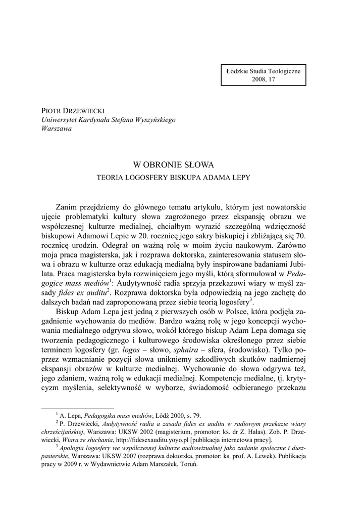 Łódzkie Studia Teologiczne 2008, 17 PIOTR DRZEWIECKI Uniwersytet Kardynała Stefana Wyszyńskiego Warszawa W OBRONIE SŁOWA TEORIA LOGOSFERY BISKUPA ADAMA LEPY Zanim przejdziemy do głównego tematu artykułu, którym jest nowatorskie ujęcie problematyki kultury słowa zagrożonego przez ekspansję obrazu we współczesnej kulturze medialnej, chciałbym wyrazić szczególną wdzięczność biskupowi Adamowi Lepie w 20. rocznicę jego sakry biskupiej i zbliżającą się 70. rocznicę urodzin. Odegrał on ważną rolę w moim życiu naukowym. Zarówno moja praca magisterska, jak i rozprawa doktorska, zainteresowania statusem słowa i obrazu w kulturze oraz edukacją medialną były inspirowane badaniami Jubilata. Praca magisterska była rozwinięciem jego myśli, którą sformułował w Pedagogice mass mediów1: Audytywność radia sprzyja przekazowi wiary w myśl zasady fides ex auditu2. Rozprawa doktorska była odpowiedzią na jego zachętę do dalszych badań nad zaproponowaną przez siebie teorią logosfery3. Biskup Adam Lepa jest jedną z pierwszych osób w Polsce, która podjęła zagadnienie wychowania do mediów. Bardzo ważną rolę w jego koncepcji wychowania medialnego odgrywa słowo, wokół którego biskup Adam Lepa domaga się tworzenia pedagogicznego i kulturowego środowiska określonego przez siebie terminem logosfery (gr. logos – słowo, sphaira – sfera, środowisko). Tylko poprzez wzmacnianie pozycji słowa unikniemy szkodliwych skutków nadmiernej ekspansji obrazów w kulturze medialnej. Wychowanie do słowa odgrywa też, jego zdaniem, ważną rolę w edukacji medialnej. Kompetencje medialne, tj. krytycyzm myślenia, selektywność w wyborze, świadomość odbieranego przekazu 1 A. Lepa, Pedagogika mass mediów, Łódź 2000, s. 79. P. Drzewiecki, Audytywność radia a zasada fides ex auditu w radiowym przekazie wiary chrześcijańskiej, Warszawa: UKSW 2002 (magisterium, promotor: ks. dr Z. Hałas). Zob. P. Drzewiecki, Wiara ze słuchania, http://fidesexauditu.yoyo.pl [publikacja internetowa pracy]. 3 Apologia logosfery we współczesnej kulturze audiowizualnej jako zadanie społeczne i duszpasterskie, Warszawa: UKSW 2007 (rozprawa doktorska, promotor: ks. prof. A. Lewek). Publikacja pracy w 2009 r. w Wydawnictwie Adam Marszałek, Toruń. 2 PIOTR DRZEWIECKI 54 możemy rozwijać przede wszystkim opierając się na osobistej kulturze myślenia i mówienia oraz – co jest rzadko spotykanym dziś postulatem – kulturę ciszy4. W 2003 r. biskup Adam Lepa opublikował pracę pt. Funkcja logosfery w wychowaniu do mediów”5, w której prezentuje swoją teorię. Ale już od połowy lat dziewięćdziesiątych publikuje naukowe i publicystyczne artykuły dotyczące tej tematyki m.in. w „Wiadomościach Archidiecezjalnych Łódzkich” i w tygodniku „Niedziela”6. W artykule chciałbym zaprezentować główne elementy teorii logosfery w ujęciu biskupa Adama Lepy oraz własne propozycje rozwinięcia niektórych tez Jubilata. 1. ŚRODOWISKO SŁOWA Zdajemy sobie sprawę z ogromnej roli, jaką słowo pełni w kulturze. Tutaj posługujemy się jednak terminem logosfery. Co daje takie ujęcie? Dlaczego warto mówić o środowisku słowa, a nie o samym słowie? Jak to środowisko scharakteryzować współcześnie? Jak przedstawić jego strukturę? Jaka jest również filozoficzna interpretacja logosu – rozumianego nie tylko jako słowo, ale także jako myśl i sens? Jak Logos postrzega teologia chrześcijańska? Filozofia grecka przedstawia logos głównie jako rozum kosmiczny7. Logos tłumaczymy nie tylko jako mowę, ale przede wszystkim jako myślenie i rozum. Pierwszym z filozofów, który tak właśnie definiował to pojęcie był Heraklit z Efezu. Logos jest – według niego – wszechobecną zasadą, wedle której wszystko zachodzi i przez którą objawia się powszechny ład, czyli kosmos. Podobnie uważali również filozofowie stoiccy. Dostrzegali jedno prawo rządzące zarówno makro-, jak i mikrokosmosem. Racjonalna zasada wszechjedności świata jest rozrzucona we wszystkich istotach żyjących na podobieństwo nasion, stąd określenie logos spermatikoi. Idea nasion rozumnych (racji zarodkowych) powraca również w myśli teologicznej św. Augustyna, a w średniowieczu – u Bonawentury. Poznawanie świata fizycznego jest odkrywaniem sensu. To, co nie jest logiczne lub sprzeczne samo w sobie nie ma prawa istnienia w przyrodzie. Wszystko, co istnieje, jest 4 A. Lepa, Cisza jako środek wychowania do mediów, WAŁ, 2000, nr 12, s. 787–791. A. Lepa, Funkcja logosfery w wychowaniu do mediów, Łódź 2003. 6 A. Lepa, Co to jest logosfera? WAŁ, 1995, nr 12, s. 583–585; tenże, Cywilizacja obrazu? Teo-Filos” 1997, nr 1, s. 3; tenże, Dlaczego logosfera? „Niedziela” 1996, nr 6, s. 9; tenże, Dlaczego obraz? WAŁ, 1997, nr 10, s. 476–481; tenże, Dziennikarz i logosfera, http://www.archidiecezja. pl/czytelni/lepa/dzienni.html; tenże, Logosfera, „Łódzkie Studia Teologiczne” 1995, t. 4, s. 197–202; tenże, Medytując nad słowem, WAŁ, 1998, nr 4, s. 193–197; tenże, Obraz czy słowo?, WAŁ, 2000, nr 9, s. 563–565; tenże, Przemoc obrazów?, „Niedziela”, 1998, nr 20; tenże, Rodzina środowiskiem słowa, WAŁ, 2001, nr 9, s. 449–459; tenże, Uwięzienie słowa czy ekspansja obrazu, „Etos”, 1993, nr 4, s. 20–35; tenże, Więcej czytać, mniej oglądać, „Niedziela”, 2002, nr 37; tenże, Wychowywać do audiowizji, WAŁ, 1986, nr 7–8, s. 154–161. 7 J. Zdybel, Logos, w: Mała encyklopedia filozofii, Bydgoszcz 1996, s. 269. 5 W OBRONIE SŁOWA. TEORIA LOGOSFERY BISKUPA ADAMA LEPY 55 zgodne z logosferą – możemy powiedzieć: ma sens. Człowiek jak inne byty materialne jest składnikiem struktur logosfery, bo inaczej nie mógłby zaistnieć. Inny istotny związek, który również możemy zauważyć, rozważając istotę pojęcia logosu, dotyczy powiązań między myśleniem a mówieniem, co szczególnie podkreśla współcze