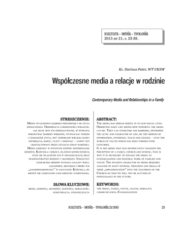 Kultura – Media – Teologia 2015 nr 21, s. 23-38. Ks. Dariusz Pater, WT UKSW Współczesne media a relacje w rodzinie Contemporary Media and Relationships in a Family STRESZCZENIE: MEDIA WYJĄTKOWO GŁĘBOKO PRZENIKNĘŁY DO ŻYCIA SPOŁECZNEGO. OBSERWACJA CODZIENNOŚCI POKAZUJE, JAK SILNE JEST ICH ODDZIAŁYWANIE, IŻ POTRAFIĄ POKONYWAĆ BARIERY WIEKOWE, WYZNACZAĆ POZIOM I CHARAKTER ŻYCIA, BYĆ NOŚNIKAMI WIELKIEJ ILOŚCI INFORMACJI, BAWIĆ, UCZYĆ I ZMIENIAĆ – NAWET TEN UKSZTAŁTOWANY PRZEZ STULECIA ŚWIAT WARTOŚCI. MEDIA ZMIENIŁY W ISTOTNYM STOPNIU POSTRZEGANIE RODZINY, KOŚCIOŁA I SZKOŁY, DLATEGO KONIECZNOŚCIĄ STAJE SIĘ WŁĄCZENIE ICH W EWANGELIZACJĘ ORAZ DUSZPASTERSTWO RODZINY I MŁODZIEŻY. INWAZYJNY CHARAKTER MEDIÓW WYMAGA ANALIZY WIELU ZAGADNIEŃ, REFLEKSJI I PRÓBY ICH „ZAGOSPODAROWANIA” W NAUCZANIU KOŚCIOŁA, BY KIEDYŚ NIE ZARZUCONO NAM GRZECHU ZANIECHANIA. SŁOWA KLUCZOWE: MEDIA, RODZINA, MŁODZIEŻ, WARTOŚCI, MORALNOŚĆ, KOMUNIKACJA, EWANGELIZACJA ABSTRACT: THE MEDIA HAS SPREAD DEEPLY IN TO OUR SOCIAL LIVES. OBSERVING DAILY LIFE SHOWS HOW POWERFUL THE MEDIA CAN BE. THEY CAN OVERCOME AGE BARRIERS, DETERMINE THE LEVEL AND CHARACTER OF LIFE, BE THE MEDIUM OF INFORMATION, ENTERTAIN, TEACH AND CHANGE – EVEN THE WORLD OF VALUES WHICH HAS BEEN FORMED OVER CENTURIES. IT IS THE MEDIA THAT HAS SIGNIFICANTLY CHANGED THE PERCEPTION OF A FAMILY, CHURCH AND SCHOOL; THAT IS WHY IT IS NECESSARY TO ENGAGE THE MEDIA TO EVANGELIZATION AND PASTORAL WORK OF FAMILIES AND YOUTH. THE INVASIVE CHARACTER OF MEDIA REQUIRES ANALYSIS OF MANY NOTIONS, THOUGHTS AND TRIALS OF „IMPLEMENTATION” INTO THE TEACHINGS OF THE CHURCH SO THAT WE WILL NOT BE ACCUSED OF NONFEASANCE IN THE FUTURE. THEIR KEYWORDS: THE MEDIA, FAMILY, YOUTH, VALUES, MORALITY, COMMUNICATION, EVANGELIZATION Kultura – Media – Teologia 21/2015 23 MEDIA, RELACJE, KOMUNIKACJA Ś wiat współczesny postrzegany jest jako ciąg obrazów, bowiem zdecydowana większość ludzi poprzez wzrok i za pomocą obrazów poznaje otaczającą ich rzeczywistość. Jak twierdzi Witold Kawecki, „żyjemy w epoce obrazu i nawet nie w pełni uświadamiamy sobie, jak głęboko kształtuje on nasz światopogląd kulturowy (…) oraz jak dalece warunkuje poznanie religijne czy zmysłowe” 1. Trzeba zaznaczyć, że funkcjonuje kilkanaście koncepcji obrazu, zależnie od dziedziny nauki, która ten problem analizuje. Inaczej definiuje obraz historyk czy filozof, inaczej teolog, jeszcze inne spojrzenie na obraz prezentują artyści czy znawcy mediów. Wspomnieć należy, że komunikowanie i porozumiewanie się to trwały element składowy cywilizacji ludzkiej. Charakterystyczna dla procesów komunikowania masowego jest ich znaczna technicyzacja (ostatnio komputeryzacja), instytucjonalizacja i sformalizowanie dróg przekazu2. Komunikowanie się za pomocą masmediów stało się jednak możliwe dopiero od około II połowy XV wieku. Pierwszym etapem umasowienia tego procesu było wynalezienie druku, później upowszechnienie książek i prasy, zaś następne etapy związane są z rozwojem mediów audiowizualnych - radia, telewizji i Internetu. W tym kontekście także mówimy o tzw. komunikacji wizualnej - poprzez obraz uzupełniony pewnymi treściami, który może skutecznie trafiać do odbiorcy i oddziaływać na niego3. Od początku istnienia mediów masowych daje się zauważyć ogromny ich wpływ na ludzi. Pod wpływem różnego typu przekazów medialnych ludzie czynią wiele dobra, choć media mogą też wpływać na odbiorców negatywnie, wyzwalając w odbiorcach najniższe instynkty - jeśli nie zachęcają wprost do czynienia zła, to akceptują wyrządzanie krzywdy innym, z odbieraniem prawa do życia włącznie. Odnosi się to szczególnie do dzieci i młodzieży, ponieważ młody odbiorca - niedojrzały i niedoświadczony życiowo, nie potrafi odróżnić telewizyjnej fikcji od realiów codziennej rzeczywistości4. Współczesne media, tak publiczne jak i komercyjne, znalazły się w kręgu zainteresowań wielu badaczy i grup społecznych, stały się również przedmiotem dyskusji. I nie powinno to nikogo dziwić, bowiem ich znaczenie, szczególnie w ostatnich latach, systematycznie rośnie. Cezura czasowa, do której odnoszą się te rozważania, obejmuje ostatnie 25 lat, choć tak naprawdę mówimy o nieustannej transformacji mediów. Według redaktorów książki „Media w transformacji” ta ciągła ewolucja dotyczy wielu znaczących elementów, spośród których warto wskazać choćby treści i formy przekazu oraz różnorodne narzędzia komunikacji5. Wielka popularność wszystkich mediów (kina, radia, telewizji czy Internetu) skłania do refleksji i badań na ich rolą oraz siłą wpływu, tym bardziej, że zdaniem badaczy 1 2 3 4 5 24 W. Kawecki, Wizualność kultury i teologii, [w]: W. Kawecki, J.S. Wojciechowski, D. Żukowska-Gardzińska (red.), Kultura wizualna – teologia wizualna, Warszawa 2011, s. 18. Por. P. Kossowski, Dziecko i reklama telewizyjna, Warszawa 1999, s. 43. Por. W. Kawecki, Wizualność kultury i teologii, art. cyt., s. 18–19. Por. W. Sonczyk , Media w Polsce. Zarys problematyki, Warszawa 1999, s. 149. Por. A. Gralczyk, K. Marcyński, M. Przybysz, Wstęp, [w]: A. Gralczyk, K. Marcyński, M. Przybysz (red.), Media w transformacji, Warszawa 2013, s. 11. Kultura – Media – Teologia 21/2015 D. Pater, Współczesne media a relacje w rodzinie sama problematyka wpływu środków masowego oddziaływania jest istotna i złożona, podobnie jak wieloznaczne jest samo pojęcie „wpływ telewizji”, wskazujące na szeroki zakres znaczeniowy i długotrwały proces przejawiający się w szeregu nieraz trudno uchwytnych zmian w różnych sferach osobowości ludzkiej6. Popularne powiedzenie „czwarta władza” nie jest tak naprawdę pozbawione sensu, widać bowiem, że współczesne media stają się przedmiotem jawnej i nie zawsze czystej gry czy walki politycznej oraz są próbą zdominowania ic