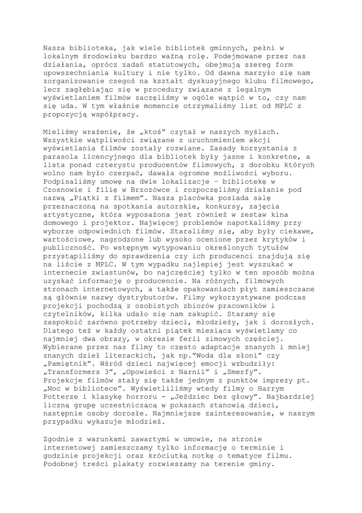 Nasza biblioteka, jak wiele bibliotek gminnych, pełni w lokalnym środowisku bardzo ważną rolę. Podejmowane przez nas działania, oprócz zadań statutowych, obejmują szereg form upowszechniania kultury i nie tylko. Od dawna marzyło się nam zorganizowanie czegoś na kształt dyskusyjnego klubu filmowego, lecz zagłębiając się w procedury związane z legalnym wyświetlaniem filmów zaczęliśmy w ogóle wątpić w to, czy nam się uda. W tym właśnie momencie otrzymaliśmy list od MPLC z propozycją współpracy. Mieliśmy wrażenie, że „ktoś” czytał w naszych myślach. Wszystkie wątpliwości związane z uruchomieniem akcji wyświetlania filmów zostały rozwiane. Zasady korzystania z parasola licencyjnego dla bibliotek były jasne i konkretne, a lista ponad czterystu producentów filmowych, z dorobku których wolno nam było czerpać, dawała ogromne możliwości wyboru. Podpisaliśmy umowę na dwie lokalizacje – bibliotekę w Czosnowie i filię w Brzozówce i rozpoczęliśmy działanie pod nazwą „Piątki z filmem”. Nasza placówka posiada salę przeznaczoną na spotkania autorskie, konkursy, zajęcia artystyczne, która wyposażona jest również w zestaw kina domowego i projektor. Najwięcej problemów napotkaliśmy przy wyborze odpowiednich filmów. Staraliśmy się, aby były ciekawe, wartościowe, nagrodzone lub wysoko ocenione przez krytyków i publiczność. Po wstępnym wytypowaniu określonych tytułów przystąpiliśmy do sprawdzenia czy ich producenci znajdują się na liście z MPLC. W tym wypadku najlepiej jest wyszukać w internecie zwiastunów, bo najczęściej tylko w ten sposób można uzyskać informację o producencie. Na różnych, filmowych stronach internetowych, a także opakowaniach płyt zamieszczane są głównie nazwy dystrybutorów. Filmy wykorzystywane podczas projekcji pochodzą z osobistych zbiorów pracowników i czytelników, kilka udało się nam zakupić. Staramy się zaspokoić zarówno potrzeby dzieci, młodzieży, jak i dorosłych. Dlatego też w każdy ostatni piątek miesiąca wyświetlamy co najmniej dwa obrazy, w okresie ferii zimowych częściej. Wybierane przez nas filmy to często adaptacje znanych i mniej znanych dzieł literackich, jak np.”Woda dla słoni” czy „Pamiętnik”. Wśród dzieci najwięcej emocji wzbudziły: „Transformers 3”, „Opowieści z Narnii” i „Smerfy”. Projekcje filmów stały się także jednym z punktów imprezy pt. „Noc w bibliotece”. Wyświetliliśmy wtedy filmy o Harrym Potterze i klasykę horroru - „Jeździec bez głowy”. Najbardziej liczną grupę uczestniczącą w pokazach stanowią dzieci, następnie osoby dorosłe. Najmniejsze zainteresowanie, w naszym przypadku wykazuje młodzież. Zgodnie z warunkami zawartymi w umowie, na stronie internetowej zamieszczamy tylko informację o terminie i godzinie projekcji oraz króciutką notkę o tematyce filmu. Podobnej treści plakaty rozwieszamy na terenie gminy. Natomiast na naszym profilu na facebook-u i w bibliotece dodajemy również tytuł i zdjęcie z okładki płyty. „Piątki z filmem” sprawiły, że czosnowska biblioteka poszerzyła swoją ofertę kulturalną i zyskuje tym samym coraz więcej użytkowników i czytelników. Dla wielu mieszkańców gminy Czosnów udział w pokazach stał się jedyną możliwością kontaktu z kinem. Dotyczy to przede wszystkim tych, których nie stać na wyjazd na film do Warszawy. Podczas naszej współpracy z MPLC napotkaliśmy jeden poważniejszy problem, który na szczęście, dzięki szybkiej interwencji przedstawiciela firmy został rozwiązany. Dotyczył on jednego z wyświetlonych filmów, którego dystrybutor zadzwonił do nas z informacją, że złamaliśmy prawo, a MPLC działa nielegalnie. Okazało się, że wszystkie podejmowane przez nas działania były zgodne z umową, a film wykorzystany podczas pokazu miał dwóch producentów. Jeden z nich znajdował się na liście MPLC, lecz swoje prawa przekazał drugiemu producentowi – o czym my oczywiście nie wiedzieliśmy. Dotyczyło to tego jednego tytułu. Pracownik MPLC kilkakrotnie kontaktował się z nami, wyjaśniał. Zobowiązał się również,że w razie jakichkolwiek problemów, to on będzie rozmawiał z dystrybutorem. Wszystko zakończyło się dobrze, lecz na wszelki wypadek postanowiliśmy „omijać” filmy tego dystrybutora. W przyszłym roku z pewnością ponownie skorzystamy z parasola licencyjnego MPLC, do czego zachęcamy inne biblioteki. Anna Maliszewska Kierownik GBP w Czosnowie