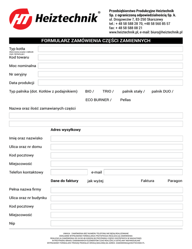 Przedsiębiorstwo Produkcyjne Heiztechnik Sp. z ograniczoną odpowiedzialnością Sp. k. ul. Drogowców 7, 83-250 Skarszewy tel.: + 48 58 588 28 70, +48 58 560 85 57 fax: + 48 58 588 08 21 www.heiztechnik.pl, e-mail: [email protected] FORMULARZ ZAMÓWIENIA CZĘŚCI ZAMIENNYCH Typ kotła (Dane można oczytać z tabliczki znam. lub karty gw.) Kod towaru Moc nominalna Nr seryjny Data produkcji Typ palnika (dot. Kotłów z podajnikiem) BIO / TRIO / ECO BURNER / palnik stały / palnik DUO / Pellas Nazwa oraz ilość zamawianych części Adres wysyłkowy Imię oraz nazwisko Ulica oraz nr domu Kod pocztowy Miejscowość Telefon kontaktowy e-mail Dane do faktury Faktura jak wyżej Pełna nazwa firmy Ulica oraz nr budynku Kod pocztowy Miejscowość Nip UWAGA: ZAMÓWIENIA BEZ NUMERU TELEFONU NIE BĘDĄ REALIZOWANE DOKŁADNE WYPEŁNIENIE FORMULARZA PRZYSPIESZA REALIZACJĘ ZAMÓWIENIA REALIZACJA ZAMÓWIENIA OD 24 DO 48 GODZIN (W PRZYPADKU CZĘŚCI DOSTĘPNYCH W MAGAZYNIE) W PRZYPADKU BRAKU ZAMAWIANYCH ELEMENTÓW CZAS REALIZACJI USTALANY INDYWIDUALNIE WYPEŁNIONY FORMULARZ PROSZĘ PRZESŁAĆ DROGĄ MAILOWĄ NA ADRES: [email protected] Paragon