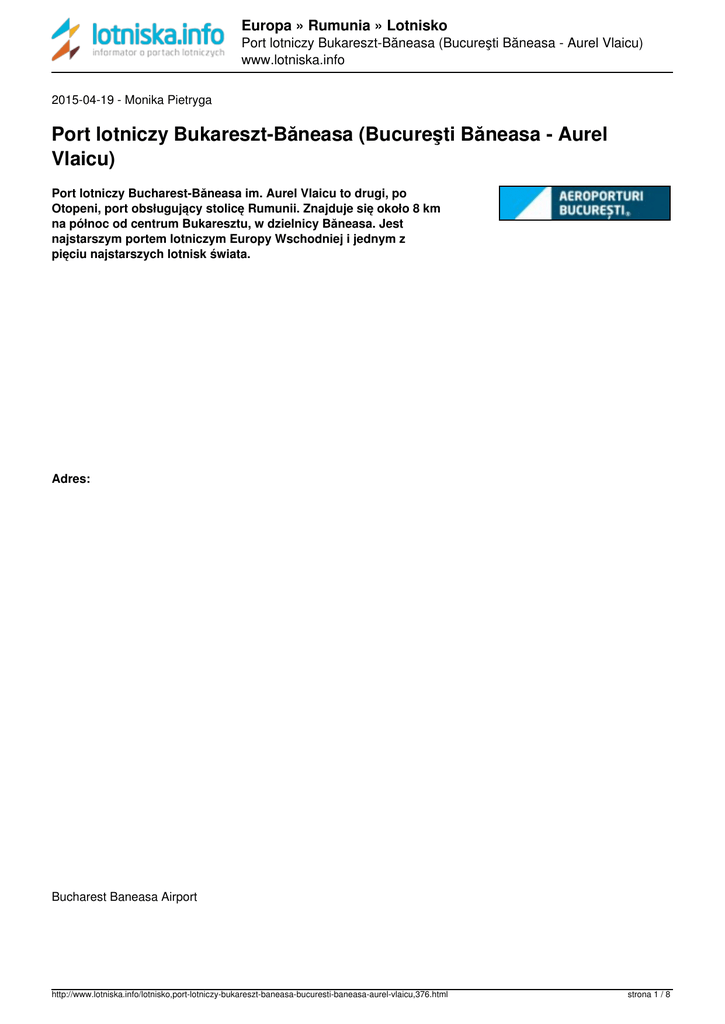 Europa » Rumunia » Lotnisko Port lotniczy Bukareszt-Băneasa (Bucureşti Băneasa - Aurel Vlaicu) www.lotniska.info 2015-04-19 - Monika Pietryga Port lotniczy Bukareszt-Băneasa (Bucureşti Băneasa - Aurel Vlaicu) Port lotniczy Bucharest-Băneasa im. Aurel Vlaicu to drugi, po Otopeni, port obsługujący stolicę Rumunii. Znajduje się około 8 km na północ od centrum Bukaresztu, w dzielnicy Băneasa. Jest najstarszym portem lotniczym Europy Wschodniej i jednym z pięciu najstarszych lotnisk świata. Adres: Bucharest Baneasa Airport http://www.lotniska.info/lotnisko,port-lotniczy-bukareszt-baneasa-bucuresti-baneasa-aurel-vlaicu,376.html strona 1 / 8 Europa » Rumunia » Lotnisko Port lotniczy Bukareszt-Băneasa (Bucureşti Băneasa - Aurel Vlaicu) www.lotniska.info Soseaua Bucuresti-Ploiesti Nr 40 Sector 1, code 013695 http://www.lotniska.info/lotnisko,port-lotniczy-bukareszt-baneasa-bucuresti-baneasa-aurel-vlaicu,376.html strona 2 / 8 Europa » Rumunia » Lotnisko Port lotniczy Bukareszt-Băneasa (Bucureşti Băneasa - Aurel Vlaicu) www.lotniska.info Bucharest - Romania Kontakt: Informacja: +40 21 2320020; +40 21 9371 Strona internetowa: www.baneasa-airport.com, http://www.lotniska.info/lotnisko,port-lotniczy-bukareszt-baneasa-bucuresti-baneasa-aurel-vlaicu,376.html strona 3 / 8 Europa » Rumunia » Lotnisko Port lotniczy Bukareszt-Băneasa (Bucureşti Băneasa - Aurel Vlaicu) www.lotniska.info www.bucharestairports.ro/baneasa Email: [email protected]; Tabela lotów: Odloty Tabela lotów: Przyloty Linie lotnicze operujące z lotniska Băneasa Zobacz lądowanie na lotnisku Bukareszt- Băneasa (wideo): http://www.lotniska.info/lotnisko,port-lotniczy-bukareszt-baneasa-bucuresti-baneasa-aurel-vlaicu,376.html strona 4 / 8 Europa » Rumunia » Lotnisko Port lotniczy Bukareszt-Băneasa (Bucureşti Băneasa - Aurel Vlaicu) www.lotniska.info Opis Port lotniczy Bukareszt-Băneasa nosi imię Aurel Vlaicu, rumuńskiego inżyniera, wynalazcy, pilota i konstruktora samolotów. Lotnisko to jest najstarszym portem lotniczym Europy Wschodniej i jednym z pięciu najstarszych lotnisk świata. Do 1965 roku było jedynym portem lotniczym w Bukareszcie, aż do otwarcia Otopeni Airport im. Henri Coandă. Pierwsze loty na dzisiejszym obszarze lotniska miały miejsce w 1909 roku. W 1912 roku otworzono tam pierwszą rumuńską szkołę lotnictwa. Terminal zaprojektowany w latach 40-tych, został uroczyście otworzony w 1952. Do marca 2012 roku lotnisko im. Aurel Vlaicu było bazą dla tanich linii lotniczych. W marcu 2012 roku zostało zmienione w lotnisko o charakterze wyłącznie binesowym, a bazy tanich przewoźników przeniesiono na lotnisko Otopeni. Od tego czasu port lotniczy Aurel Vlaicu obsługuje tylko loty czarterowe i prywatne. DOJAZD Samochodem Odległość z lotniska do centrum Bukaresztu to około 8,5 km. Przejazd trwa około 10 minut. Połączenie lotniska z miastem zapewnia droga krajowa DN-1, która prowadzi do północno- zachodniej części kraju. Autobusem Istnieje kilka połączeń autobusowych z lotniska do centrum miasta: 131, 335, 148, 112, 301. http://www.lotniska.info/lotnisko,port-lotniczy-bukareszt-baneasa-bucuresti-baneasa-aurel-vlaicu,376.html strona 5 / 8 Europa » Rumunia » Lotnisko Port lotniczy Bukareszt-Băneasa (Bucureşti Băneasa - Aurel Vlaicu) www.lotniska.info Linia 131 Piaţa Romana, Piaţa Victoriei, Şoseaua Kiseleff, Piaţa Presei Libere, Şoseaua Bucureşti-Ploieşti, Băneasa Airport . Linia 335 Barajul Dunării, Bulevardul Nicolae Grigorescu, Şoseaua Iancului, Şoseaua Ştefan cel Mare, Calea Dorobanţilor, Şoseaua Kiseleff, Piaţa Presei Libere, Şoseaua Bucureşti-Ploieşti, Băneasa Airport . Linia 148 Piaţa Presei Libere, Şoseaua Bucureşti-Ploieşti, Băneasa Airport. Linia 112 Şoseaua Pipera, Bulevardul Aerogării, Airport Băneasa. Linia 301 Piaţa Victoriei, Bulevardul Aviatorilor, Bulevardul Aerogării, Băneasa Airoport. Linia pospieszna 783 Piaţa Unirii - Băneasa Airport - Otopeni Airport http://www.lotniska.info/lotnisko,port-lotniczy-bukareszt-baneasa-bucuresti-baneasa-aurel-vlaicu,376.html strona 6 / 8 Europa » Rumunia » Lotnisko Port lotniczy Bukareszt-Băneasa (Bucureşti Băneasa - Aurel Vlaicu) www.lotniska.info Tramwaj nr 5 Piaţa Galaţi - Băneasa Airport Metro: linia M2 (więcej informacji na stronie) Wypożyczenie samochodu Rezerwacja samochodu z największą rumuńską wypożyczalnią aut Active Rent a Car możliwa na stronie: www.bucarest-rentacar.com Parking http://www.lotniska.info/lotnisko,port-lotniczy-bukareszt-baneasa-bucuresti-baneasa-aurel-vlaicu,376.html strona 7 / 8 Europa » Rumunia » Lotnisko Port lotniczy Bukareszt-Băneasa (Bucureşti Băneasa - Aurel Vlaicu) www.lotniska.info Dostępny jest tylko krtótkoterminowy parking. Koszt 4 lei/godz. Źródło: (www.baneasa-airport.com; http://www.bucharestairports.ro/baneasa/en) http://www.lotniska.info/lotnisko,port-lotniczy-bukareszt-baneasa-bucuresti-baneasa-aurel-vlaicu,376.html http://www.lotniska.info/lotnisko,port-lotniczy-bukareszt-baneasa-bucuresti-baneasa-aurel-vlaicu,376.html Powered by TCPDF (www.tcpdf.org) strona 8 / 8