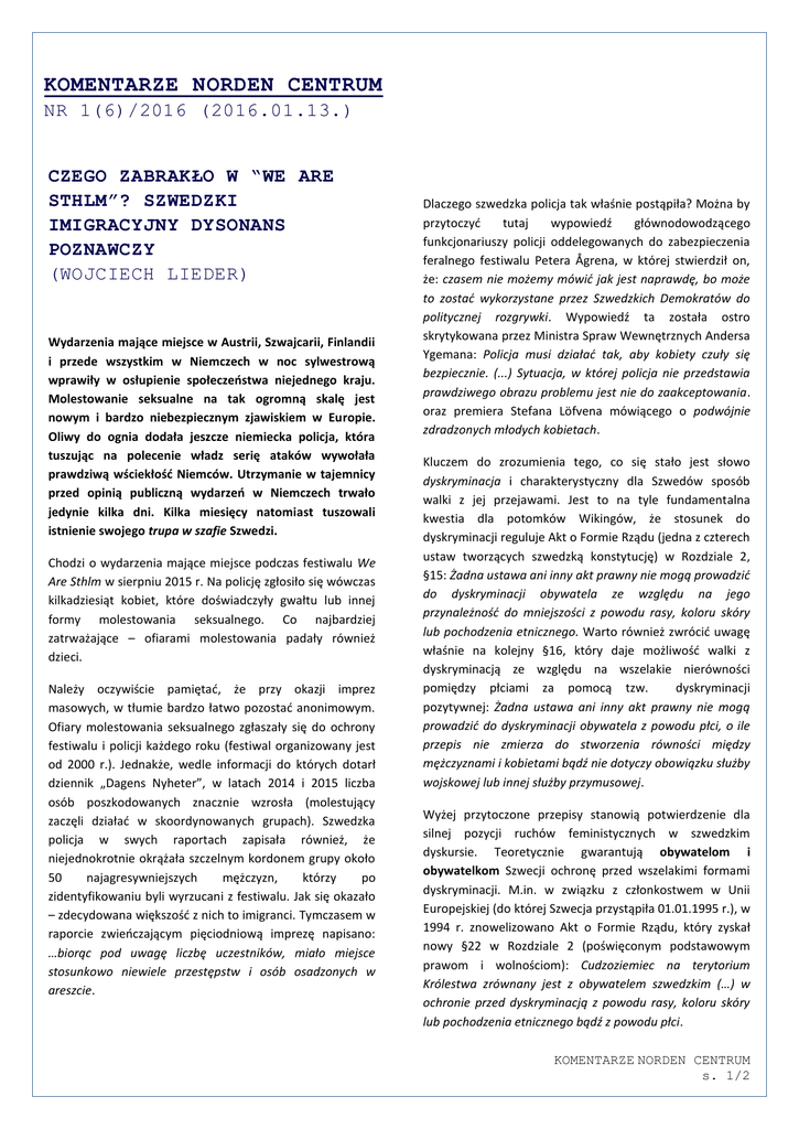 KOMENTARZE NORDEN CENTRUM NR 1(6)/2016 (2016.01.13.) CZEGO ZABRAKŁO W “WE ARE STHLM”? SZWEDZKI IMIGRACYJNY DYSONANS POZNAWCZY (WOJCIECH LIEDER) Wydarzenia mające miejsce w Austrii, Szwajcarii, Finlandii i przede wszystkim w Niemczech w noc sylwestrową wprawiły w osłupienie społeczeństwa niejednego kraju. Molestowanie seksualne na tak ogromną skalę jest nowym i bardzo niebezpiecznym zjawiskiem w Europie. Oliwy do ognia dodała jeszcze niemiecka policja, która tuszując na polecenie władz serię ataków wywołała prawdziwą wściekłość Niemców. Utrzymanie w tajemnicy przed opinią publiczną wydarzeń w Niemczech trwało jedynie kilka dni. Kilka miesięcy natomiast tuszowali istnienie swojego trupa w szafie Szwedzi. Chodzi o wydarzenia mające miejsce podczas festiwalu We Are Sthlm w sierpniu 2015 r. Na policję zgłosiło się wówczas kilkadziesiąt kobiet, które doświadczyły gwałtu lub innej formy molestowania seksualnego. Co najbardziej zatrważające – ofiarami molestowania padały również dzieci. Należy oczywiście pamiętać, że przy okazji imprez masowych, w tłumie bardzo łatwo pozostać anonimowym. Ofiary molestowania seksualnego zgłaszały się do ochrony festiwalu i policji każdego roku (festiwal organizowany jest od 2000 r.). Jednakże, wedle informacji do których dotarł dziennik „Dagens Nyheter”, w latach 2014 i 2015 liczba osób poszkodowanych znacznie wzrosła (molestujący zaczęli działać w skoordynowanych grupach). Szwedzka policja w swych raportach zapisała również, że niejednokrotnie okrążała szczelnym kordonem grupy około 50 najagresywniejszych mężczyzn, którzy po zidentyfikowaniu byli wyrzucani z festiwalu. Jak się okazało – zdecydowana większość z nich to imigranci. Tymczasem w raporcie zwieńczającym pięciodniową imprezę napisano: …biorąc pod uwagę liczbę uczestników, miało miejsce stosunkowo niewiele przestępstw i osób osadzonych w areszcie. Dlaczego szwedzka policja tak właśnie postąpiła? Można by przytoczyć tutaj wypowiedź głównodowodzącego funkcjonariuszy policji oddelegowanych do zabezpieczenia feralnego festiwalu Petera Ågrena, w której stwierdził on, że: czasem nie możemy mówić jak jest naprawdę, bo może to zostać wykorzystane przez Szwedzkich Demokratów do politycznej rozgrywki. Wypowiedź ta została ostro skrytykowana przez Ministra Spraw Wewnętrznych Andersa Ygemana: Policja musi działać tak, aby kobiety czuły się bezpiecznie. (...) Sytuacja, w której policja nie przedstawia prawdziwego obrazu problemu jest nie do zaakceptowania. oraz premiera Stefana Löfvena mówiącego o podwójnie zdradzonych młodych kobietach. Kluczem do zrozumienia tego, co się stało jest słowo dyskryminacja i charakterystyczny dla Szwedów sposób walki z jej przejawami. Jest to na tyle fundamentalna kwestia dla potomków Wikingów, że stosunek do dyskryminacji reguluje Akt o Formie Rządu (jedna z czterech ustaw tworzących szwedzką konstytucję) w Rozdziale 2, §15: Żadna ustawa ani inny akt prawny nie mogą prowadzić do dyskryminacji obywatela ze względu na jego przynależność do mniejszości z powodu rasy, koloru skóry lub pochodzenia etnicznego. Warto również zwrócić uwagę właśnie na kolejny §16, który daje możliwość walki z dyskryminacją ze względu na wszelakie nierówności pomiędzy płciami za pomocą tzw. dyskryminacji pozytywnej: Żadna ustawa ani inny akt prawny nie mogą prowadzić do dyskryminacji obywatela z powodu płci, o ile przepis nie zmierza do stworzenia równości między mężczyznami i kobietami bądź nie dotyczy obowiązku służby wojskowej lub innej służby przymusowej. Wyżej przytoczone przepisy stanowią potwierdzenie dla silnej pozycji ruchów feministycznych w szwedzkim dyskursie. Teoretycznie gwarantują obywatelom i obywatelkom Szwecji ochronę przed wszelakimi formami dyskryminacji. M.in. w związku z członkostwem w Unii Europejskiej (do której Szwecja przystąpiła 01.01.1995 r.), w 1994 r. znowelizowano Akt o Formie Rządu, który zyskał nowy §22 w Rozdziale 2 (poświęconym podstawowym prawom i wolnościom): Cudzoziemiec na terytorium Królestwa zrównany jest z obywatelem szwedzkim (…) w ochronie przed dyskryminacją z powodu rasy, koloru skóry lub pochodzenia etnicznego bądź z powodu płci. KOMENTARZE NORDEN CENTRUM s. 1/2 Przepis ten zrównał zatem prawa do wolności od dyskryminacji już nie tylko obywateli, ale również cudzoziemców (niekoniecznie obywateli UE!) przebywających na terytorium Szwecji. Należy jednak zauważyć, że o ile zasady i ograniczenia zawarte w dokumentach europejskich – w tym w Konwencji o ochronie praw człowieka i podstawowych wolności Rady Europy czy Karcie Praw Podstawowych Unii Europejskiej (która obecnie stanowi, na podstawie Traktatu z Lizbony, część prawa pierwotnego (traktatów) UE) – sprawdzają się w ramach europejskiego kręgu kulturowego, o tyle napotykają one na mnogość dysonansów w zetknięciu z imigrantami pochodzącymi spoza Europy, z odmiennych kręgów kulturowych. Wieloletnia pobłażliwość w stosunku do występków imigrantów wynikała przede wszystkim z niechęci do eskalacji konfliktów w społeczeństwie. Tajemnicą poliszynela jest, że szwedzki system asymilacji imigrantów – pomimo swojej znacznej w porównaniu z systemami w innych krajach skuteczności – nie zapobiegł tworzeniu się dzielnic, w których imigranci (głównie muzułmanie) stanowią duży odsetek ludności, która nie jest w stanie zasymilować się z resztą społeczeństwa. Czara goryczy przelała się jednak wraz z odkryciem nagannych praktyk szwedzkiej policji. Dlaczego właśnie to wydarzenie stało się katalizatorem ożywionej, miejscami wywołującej bardzo skrajne emocje, dyskusji? Ponieważ pojawił się konflikt dwóch bardzo silnie zakorzenionych w Szwedzkim dyskursie wartości: poszanowania i wyrównywania praw kobiet oraz otwartości na przybyszów z
