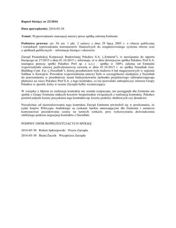 Raport bieżący nr 23/2016 Data sporządzenia: 2016-05-30 Temat: Wypowiedzenie znaczącej umowy przez spółkę zależną Emitenta Podstawa prawna: art. 56 ust. 1 pkt. 2 ustawy z dnia 29 lipca 2005 r. o ofercie publicznej i warunkach wprowadzania instrumentów finansowych do zorganizowanego systemu obrotu oraz o spółkach publicznych – informacje bieżące i okresowe Zarząd Poznańskiej Korporacji Budowlanej Pekabex S.A. („Emitent”), w nawiązaniu do raportu bieżącego nr 27/2015 z dnia 01.10.2015 r. informuje, iż w dniu dzisiejszym spółka Pekabex Pref S.A. (następca prawny spółki Pekabex Pref sp. z o.o.) - spółka w 100% zależna od Emitenta wypowiedziała umowę podwykonawczą zawartą w dniu 01.10.2015 r. ze spółką Nusaibah Gen. Building Cont. Est. („Nusaibah”), której przedmiotem była budowa 6 hal magazynowych w regionie Subhan w Kuwejcie. Powodem wypowiedzenia umowy było w szczególności niedojście z Nusaibah do porozumienia w przedmiocie zasad funkcjonowania rachunku projektowego zabezpieczającego płatności na rzecz Pekabex Pref S.A. z tego kontraktu, co nie pozwalało zabezpieczyć interesu Grupy Pekabex w sposób, który w ocenie Zarządu byłby wystarczający. W związku z faktem że realizacja kontraktu nie została rozpoczęta, nie pociągnęła dla Emitenta ani spółek z Grupy Emitenta żadnych kosztów bezpośrednio związanych z realizacją kontraktu. Pekabex poniósł jedynie koszty pozyskania tego kontraktu np. koszty podróży służbowych czy doradców. Niezależnie od niezrealizowania tego kontraktu Zarząd Emitenta utwierdził się w przekonaniu, że rynki krajów Półwyspu Arabskiego są rynkami bardzo interesującymi dla Emitenta i zamierza kontynuować poszukiwania szansy na tamtych rynkach, przy wykorzystaniu doświadczenia zdobytego podczas negocjacji kontraktu z Nusiabah. PODPISY OSÓB REPREZENTUJĄCYCH SPÓŁKĘ 2016-05-30 Robert Jędrzejowski Prezes Zarządu 2016-05-30 Beata Żaczek Wiceprezes Zarządu