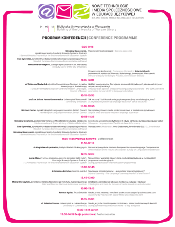 NOWE TECHNOLOGIE I MEDIA SPOŁECZNOŚCIOWE W EDUKACJI JĘZYKOWEJ ICT AND SOCIAL MEDIA IN LANGUAGE EDUCATION 24 09 12 Biblioteka Uniwersytecka w Warszawie Building of the University of Warsaw Library PROGRAM KONFERENCJI | CONFERENCE PROGRAMME 9:30-9:45 Mirosław Marczewski, Przemówienia otwierające | Opening speeches dyrektor generalny Fundacji Rozwoju Systemu Edukacji | General Director, Foundation for the Development of Education System Ewa Synowiec, dyrektor Przedstawicielstwa Komisji Europejskiej w Polsce | Head of European Commission Representation in Poland Włodzimierz Paszyński, zastępca prezydenta m. st. Warszawy | Deputy Mayor of the City of Warsaw Prowadzenie konferencji | Conference Moderator: Jolanta Urbanik, pełnomocnik rektora ds. Procesu Bolońskiego, Uniwersytet Warszawski | Rector’s Deputy for Bologna Process, University of Warsaw 9:45-10:10 dr Waldemar Martyniuk, dyrektor Europejskiego Centrum Języków Nowożytnych, Rada Europy | Executive Director European Centre for Modern Languages, Council of Europe Wykład inauguracyjny: Rozwijanie sprawności językowych jako zasadniczy cel współczesnej edukacji | Inauguration speech: Empowering language professionals – the ECML activities promoting the use of ICT in language education 10:10-10:35 prof. zw. dr hab. Hanna Komorowska, Uniwersytet Warszawski Jak wczoraj i dziś kształcenia językowego wpłyną na edukacyjne jutro? | University of Warsaw | Can past and present of language education serve its future? 10:35-10:55 Michael Carrier, dyrektor English Language Innovation, British Council Narzędzia cyfrowe i media społecznościowe w kształceniu językowym | Head English Language Innovation, British Council | Digital tools and social media in language education 10:55-11:35 Mirosław Sielatycki, podsekretarz stanu w Ministerstwie Edukacji Narodowej Ceremonia wręczenia certyfikatów XI edycji konkursu European Language Label | Undersecretary of State, Ministry of National Education | European Language Label Certificate Award Ceremony Ewa Synowiec, dyrektor Przedstawicielstwa Komisji Europejskiej w Polsce Prowadzenie | Moderator: Anna Grabowska, koordynator ELL | ELL Coordinator | Head of European Commission Representation in Poland Mirosław Marczewski, dyrektor generalny Fundacji Rozwoju Systemu Edukacji | General Director, Foundation for the Development of Education System 11:35-11:55 Przerwa kawowa | Coffee break 11:55-12:15 dr Magdalena Szpotowicz, Instytut Badań Edukacyjnych Prezentacja wyników badania European Survey on Language Competences | Presentation of the results of European Survey on Language Competences 12:15-12:30 Anna Atłas, dyrektor programu „Uczenie się przez całe życie”, Nowoczesny warsztat nauczyciela a edukacja językowa w europejskich Fundacja Rozwoju Systemu Edukacji programach edukacyjnych | LLP Director, Foundation for the Development of Education System | Language Education in EU education programmes 12:30-12:45 dr Rebecca Böttcher, Goethe-Institut Nauczanie komplemetarne – przyszłość edukacji jęzkowej? | Hybrid Learning – The Language Learning Solution of the Future? 12.45-13.00 Michał Merczyński, dyrektor generalny Narodowego Instytutu Audiowizualnego Strategie i narzędzia do obsługi mediów w kulturze i edukacji | General Director, National Audiovisual Institute | Strategies and tools for the use of media in culture and education 13:00-13:15 Ademar Aguiar, Tecla Colorida Nauka przez zabawę z mediami społecznościowymi @ schoooools.com | Learning by Playing with Social Media @ schoooools.com 13:15-13:30 dr Katerina Zourou, Uniwersytet w Luksemburgu Nauka języków i media społecznościowe – sześć podstawowych kwestii | University of Luxembourg | Language learning and social media – 6 key dialogues 13:30-14:15 Lunch 13:30-14:15 Sesja posterowa | Poster session NOWE TECHNOLOGIE I MEDIA SPOŁECZNOŚCIOWE W EDUKACJI JĘZYKOWEJ ICT AND SOCIAL MEDIA IN LANGUAGE EDUCATION 14:15-16:15 Grupy dyskusyjne: 5 sesji równoległych | Discussion Groups: 5 Parallel Sessions dr Mateusz-Milan Stanojević, Uniwersytet w Zagrzebiu Rozwijanie warsztatu nauczyciela w zakresie | University of Zagreb wykorzystywania narzędzi online w pracy z uczniem | Pauline Ernest, Universitat Oberta de Catalunya – program Rady Europy | Online teacher education, Council of Europe targeted support programme Sala | Room 097 parter | ground floor Moderator: Anna Grabowska, koordynatorka European Language Label, redaktor naczelna czasopisma „Języki Obce w Szkole” | European Language Label coordinator, editor-in-chief of “Języki Obce w Szkole” dr inż., prof. WSIZiA Sławomir Czepielewski, Wyższa Szkoła Informatyki, Zarządzania i Administracji w Warszawie | Warsaw School of Computer Science Daria Drozhninova, Akademia Dyplomatyczna MSZ FR w Moskwie | Diplomatic Academy of the Ministry of Foreign Affairs of the Russian Federation Agnieszka Dryjańska | Sebastian Ducourtioux, Instytut Romanistyki Uniwersytetu Warszawskiego | Institute for French Studies at the University of Warsaw Renata Klimek-Kowalska, Stowarzyszenie Europa Kultur i Języków, Przedstawicielstwo Walonia-Bruksela | Polish Association “Europa Języków i Kultur”, Délégation Wallonie-Bruxelles dr Adrianna Prizel-Kania | Dominika Bucko, Centrum Języka i Kultury Polskiej w Świecie Uniwersytetu Jagiellońskiego | The Center for Polish Language and Culture in the World of the Jagiellonian University Sprawozdawca | Rapporteur: Monika Knapkiewicz, British Council Wykorzystanie narzędzi elektronicznych w nauczaniu i uczeniu się języków obcych | ICT in foreign language teaching and learninig Sala | Room 134 1. piętro | 1st floor Moderator: Sylvia Maciaszczyk, Instytut Filologii Angielskiej, Szkoła Wyższa Psychologii Społecznej w Warszawie, Szkoła Języków Obcych empik School, Learning Systems Poland | Institute of English Studies, University of Social Sciences and Humanities in Warsaw, empik Language School