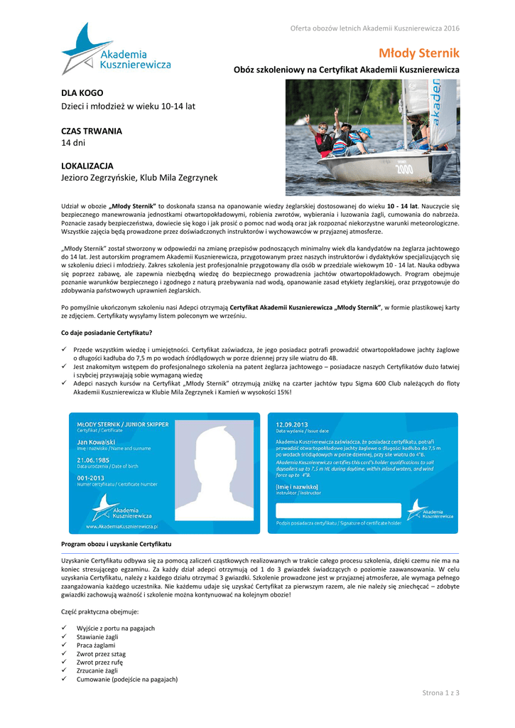 Oferta obozów letnich Akademii Kusznierewicza 2016 Młody Sternik Obóz szkoleniowy na Certyfikat Akademii Kusznierewicza DLA KOGO Dzieci i młodzież w wieku 10-14 lat CZAS TRWANIA 14 dni LOKALIZACJA Jezioro Zegrzyńskie, Klub Mila Zegrzynek Udział w obozie „Młody Sternik” to doskonała szansa na opanowanie wiedzy żeglarskiej dostosowanej do wieku 10 - 14 lat. Nauczycie się bezpiecznego manewrowania jednostkami otwartopokładowymi, robienia zwrotów, wybierania i luzowania żagli, cumowania do nabrzeża. Poznacie zasady bezpieczeństwa, dowiecie się kogo i jak prosić o pomoc nad wodą oraz jak rozpoznać niekorzystne warunki meteorologiczne. Wszystkie zajęcia będą prowadzone przez doświadczonych instruktorów i wychowawców w przyjaznej atmosferze. „Młody Sternik” został stworzony w odpowiedzi na zmianę przepisów podnoszących minimalny wiek dla kandydatów na żeglarza jachtowego do 14 lat. Jest autorskim programem Akademii Kusznierewicza, przygotowanym przez naszych instruktorów i dydaktyków specjalizujących się w szkoleniu dzieci i młodzieży. Zakres szkolenia jest profesjonalnie przygotowany dla osób w przedziale wiekowym 10 - 14 lat. Nauka odbywa się poprzez zabawę, ale zapewnia niezbędną wiedzę do bezpiecznego prowadzenia jachtów otwartopokładowych. Program obejmuje poznanie warunków bezpiecznego i zgodnego z naturą przebywania nad wodą, opanowanie zasad etykiety żeglarskiej, oraz przygotowuje do zdobywania państwowych uprawnień żeglarskich. Po pomyślnie ukończonym szkoleniu nasi Adepci otrzymają Certyfikat Akademii Kusznierewicza „Młody Sternik”, w formie plastikowej karty ze zdjęciem. Certyfikaty wysyłamy listem poleconym we wrześniu. Co daje posiadanie Certyfikatu? Przede wszystkim wiedzę i umiejętności. Certyfikat zaświadcza, że jego posiadacz potrafi prowadzić otwartopokładowe jachty żaglowe o długości kadłuba do 7,5 m po wodach śródlądowych w porze dziennej przy sile wiatru do 4B. Jest znakomitym wstępem do profesjonalnego szkolenia na patent żeglarza jachtowego – posiadacze naszych Certyfikatów dużo łatwiej i szybciej przyswajają sobie wymaganą wiedzę Adepci naszych kursów na Certyfikat „Młody Sternik” otrzymują zniżkę na czarter jachtów typu Sigma 600 Club należących do floty Akademii Kusznierewicza w Klubie Mila Zegrzynek i Kamień w wysokości 15%! Program obozu i uzyskanie Certyfikatu Uzyskanie Certyfikatu odbywa się za pomocą zaliczeń cząstkowych realizowanych w trakcie całego procesu szkolenia, dzięki czemu nie ma na koniec stresującego egzaminu. Za każdy dział adepci otrzymują od 1 do 3 gwiazdek świadczących o poziomie zaawansowania. W celu uzyskania Certyfikatu, należy z każdego działu otrzymać 3 gwiazdki. Szkolenie prowadzone jest w przyjaznej atmosferze, ale wymaga pełnego zaangażowania każdego uczestnika. Nie każdemu udaje się uzyskać Certyfikat za pierwszym razem, ale nie należy się zniechęcać – zdobyte gwiazdki zachowują ważność i szkolenie można kontynuować na kolejnym obozie! Część praktyczna obejmuje: Wyjście z portu na pagajach Stawianie żagli Praca żaglami Zwrot przez sztag Zwrot przez rufę Zrzucanie żagli Cumowanie (podejście na pagajach) Strona 1 z 3 Oferta obozów letnich Akademii Kusznierewicza 2016 Klar Dowodzenie załogą Praca w charakterze członka załogi Umiejętność wiązania węzłów (płaski, ósemka, knagowy, ratowniczy na sobie i w ręku, wyblinka, cumowniczy żeglarski, szotowy, buchta) W zakres teorii wchodzą podstawy: Budowy jachtów Przepisów Teorii żeglowania Locji Meteorologii (prognozy pogody, przewidywanie zmiany warunków na niekorzystne) Ratownictwa (w tym umiejętność wzywania pomocy) Etykieta żeglarska (zachowanie na jachcie) A poza szkoleniem: Gry zespołowe Aquapark (Warszawianka w Jachrance lub Aquapark Fala w Stanisławowie Pierwszym) Park linowy Ogniska i animacje Zakwaterowanie Klub Mila Zegrzynek w Jadwisinie k/Serocka nad Jeziorem Zegrzyńskim, położony 30 km od Centrum Warszawy. To bezpieczne, kameralne, pełne uroku, posiadające znakomity mikroklimat, a jednocześnie tętniące życiem miejsce. Cisza, las, jezioro, z dala od codziennego zgiełku, zapewnia zaskakujący spokój, jak na tak niewielką odległość od miasta. Pokoje 2, 3 i 4 osobowe z łazienkami urządzone są w stylu kajut na klasycznym żaglowcu. Nowoczesne i funkcjonalne. Mieszkając w nich, uczestnicy naszych obozów mają szansę poczuć atmosferę prawdziwego rejsu – zasypiają i budzą się na statku. Wyżywienie Trzy posiłki dziennie, serwowane w restauracji Klubu Mila - obiad w formie bufetu (za wyjątkiem wypraw survivalowych). Woda pitna nieograniczona ilość, dostępna dla uczestników obozu przez cały dzień. Terminy i ceny Kod imprezy OKPZ1 Termin 26.06 - 09.07 Cena 2 799 zł OKPZ2 10.07 - 23.07 2 699 zł OKPZ3 24.07 - 06.08 2 699 zł OKPZ4 07.08 – 20.08 2 599 zł Dojazd Własny. Przyjazd pierwszego dnia od godz. 16:00 do 18:00, wyjazd ostatniego dnia od 10:00 do 11:00. Autokar. Wyjazd z Cena Katowice, Częstochowa, Piotrków Trybunalski 150 zł Warszawa 50 zł Szczegółowe informacje dotyczące przejazdu podane są w dokumencie: Regulamin dojazdu Akademii Kusznierewicza. Co ze sobą zabrać? Latarka (najlepiej czołowa), strój kąpielowy, strój sportowy, strój do zajęć w terenie (dresy, bluzy), przybory do mycia, 2 ręczniki (w tym jeden plażowy) kurtka przeciwdeszczowa (najlepiej sztormiak), pełne obuwie z miękką podeszwą (2 pary), nakrycie głowy, okulary przeciwsłoneczne, krem z filtrem, spray na komary, bidon na wodę, zdjęcie do Certyfikatu o wymiarach 3,5 x 4,5 cm. Świadczenia w cenie Żeglowanie na jachtach Sigma 600 Club, zakwaterowanie w Klubie Mila w Zegrzynku (13 noclegów), pełne wyżywienie, opieka wykwalifikowanej kadry, realizacja programu, ubezpieczenie NNW uczestnika w wysokości 10 000 zł. Strona 2 z 3 Oferta obozów letnich Akademii Kusznierewicza 2016 Jacht